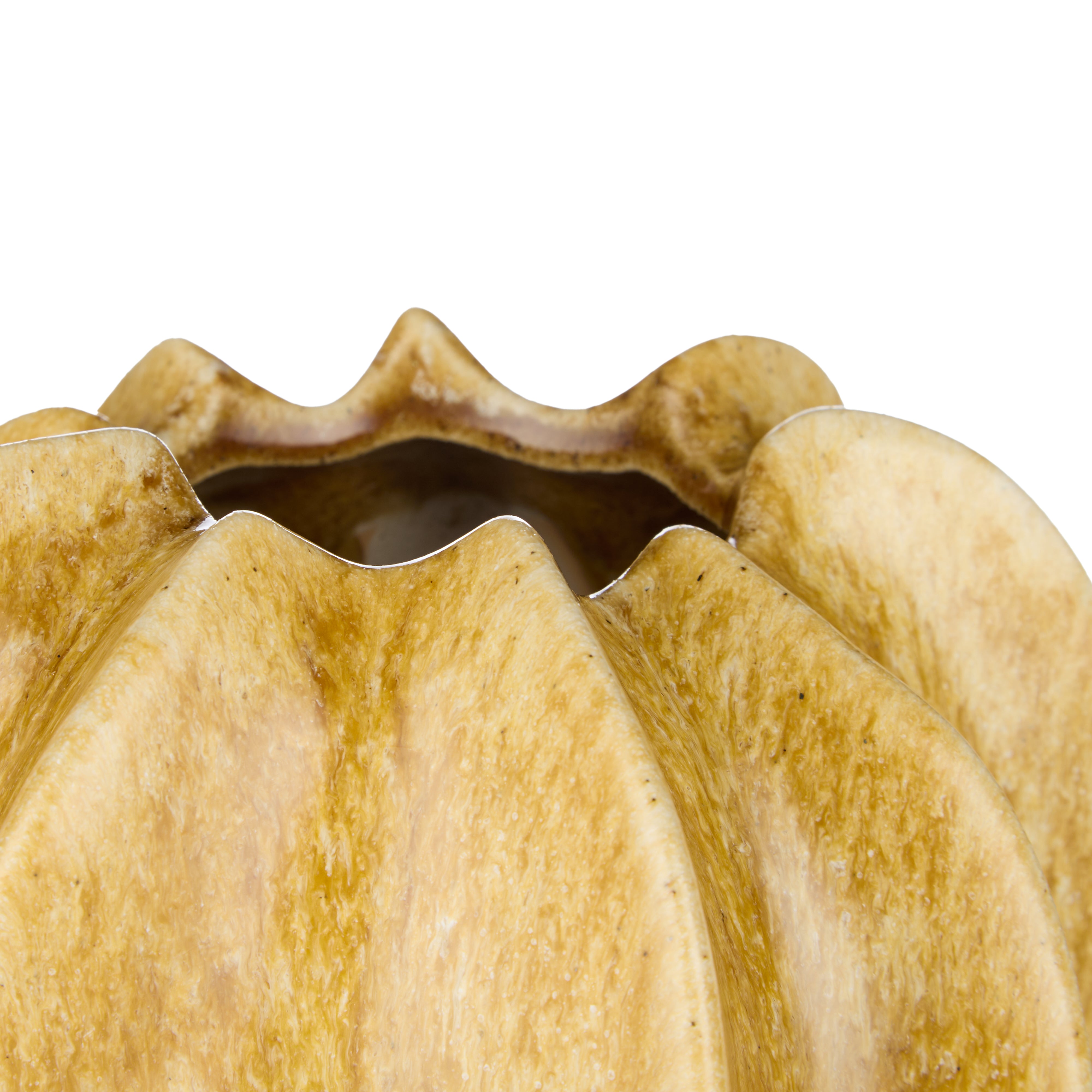 The Albany Ceramic Vase features an abstract ridged design with an organic form, finished in a unique yellow-green hue. Its artistic shape and subtle colour make it a striking accent for any space.