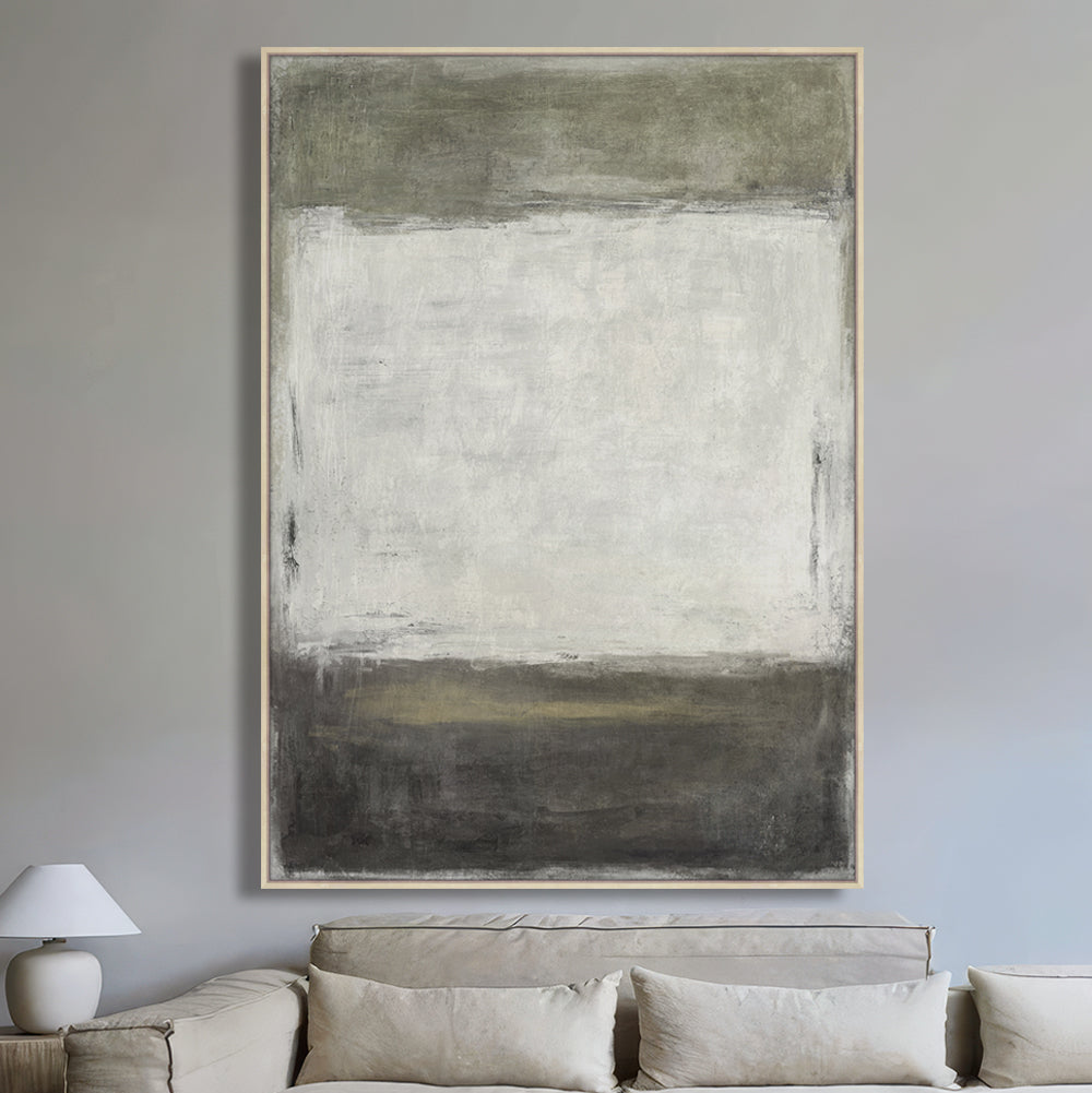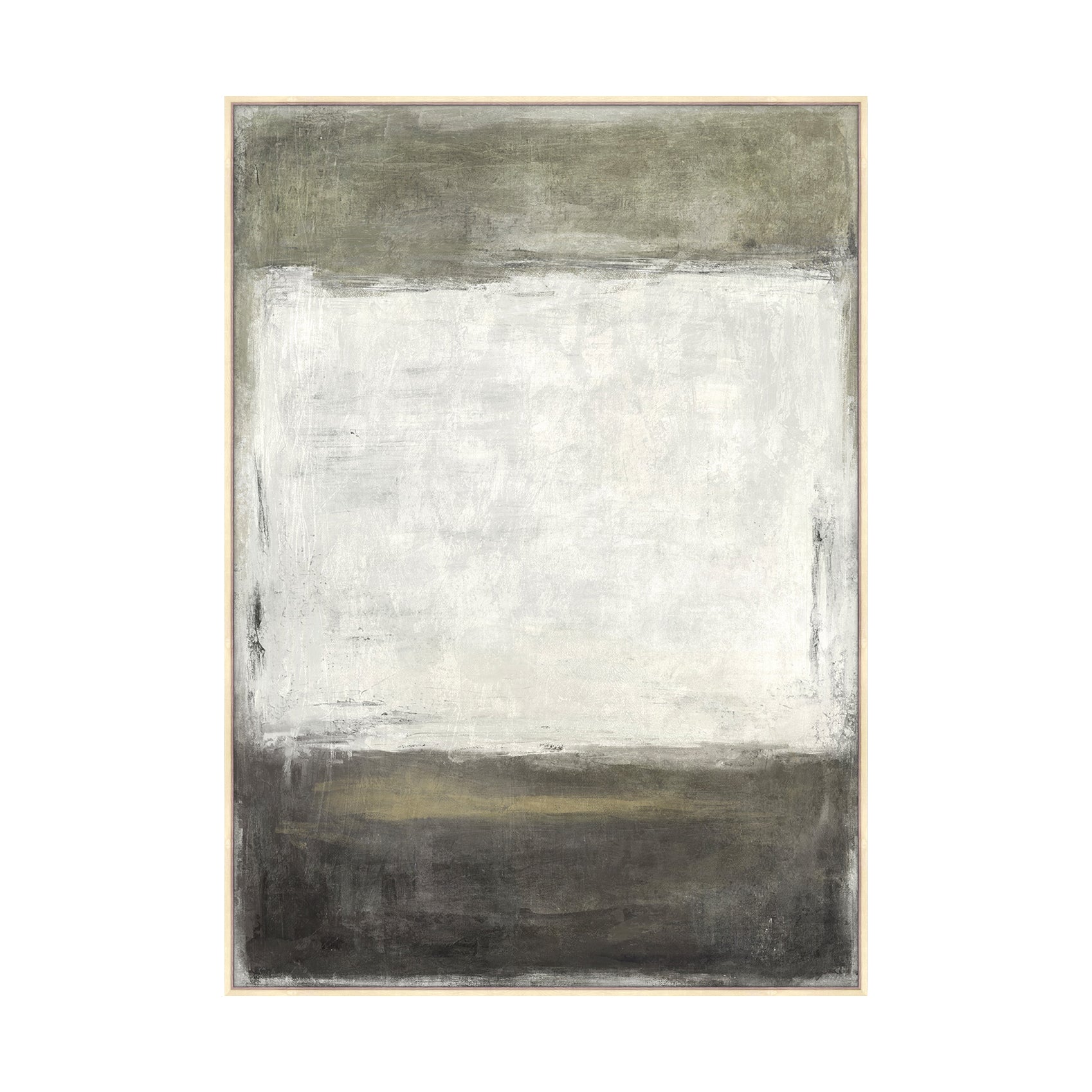Elevate your space with this striking abstract canvas art featuring a harmonious blend of greens, whites, and greys. The contemporary design showcases modernist aesthetics with clean lines and thoughtful composition, perfect for adding visual interest to any room. Framed in natural wood, this piece combines artistic sophistication with understated elegance, making it an ideal focal point for minimalist and modern interiors.