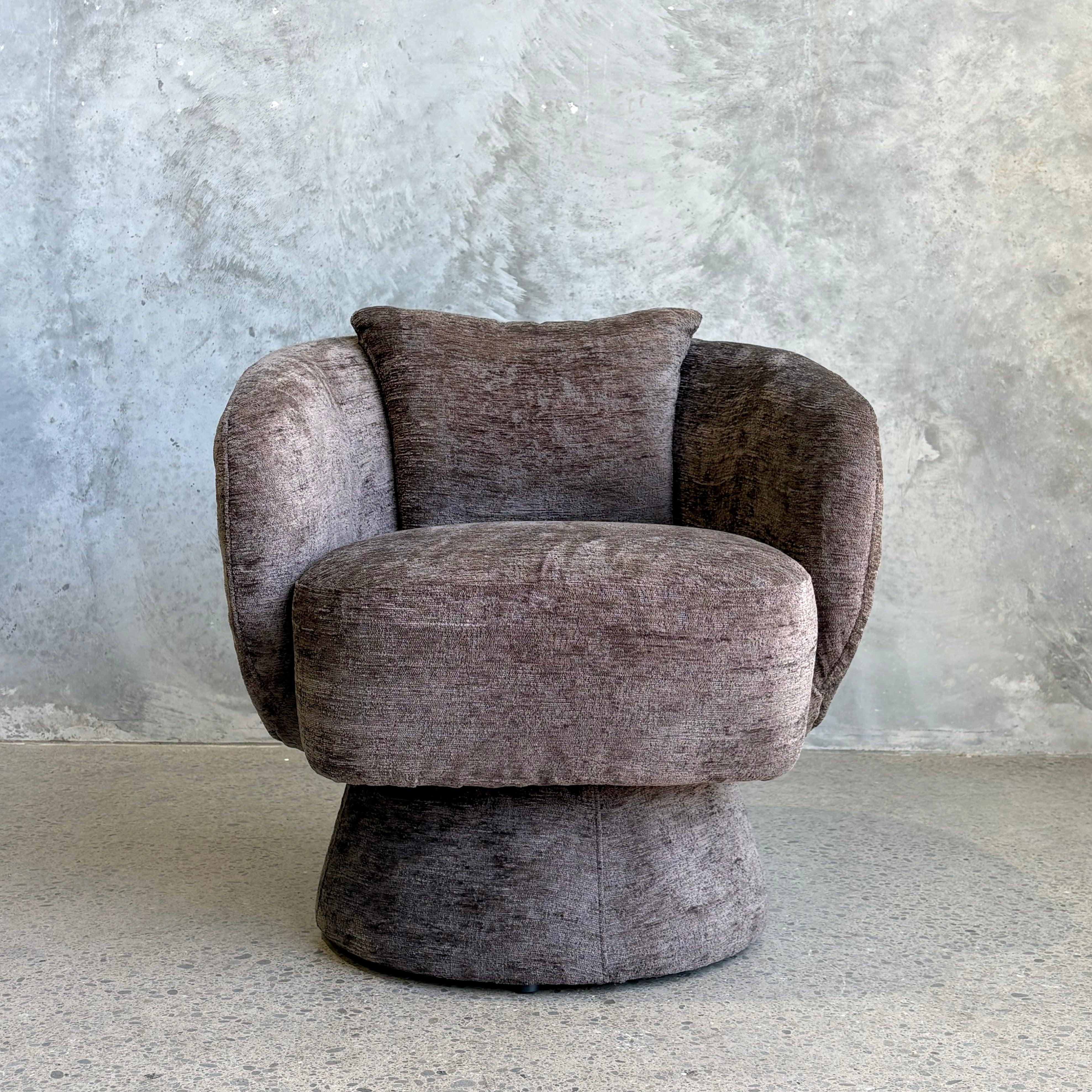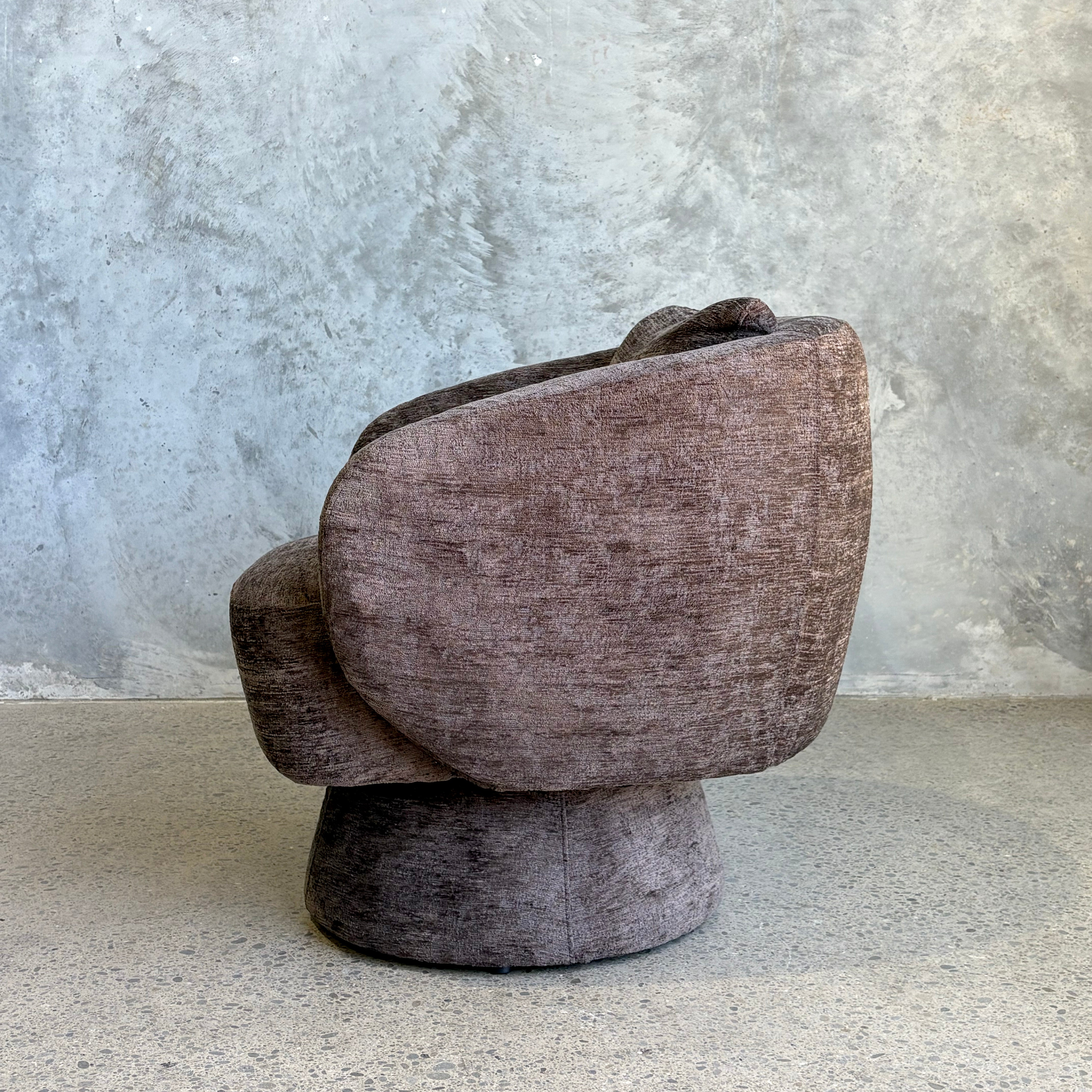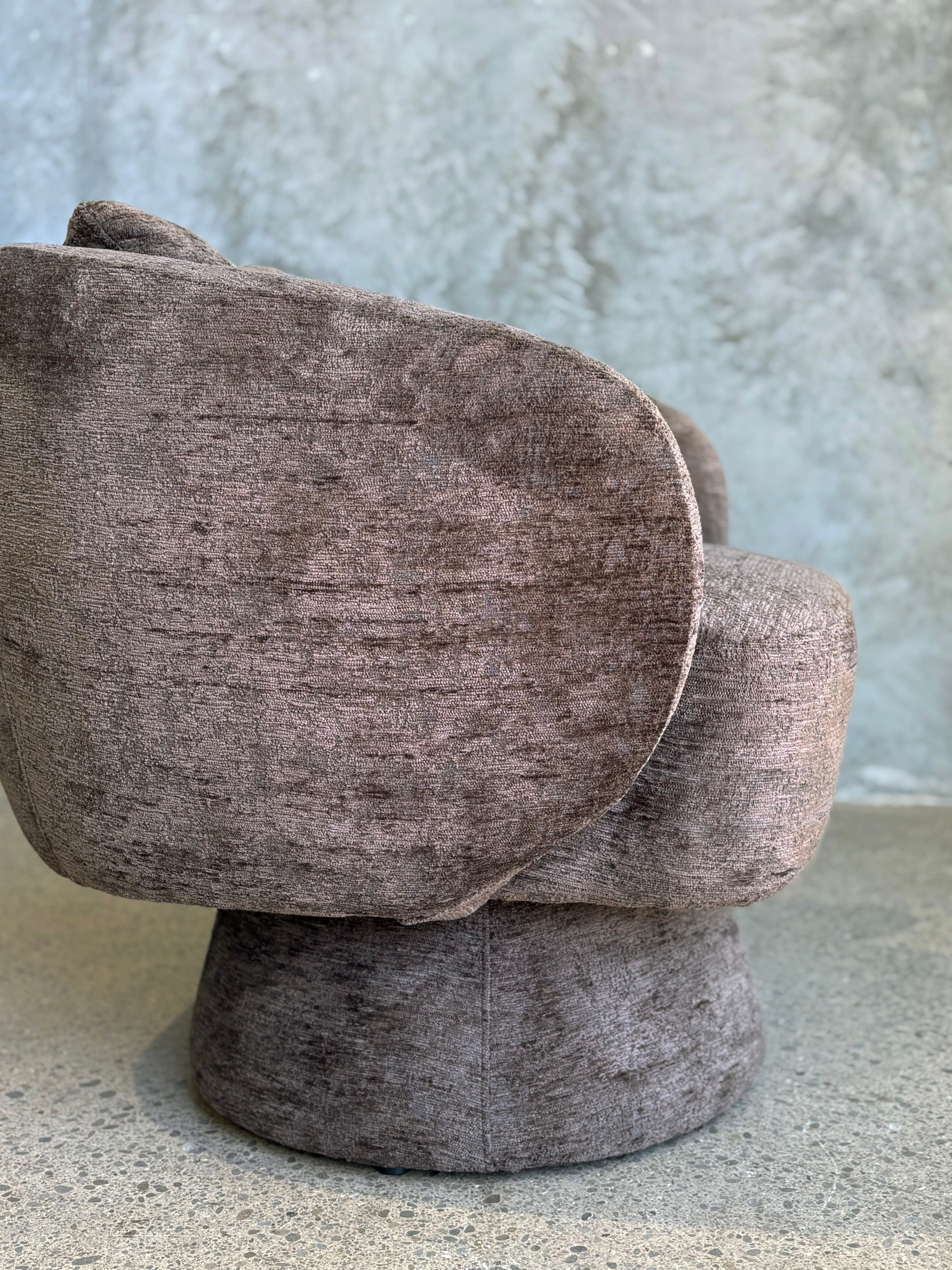 Petite perfection – introducing the Allie Swivel Chair. Taking inspiration from art deco and mid-century design, Allie features a modern curved silhouette with plump padded upholstery, finished in a luxurious textured heavy chenille in a chic cool-toned brown.