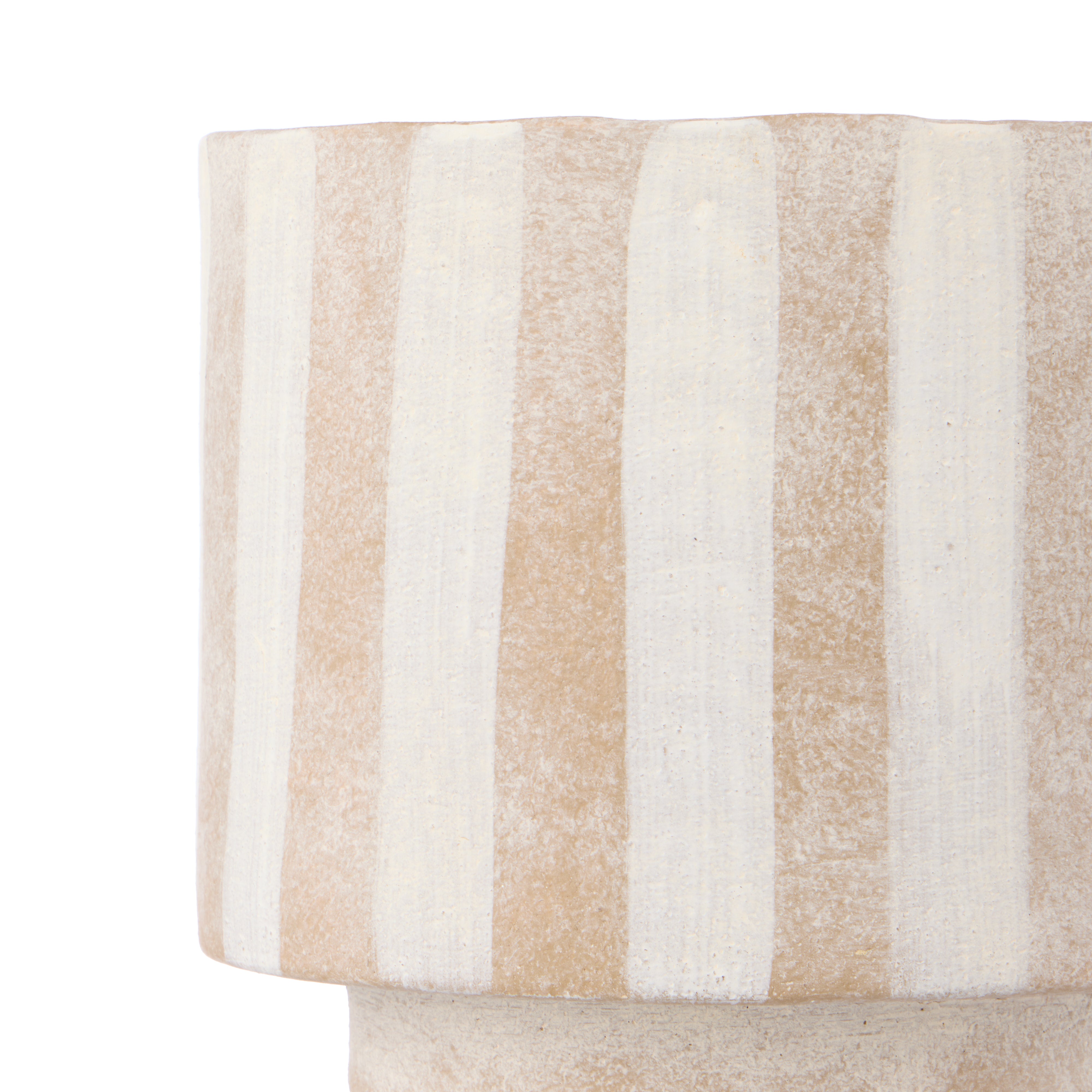 This Antibes Pot is made from stoneware with a rustic taupe and white striped finish. The elegant hand finished silhouette makes a brilliant focal point when paired with any of our floral arrangements.