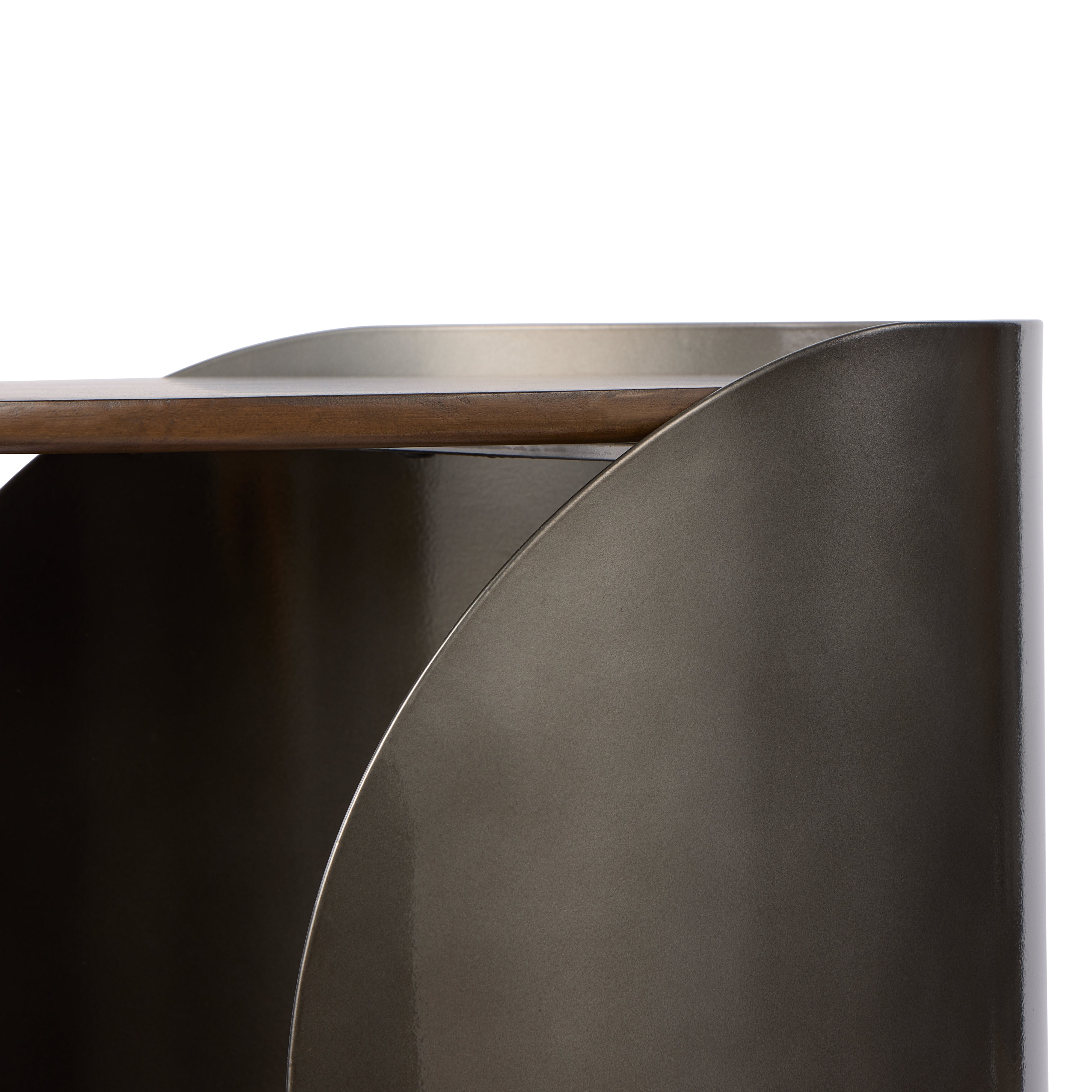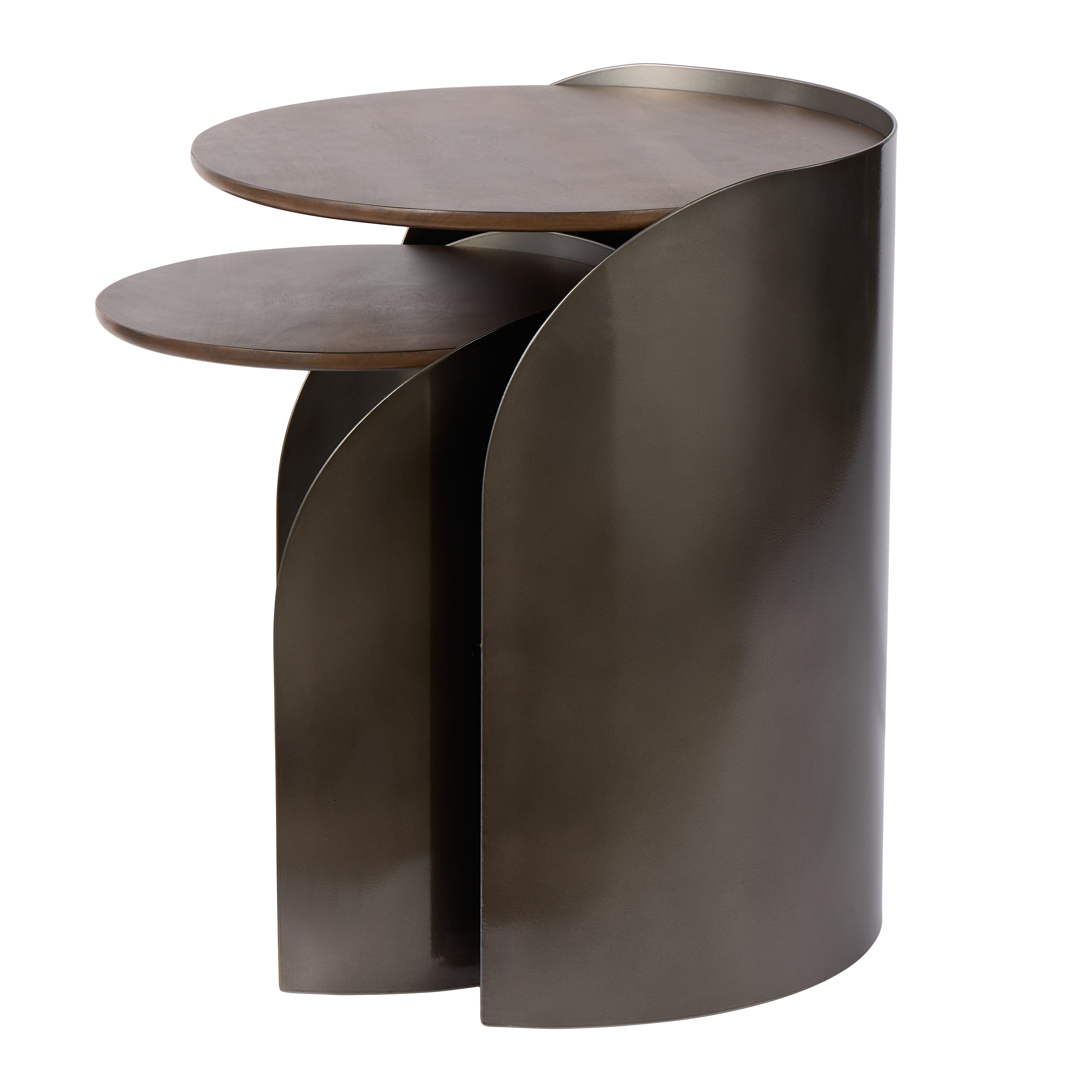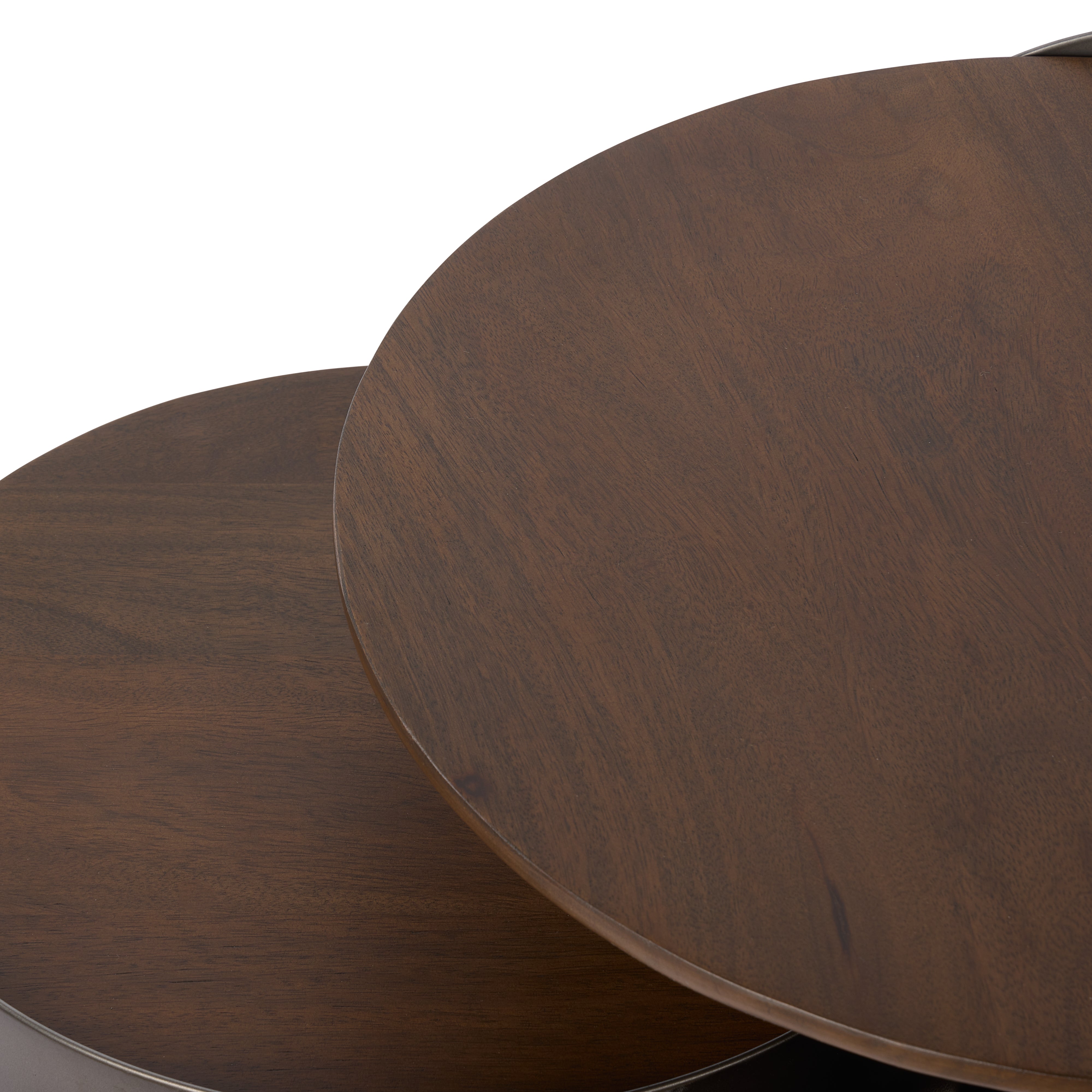 The Asher Nesting Side Table Set features a mango wood top in rich walnut finish paired with antique steel base, offering a contemporary industrial feel. Their rounded design adds elegance and versatility, perfect for placing beside your armchair or couch to enhance your living space with subtle style and functional surface area.