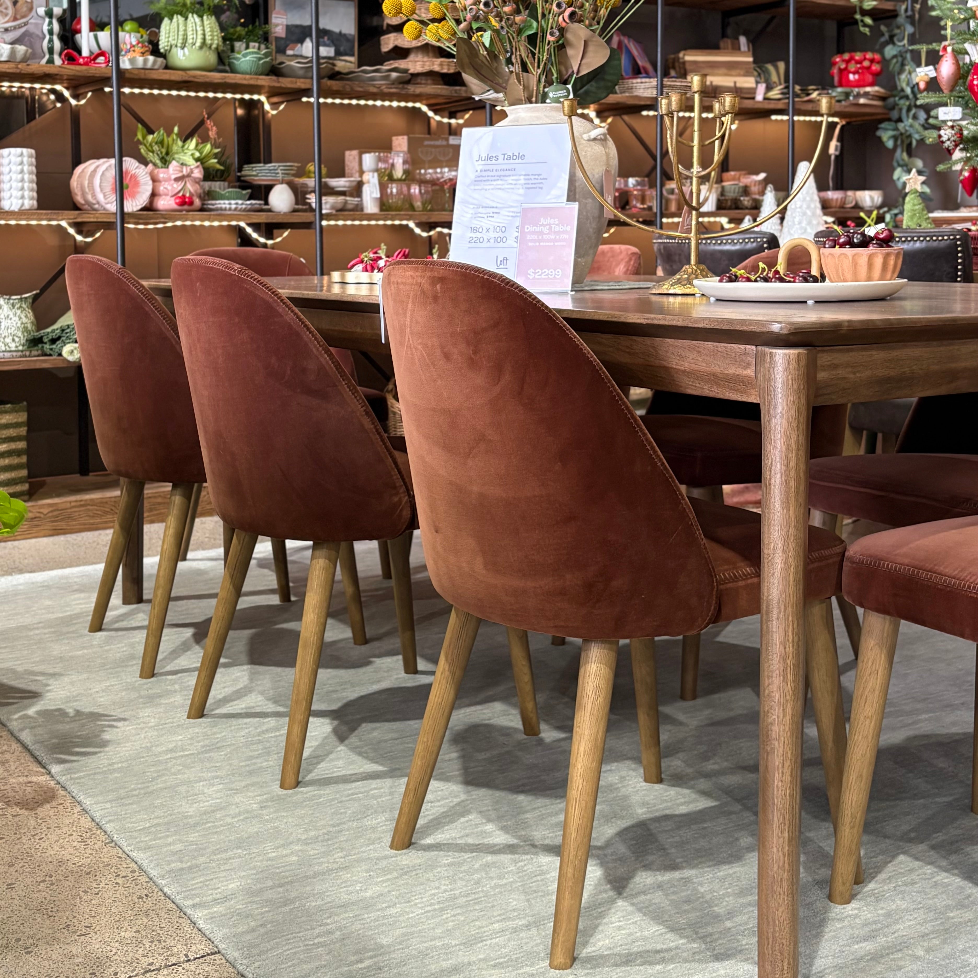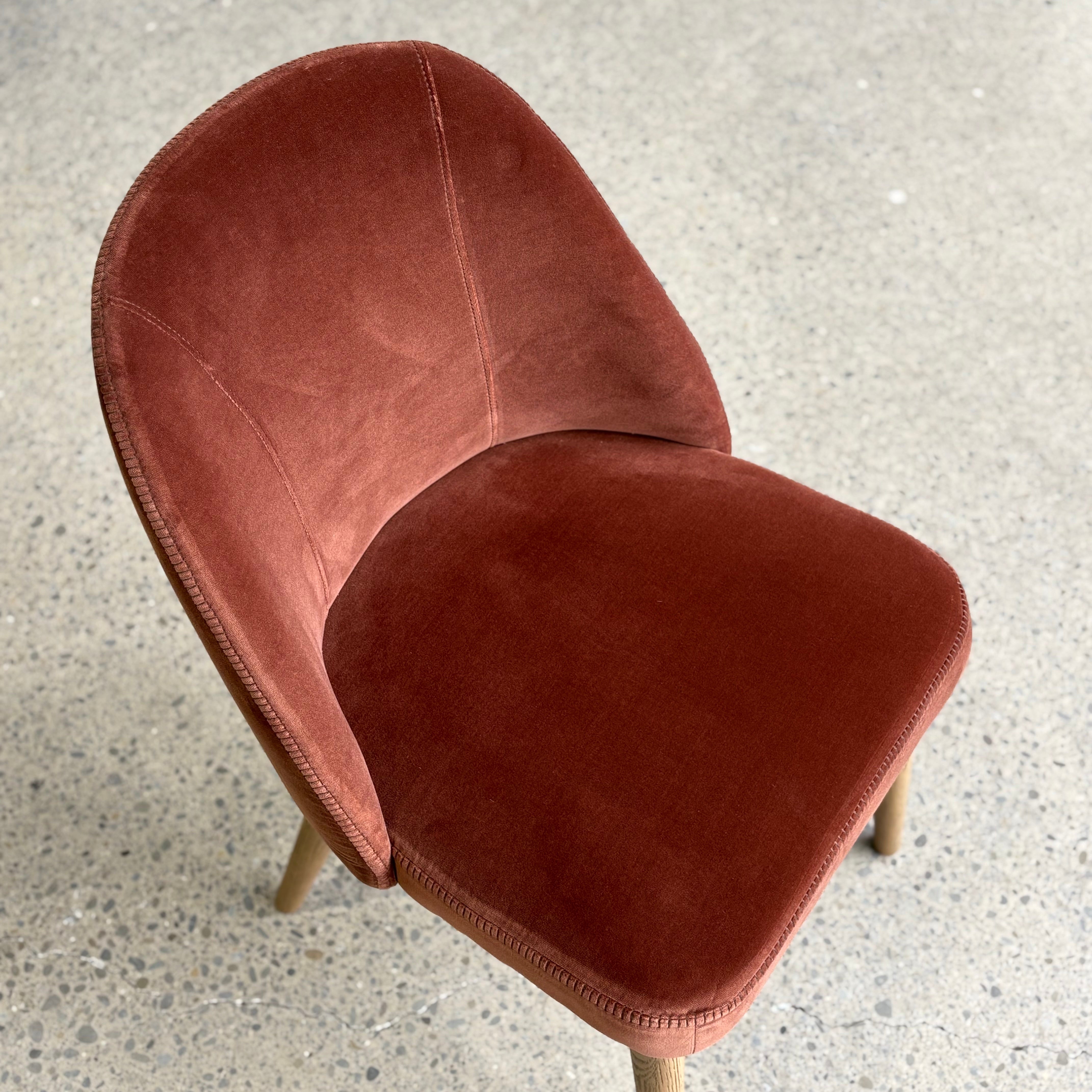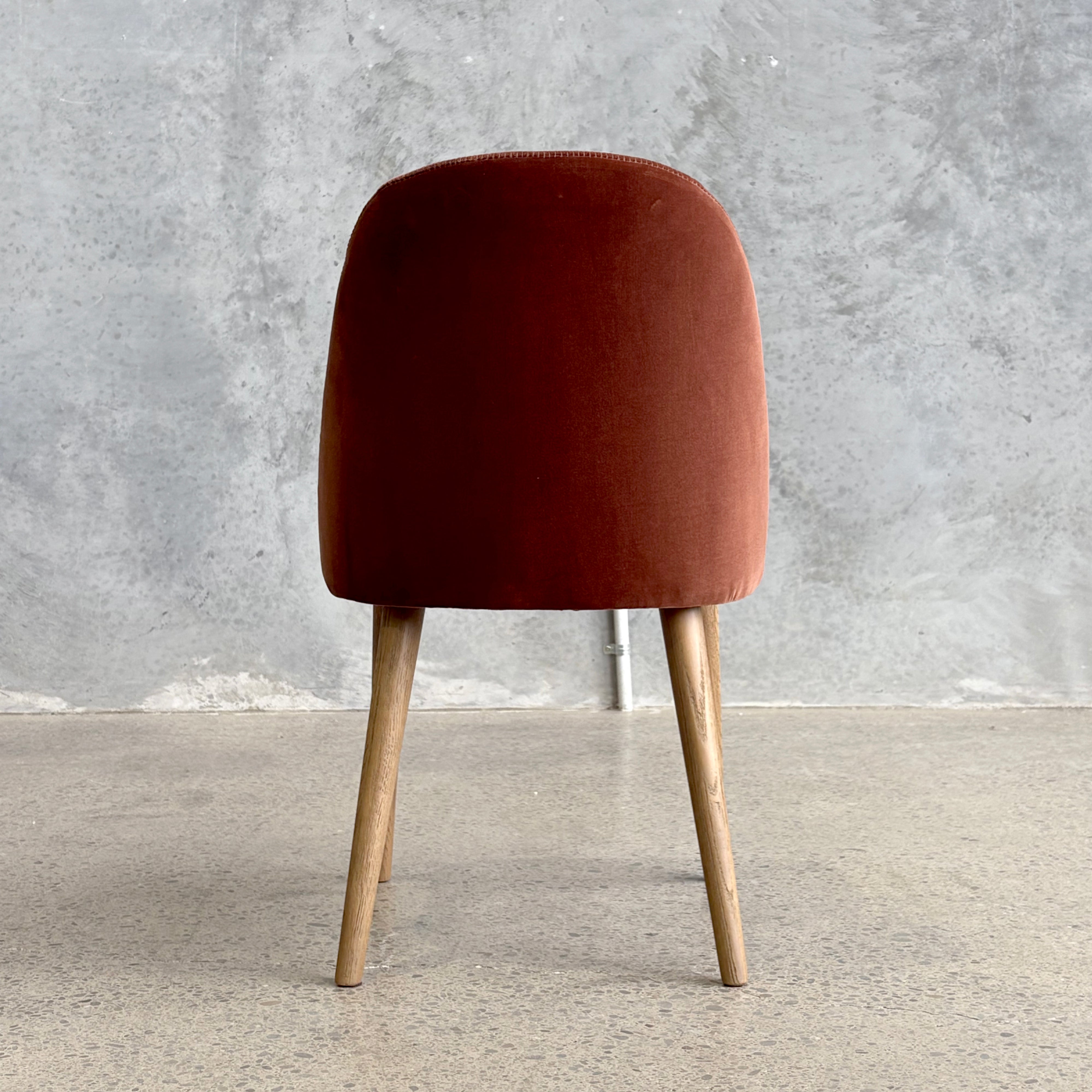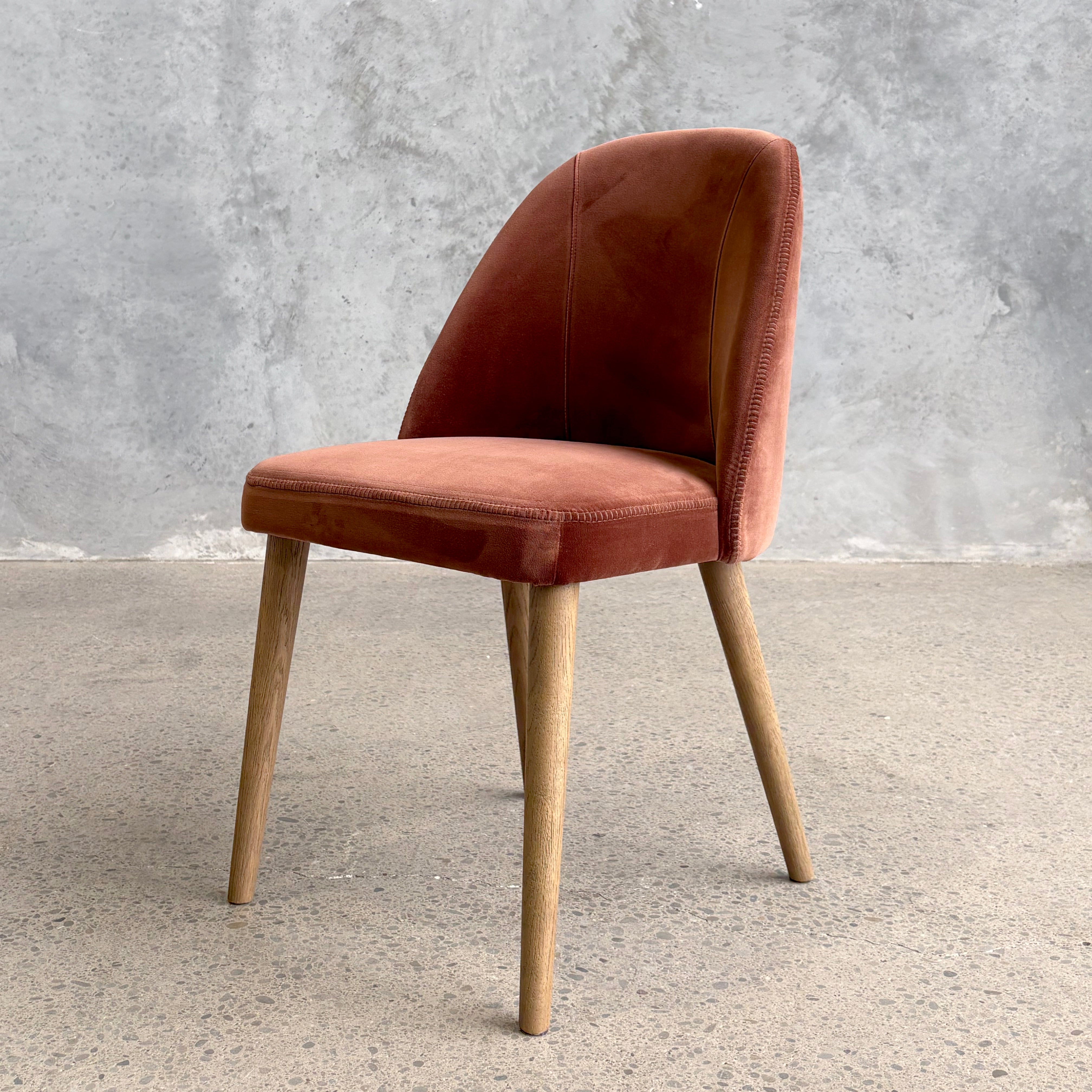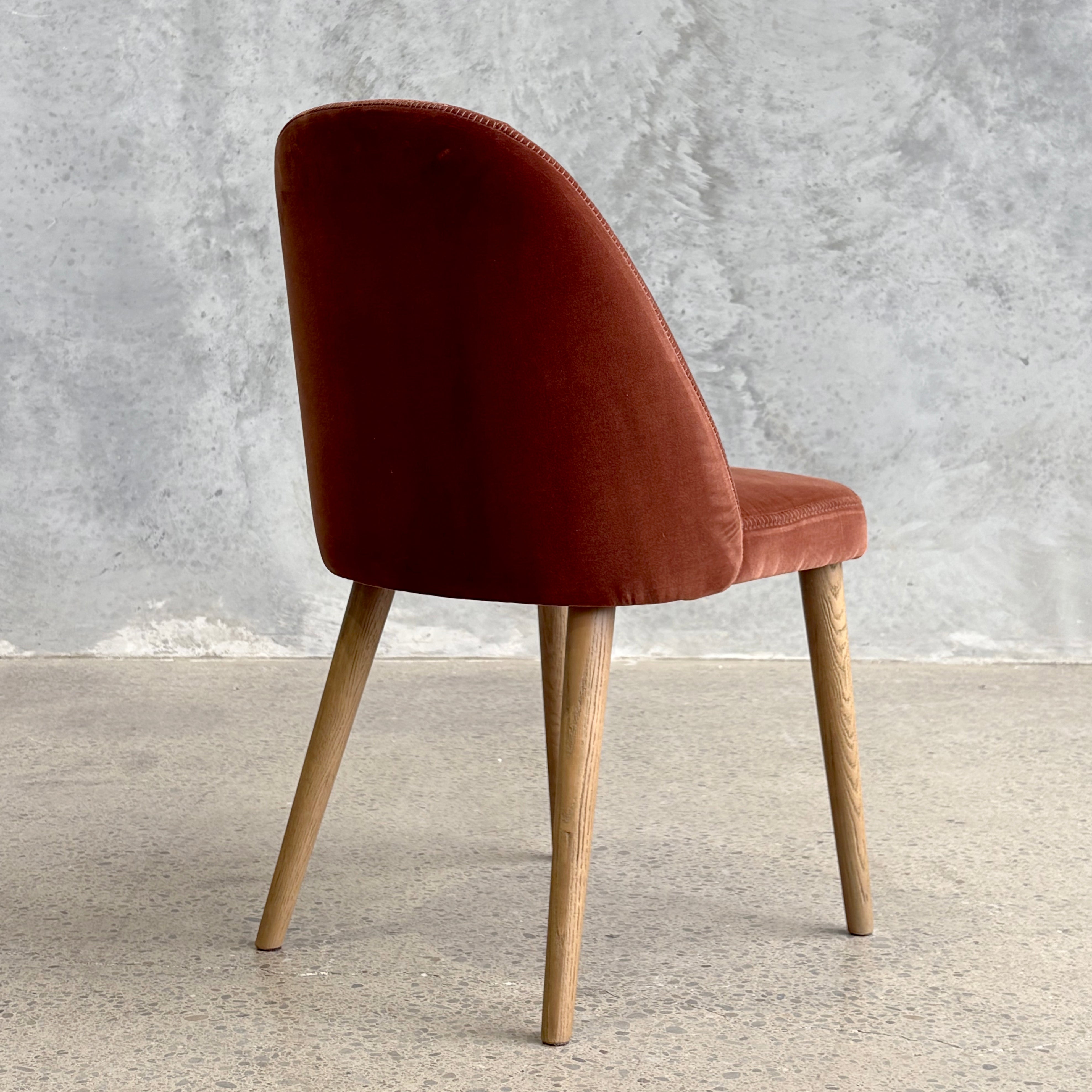 Classic shape, chic fabric finish, rounded ash leg - our Austin Dining Chair serves style and comfort, upholstered in a rich red-brown cinnamon velvet fabric to add a hint of elegance to any dining space. A comfortable padded seat and rounded back make the Austin a comfy dining chair option that you’ll truly enjoy sitting in!