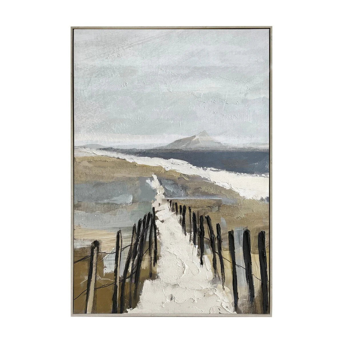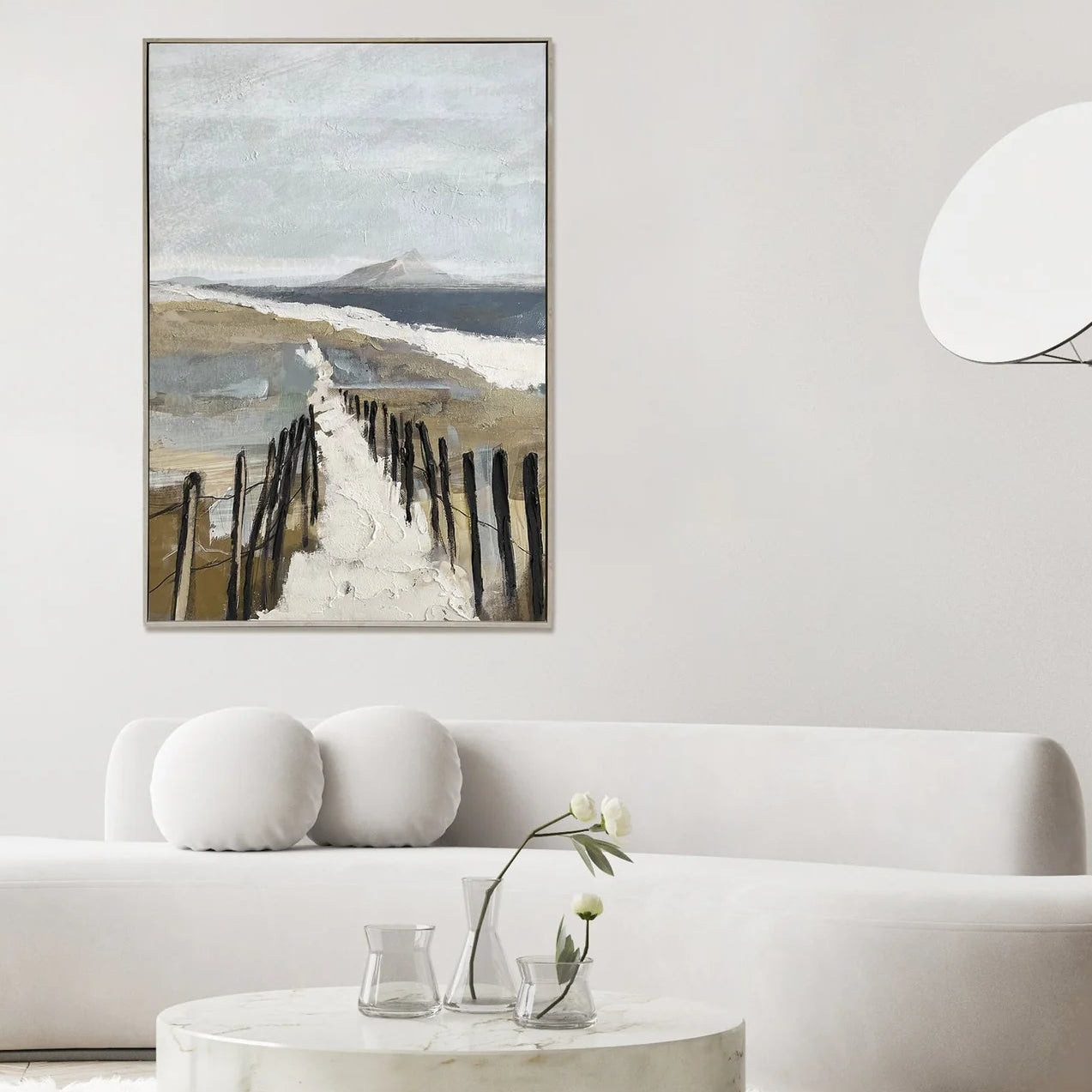Transform your space with this stunning framed canvas art capturing a serene coastal walkway. Rendered in soothing neutral tones - soft blues, sage, sand, and beige - the piece evokes the warmth of a beachside stroll toward the ocean horizon. At 80x120cm, this refined artwork brings effortless coastal elegance to any room, creating a calming focal point that whispers of seaside tranquility and timeless charm.