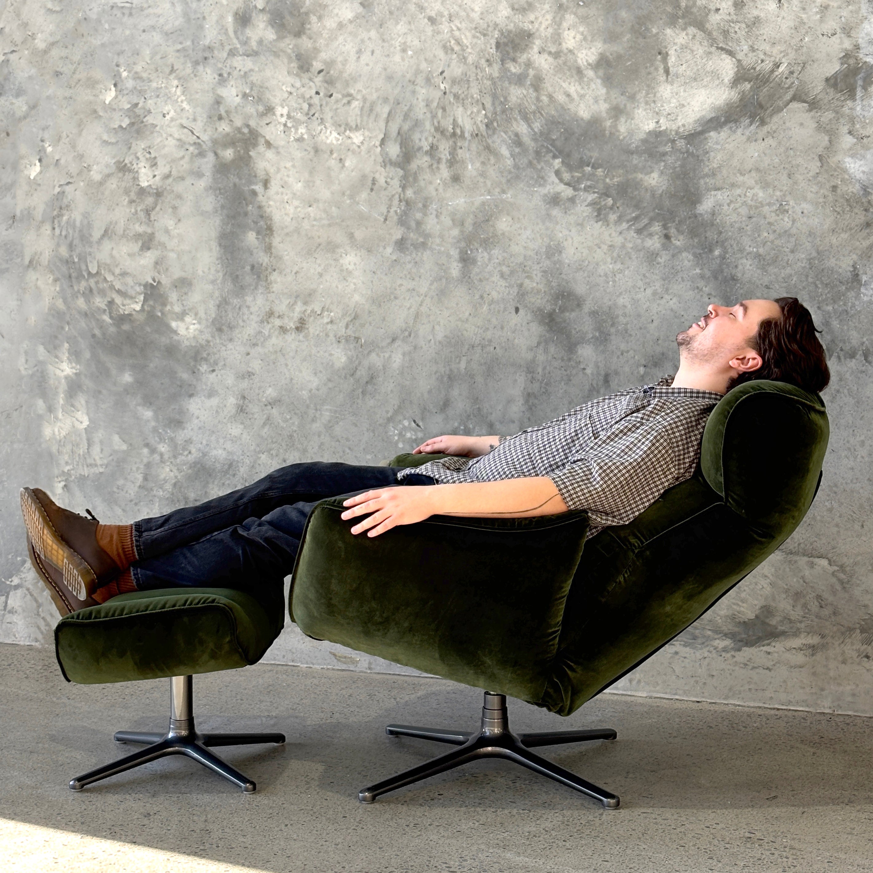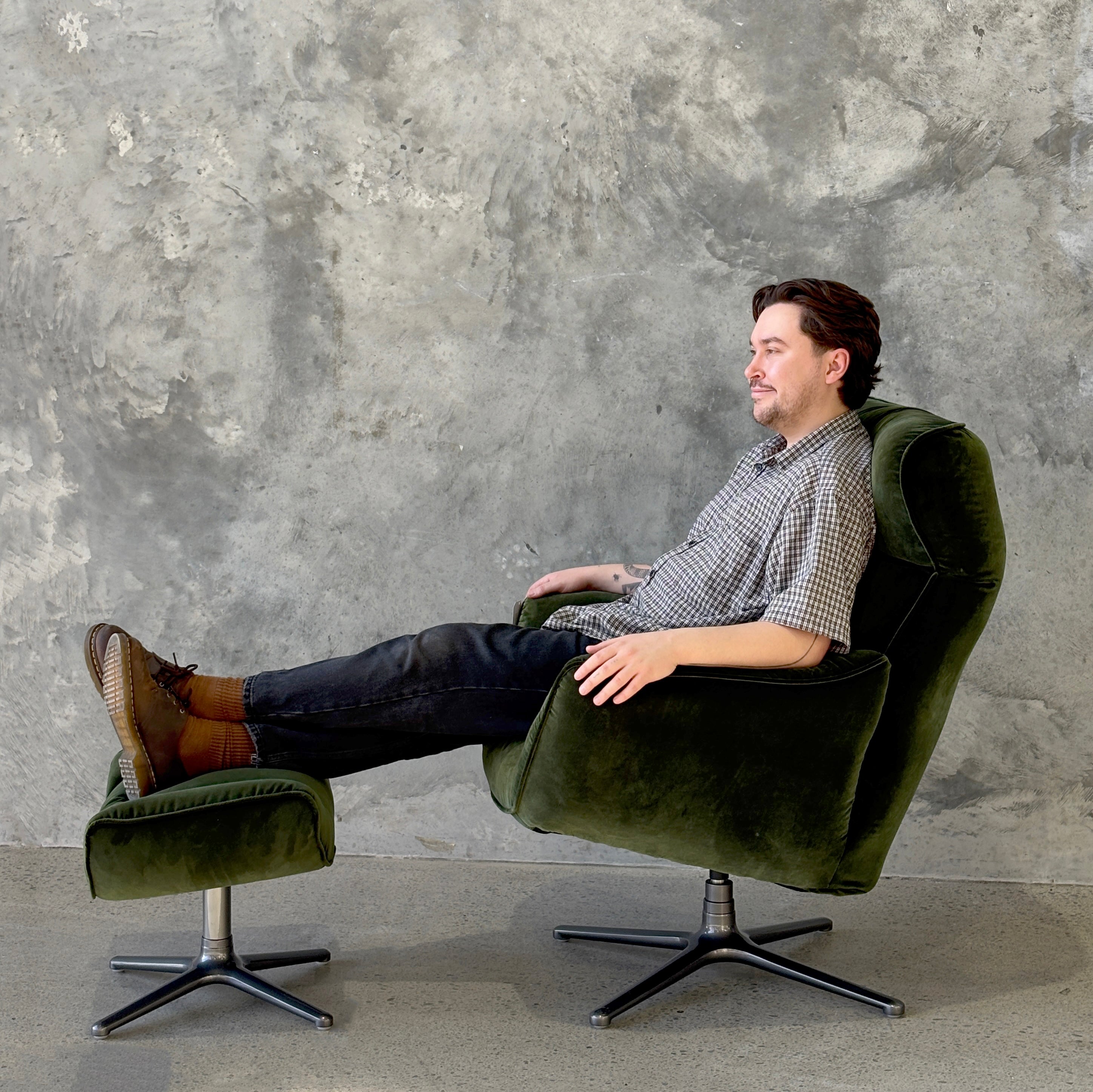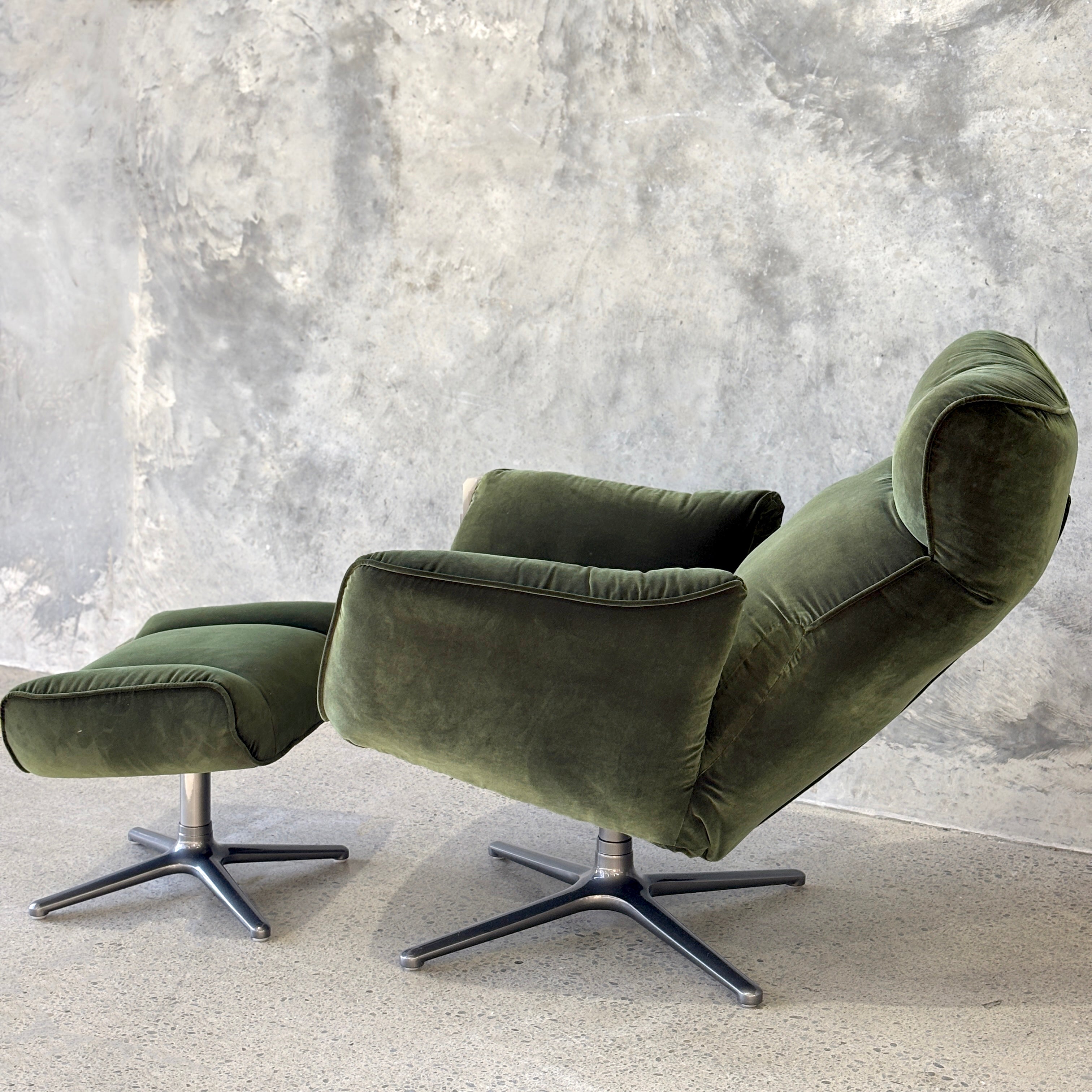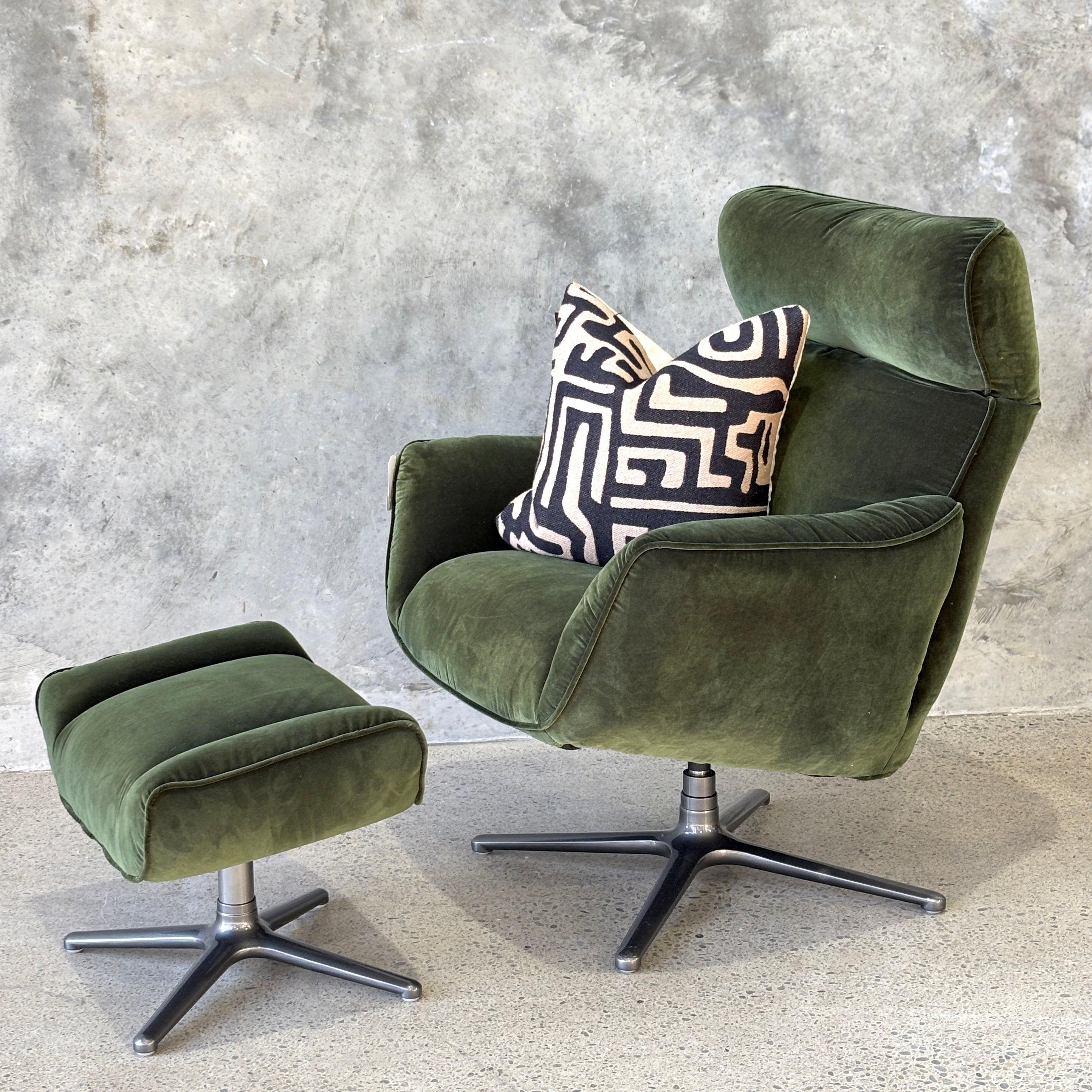 Introducing the Carlos Swivel Recliner Chair, a stunning statement chair that is oh so comfortable. This functional beauty has an adjustable head rest, a subtle lever that will gently recline you back and a swivel base. Made with high grade cushioning to create that sink-in feeling, and upholstered in a polyester velvet for durability and comfort. Pop your feet up on the ottoman, recline back and enjoy this stylish, yet practical seating option.