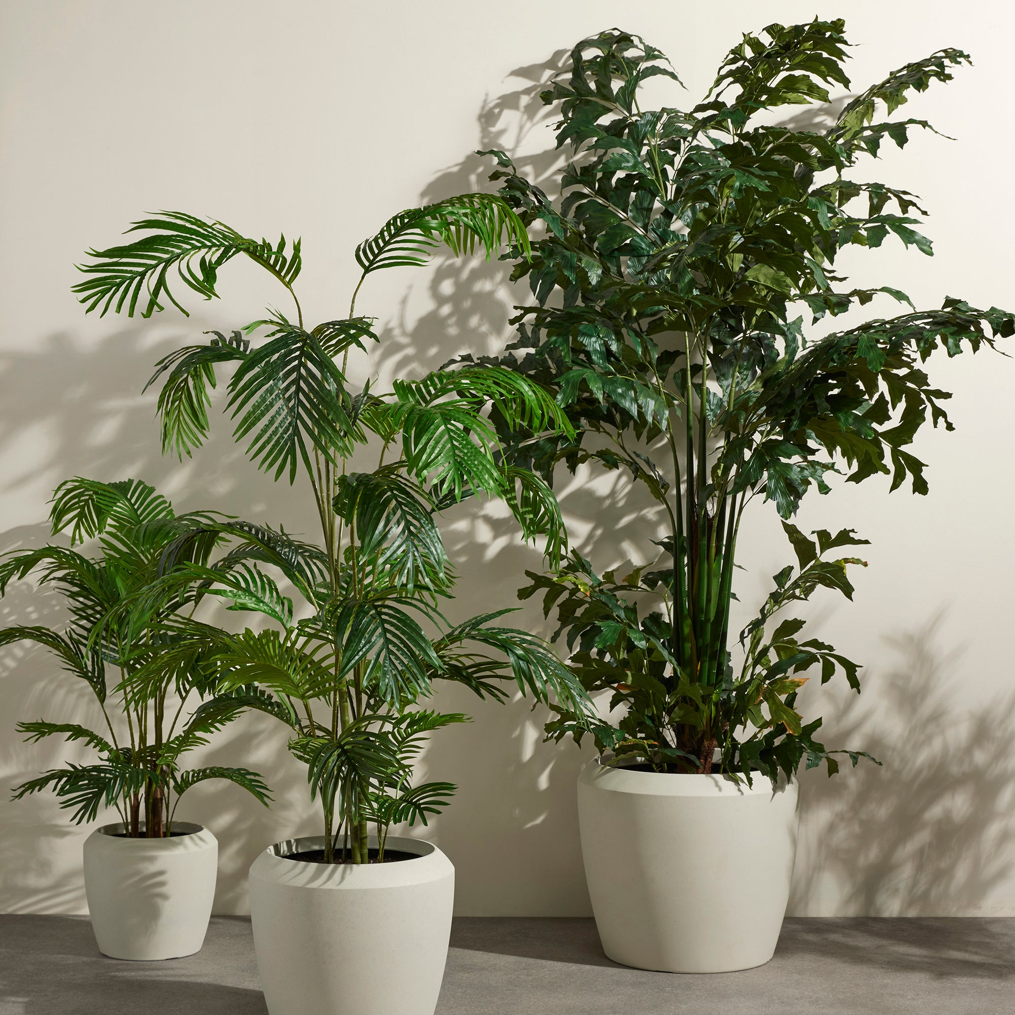The Caryota Potted Palm Tree, designed and handcrafted in Melbourne, features realistic green palm leaves, sturdy stems, and faux soil for authentic detail. Set in a smooth white planter, it adds a fresh, natural touch to any room without the upkeep of a live plant. Ideal for effortless style and lasting greenery in your home.