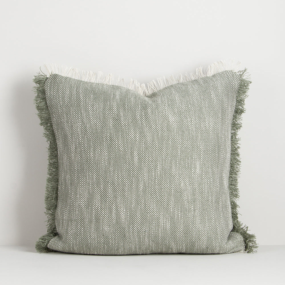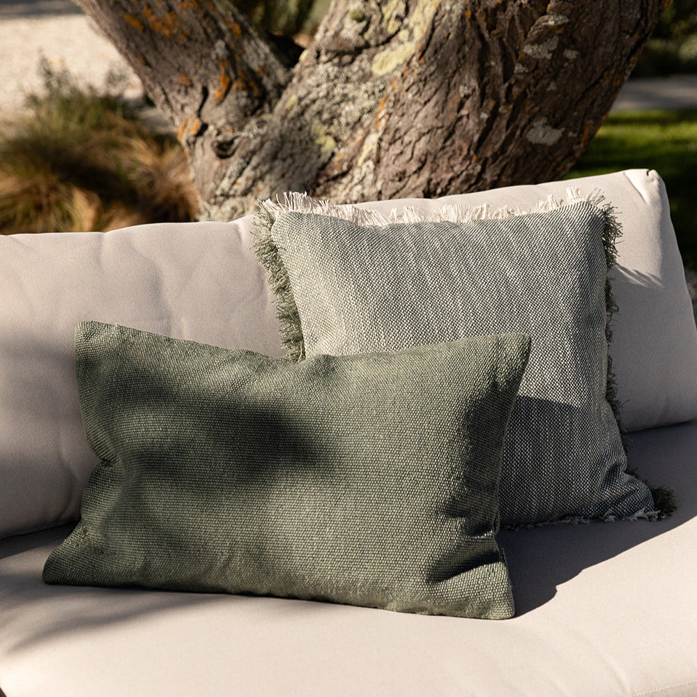 Add visual interest and dimension to outdoor settings with the relaxed design of the Caspian Cushion. Featuring soft eucalyptus and ivory tones, the simple weave and two-tone fringing provides a simple, textural aesthetic for contemporary living spaces. Handwoven from soft PET yarn, this versatile piece works just as well styled indoors, especially in areas exposed to sunlight.