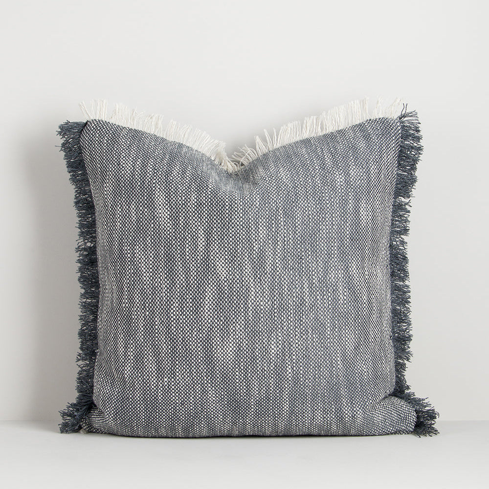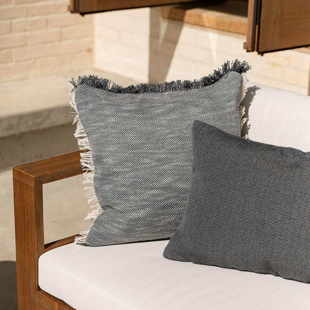 Add visual interest and dimension to outdoor settings with the relaxed design of the Caspian Cushion. Featuring steel-blue and ivory tones, the simple weave and two-tone fringing provides a simple, textural aesthetic for contemporary living spaces. Handwoven from soft PET yarn, this versatile piece works just as well styled indoors, especially in areas exposed to sunlight.
