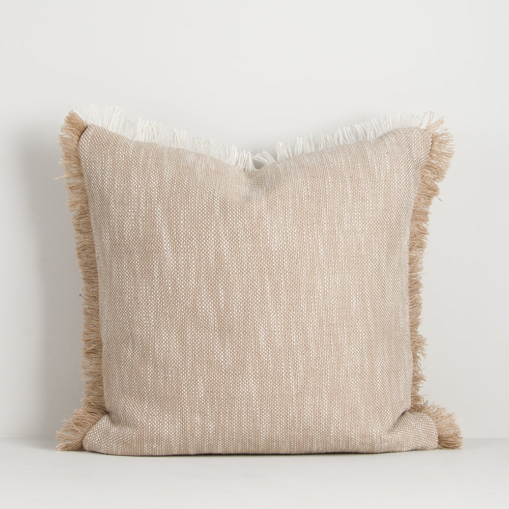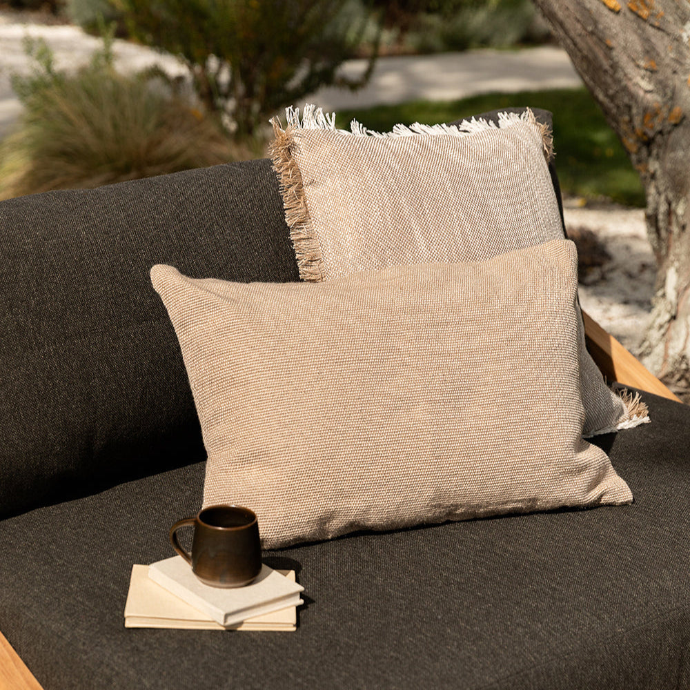 Add visual interest and dimension to outdoor settings with the relaxed design of the Caspian Cushion. Featuring soft almond and ivory tones, the simple weave and two-tone fringing provides a simple, textural aesthetic for contemporary living spaces. Handwoven from soft PET yarn, this versatile piece works just as well styled indoors, especially in areas exposed to sunlight.