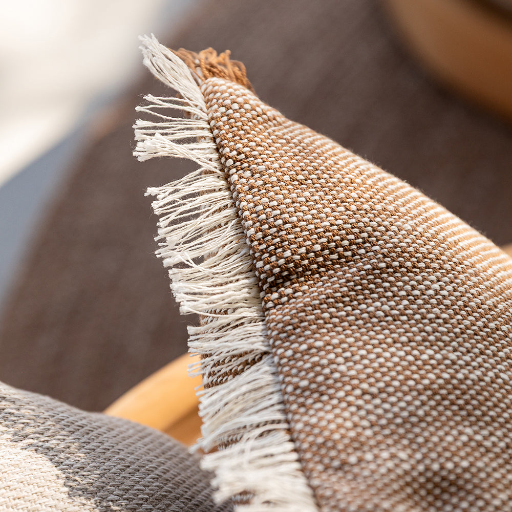 Add visual interest and dimension to outdoor settings with the relaxed design of the Caspian Cushion. Featuring warm tobacco and ivory tones, the simple weave and two-tone fringing provides a simple, textural aesthetic for contemporary living spaces. Handwoven from soft PET yarn, this versatile piece works just as well styled indoors, especially in areas exposed to sunlight.