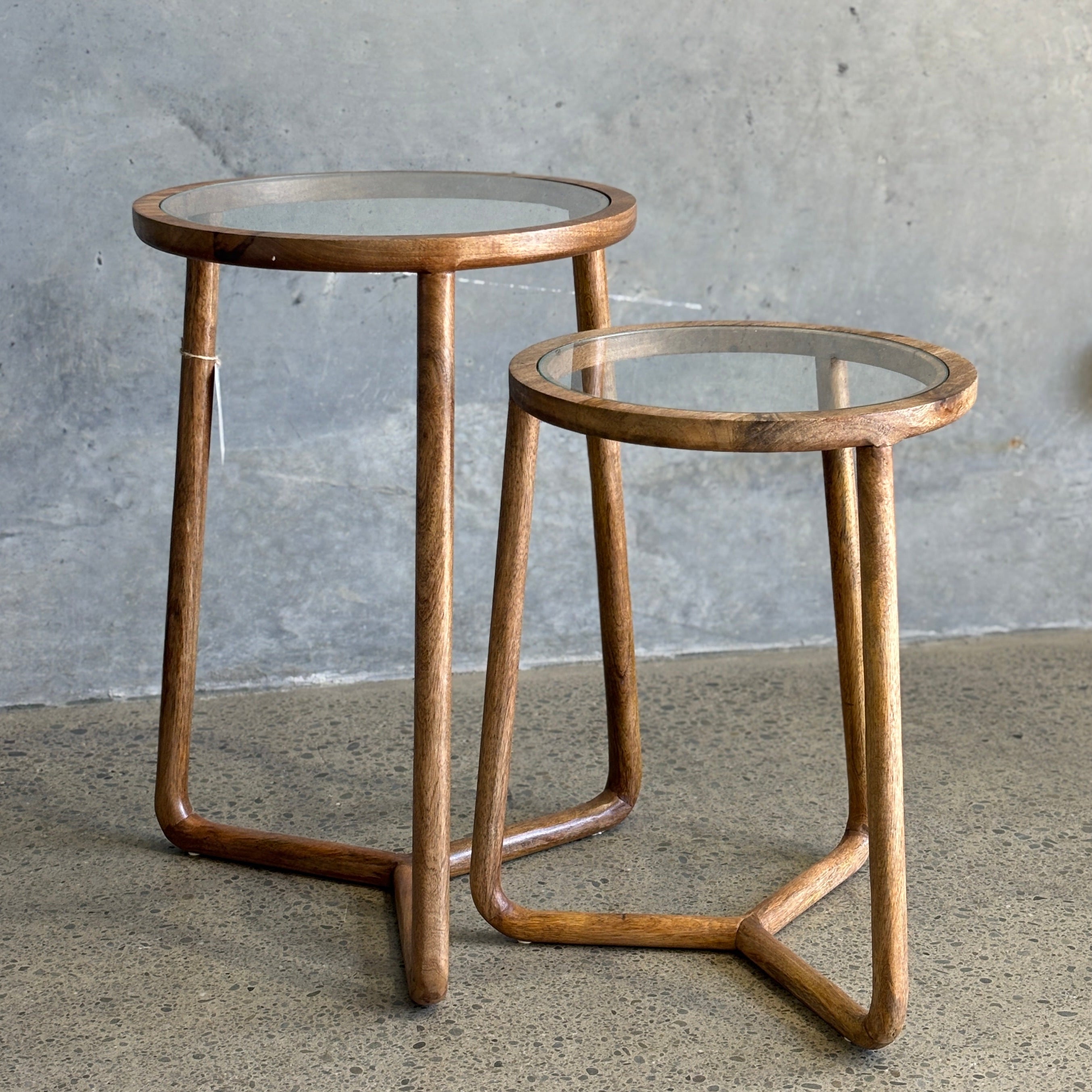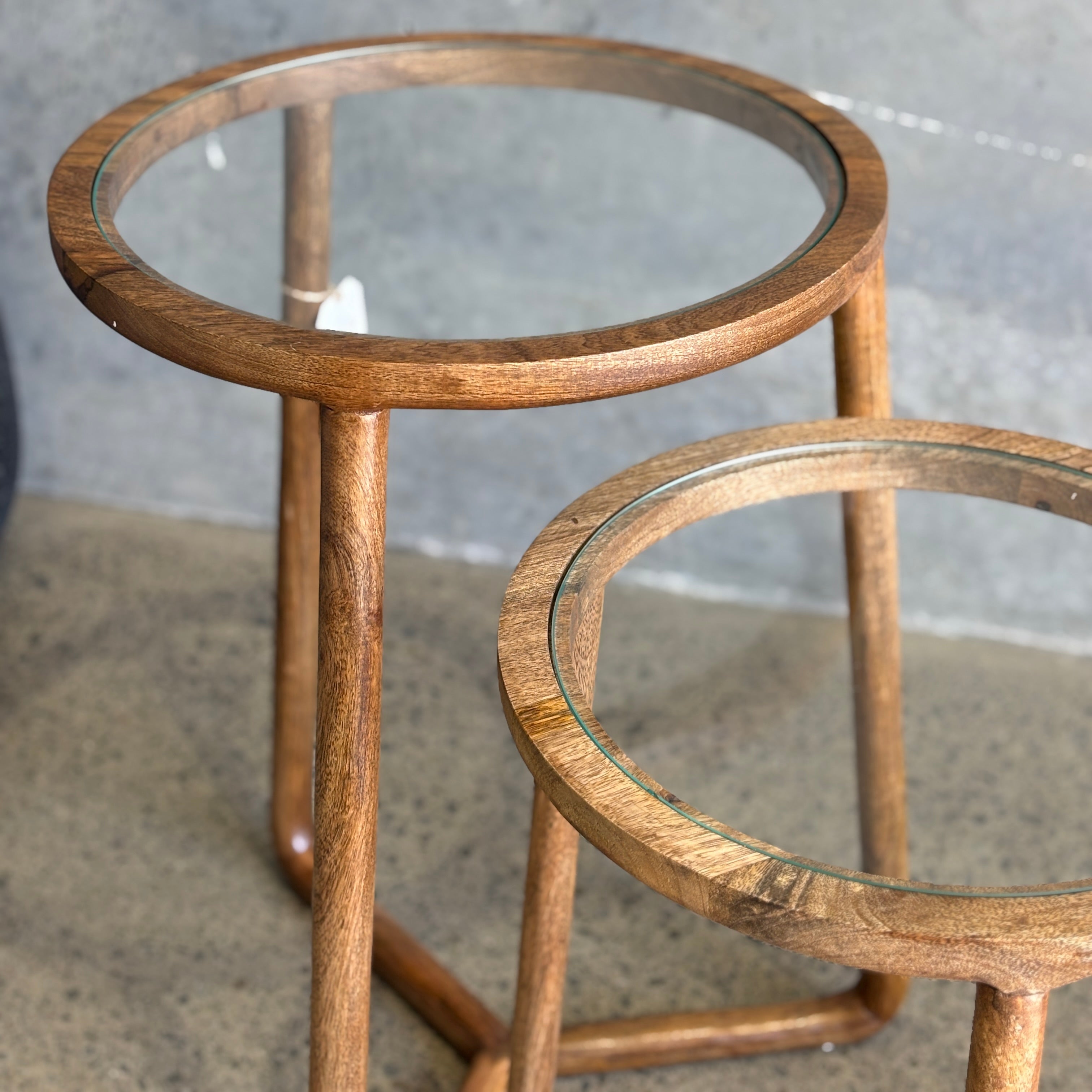 The set of two Castello Side Tables combines sleek glass with wooden framing, offering a chic, minimal design. Functional and beautiful, these nesting tables add modern elegance and practical surface space to any room.