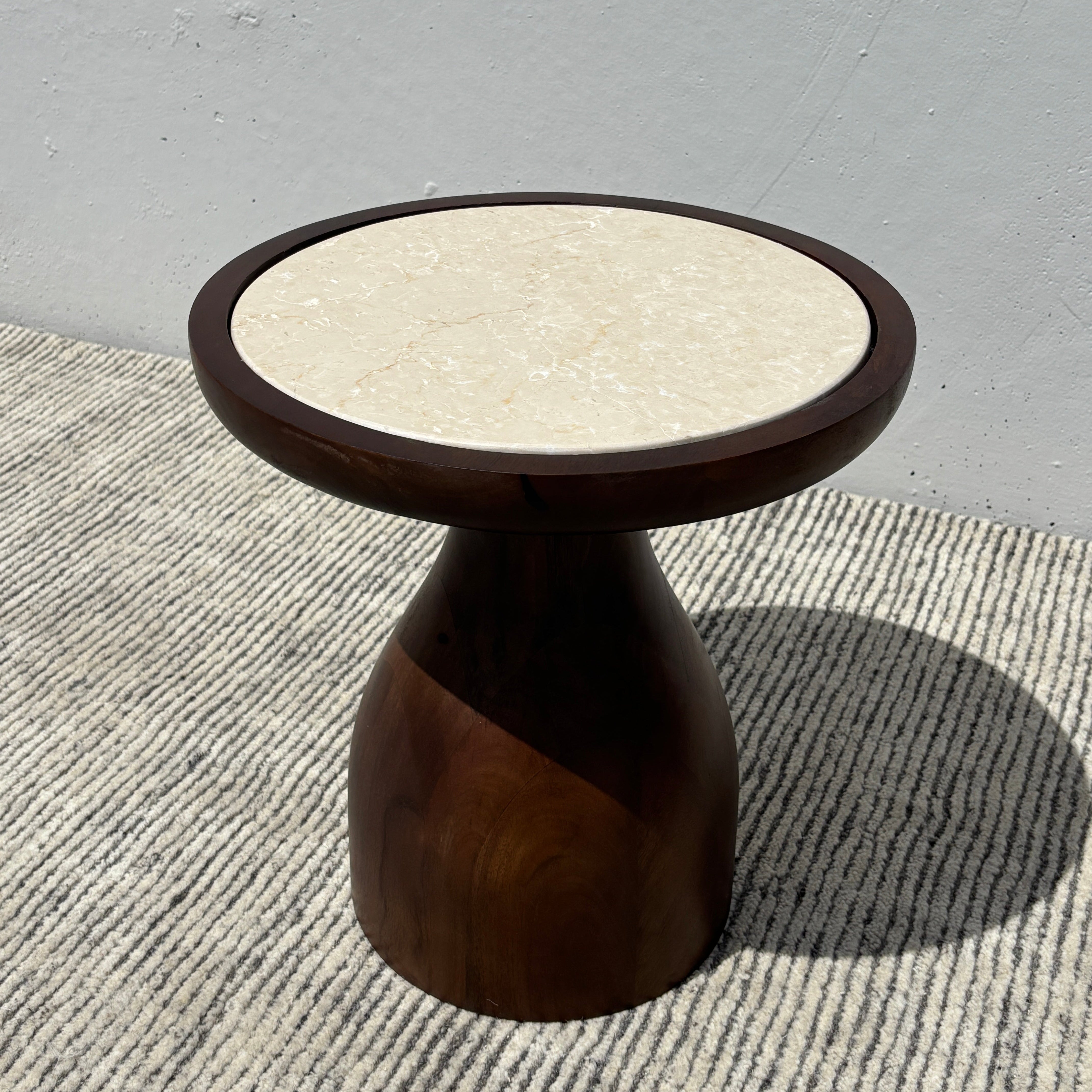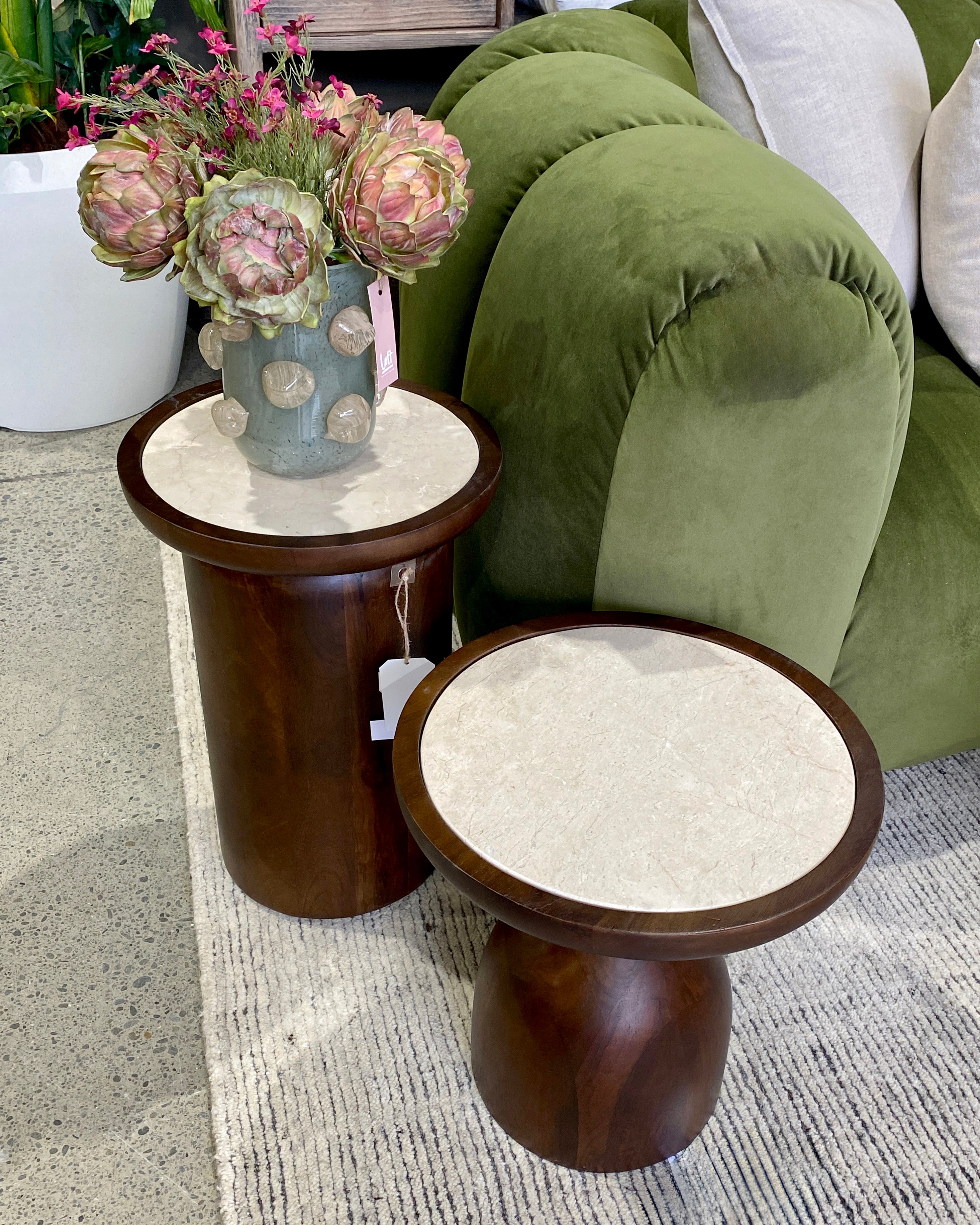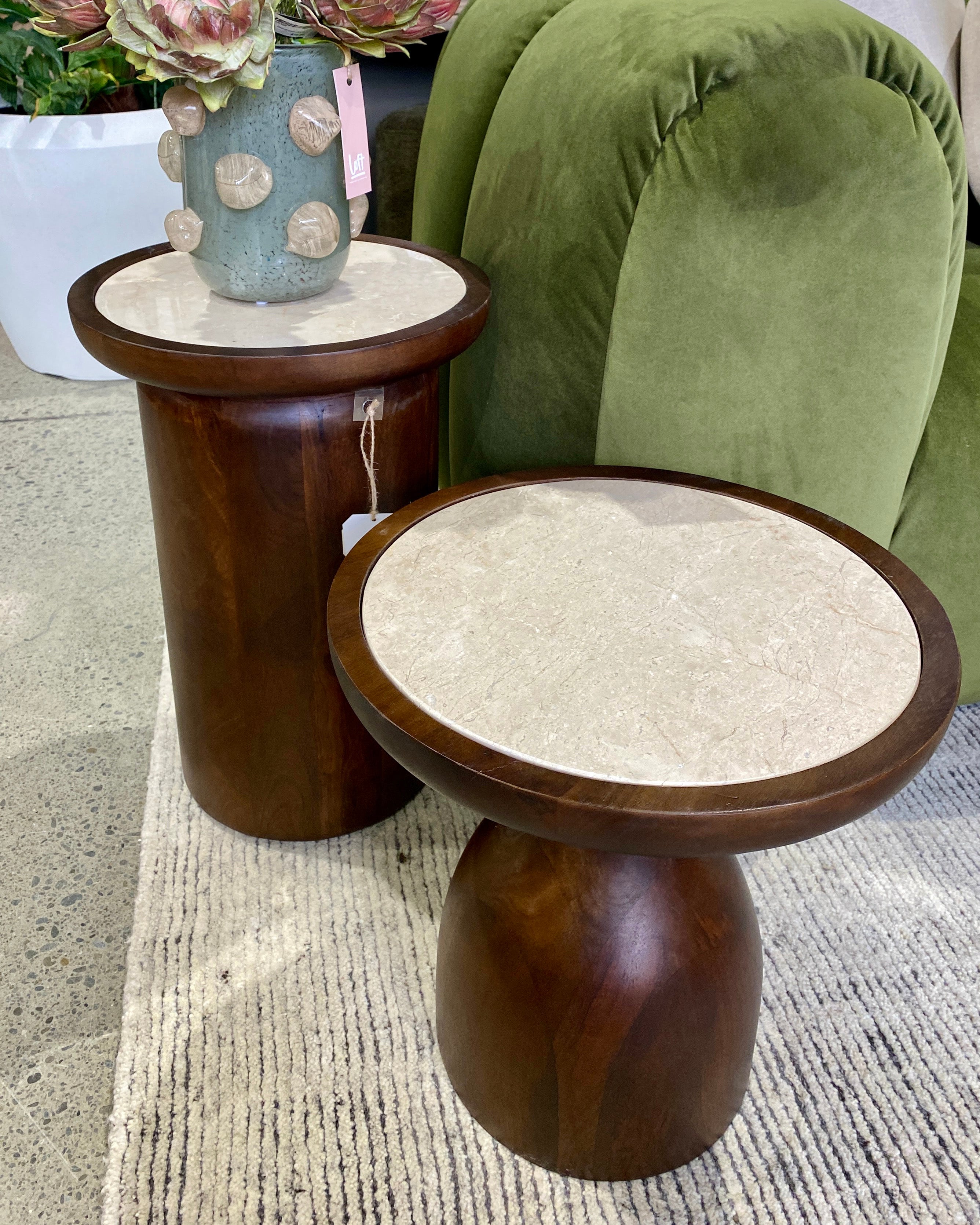 Introduce a touch of modern style into your interior with our Cina Side Table. This round table features a creamy marble top set into a curvaceous acacia wood base with parquetry detailing. A contemporary design infused with retro influences makes it a perfect statement accent piece. Place next to an armchair or sofa for a practical yet sophisticated addition to your space.