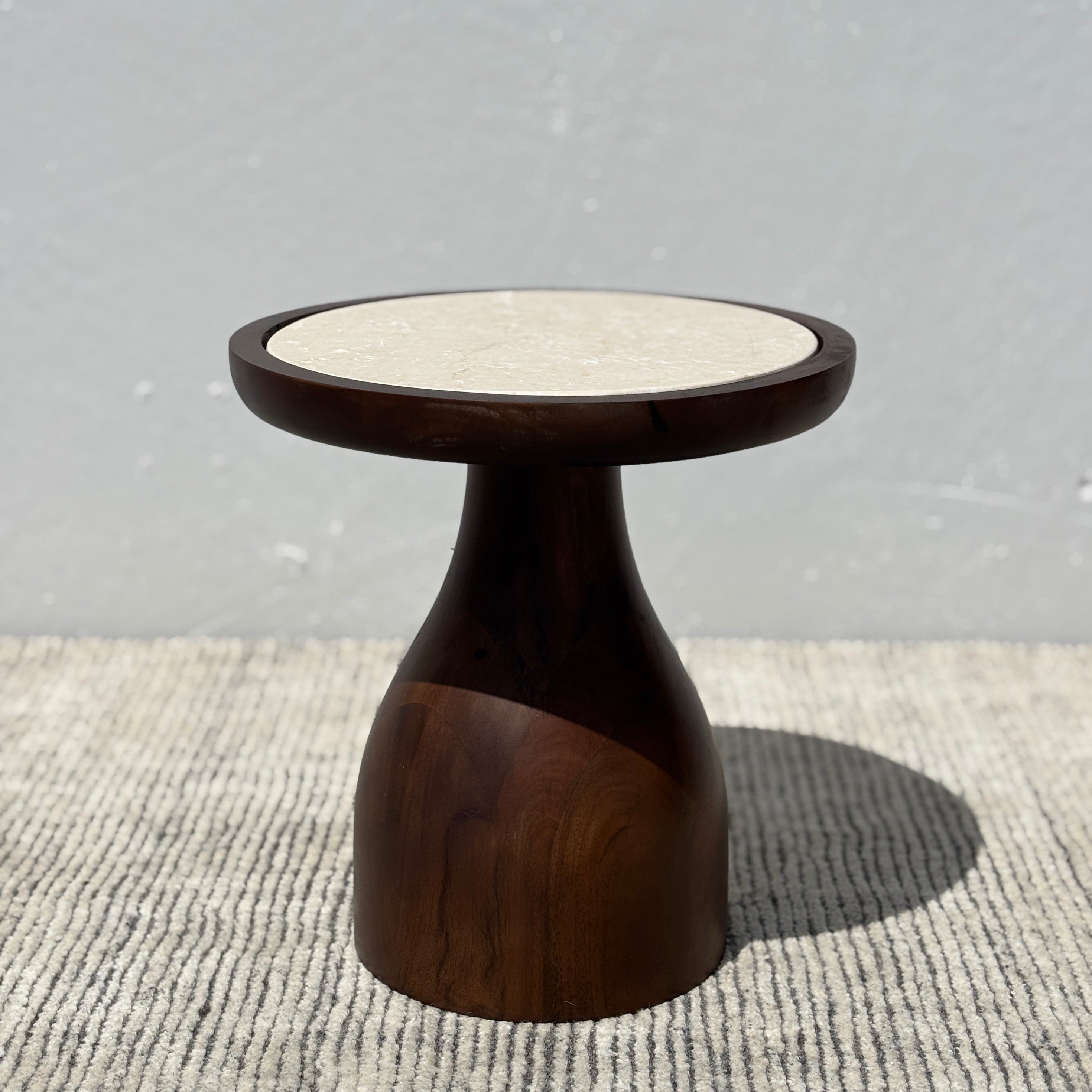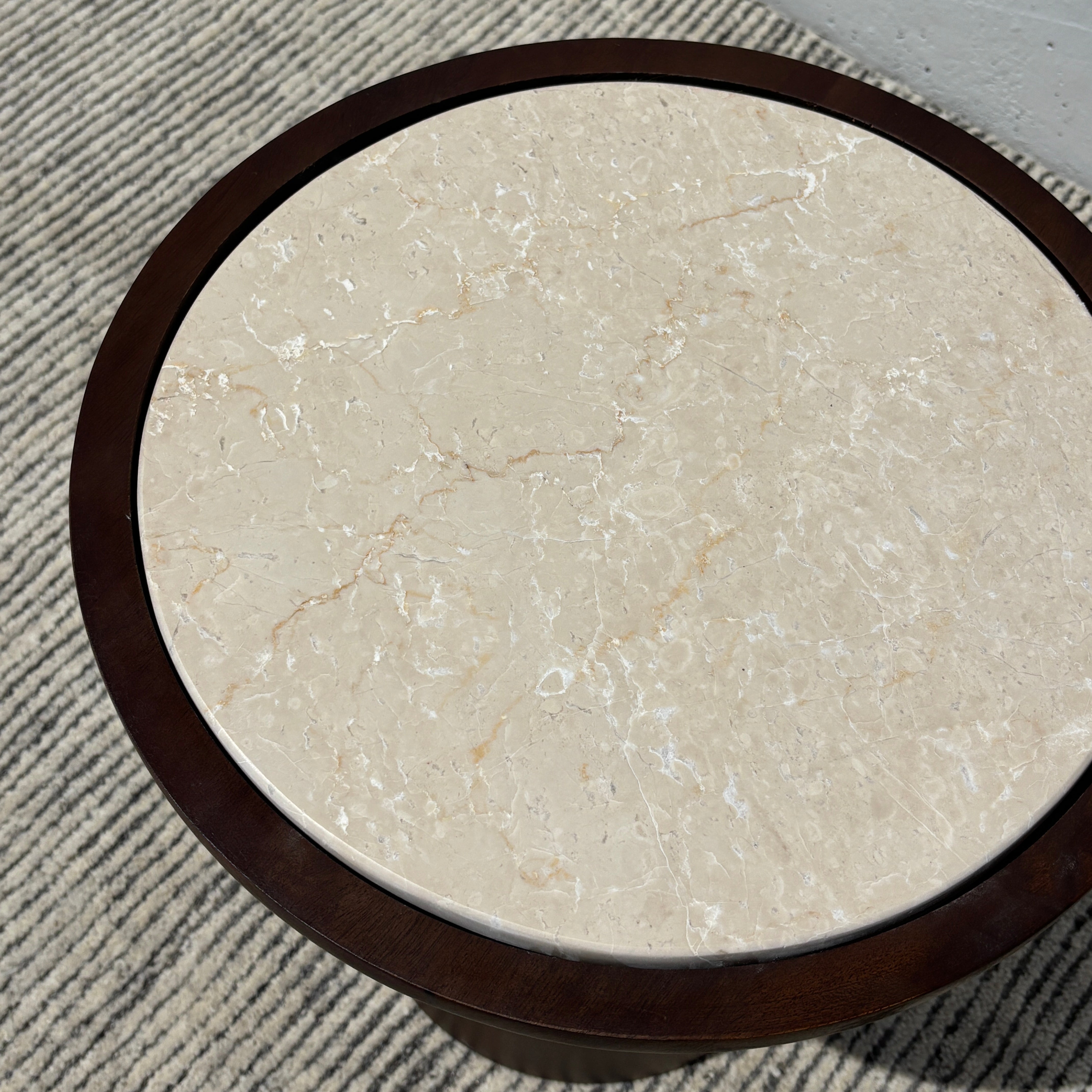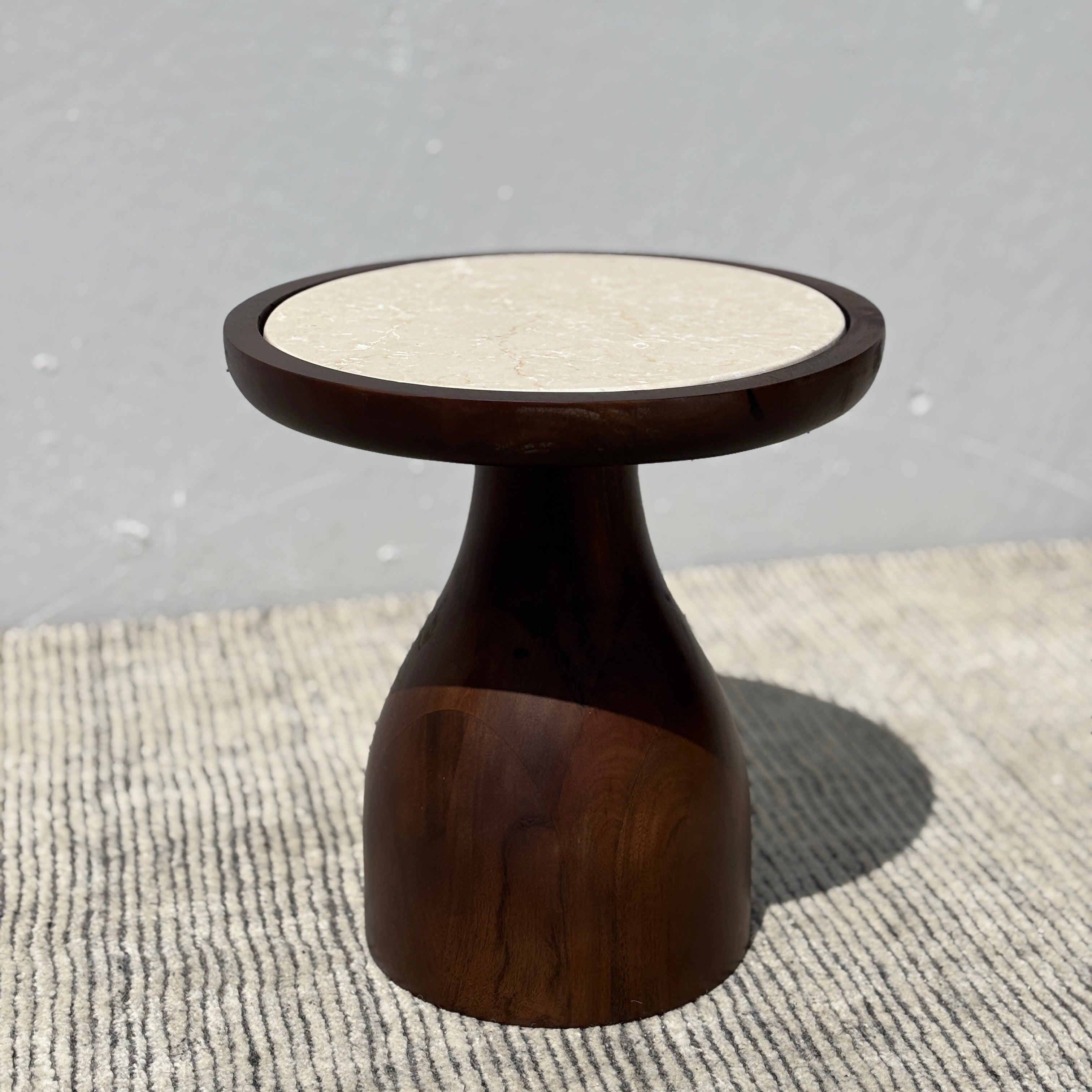 Introduce a touch of modern style into your interior with our Cina Side Table. This round table features a creamy marble top set into a curvaceous acacia wood base with parquetry detailing. A contemporary design infused with retro influences makes it a perfect statement accent piece. Place next to an armchair or sofa for a practical yet sophisticated addition to your space.