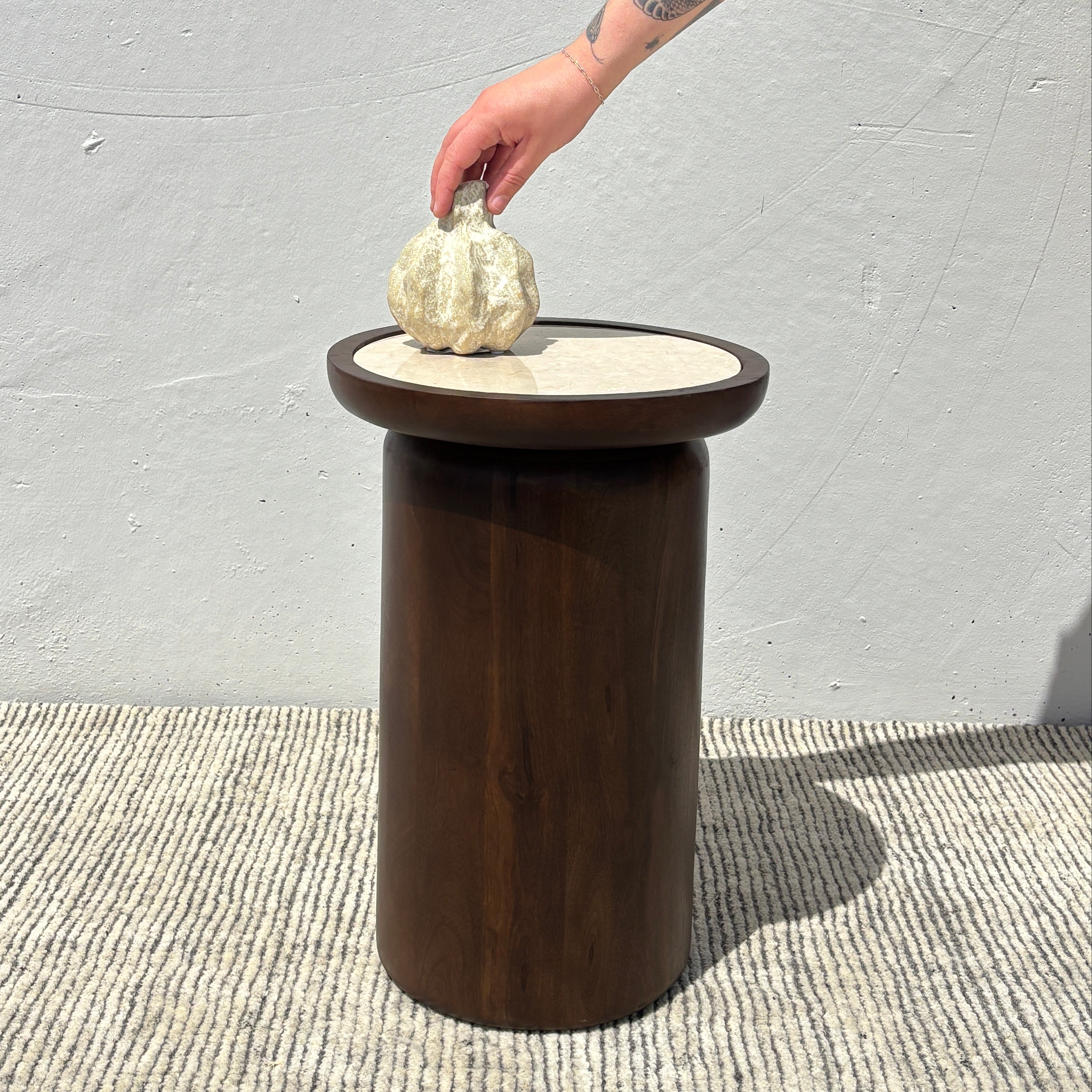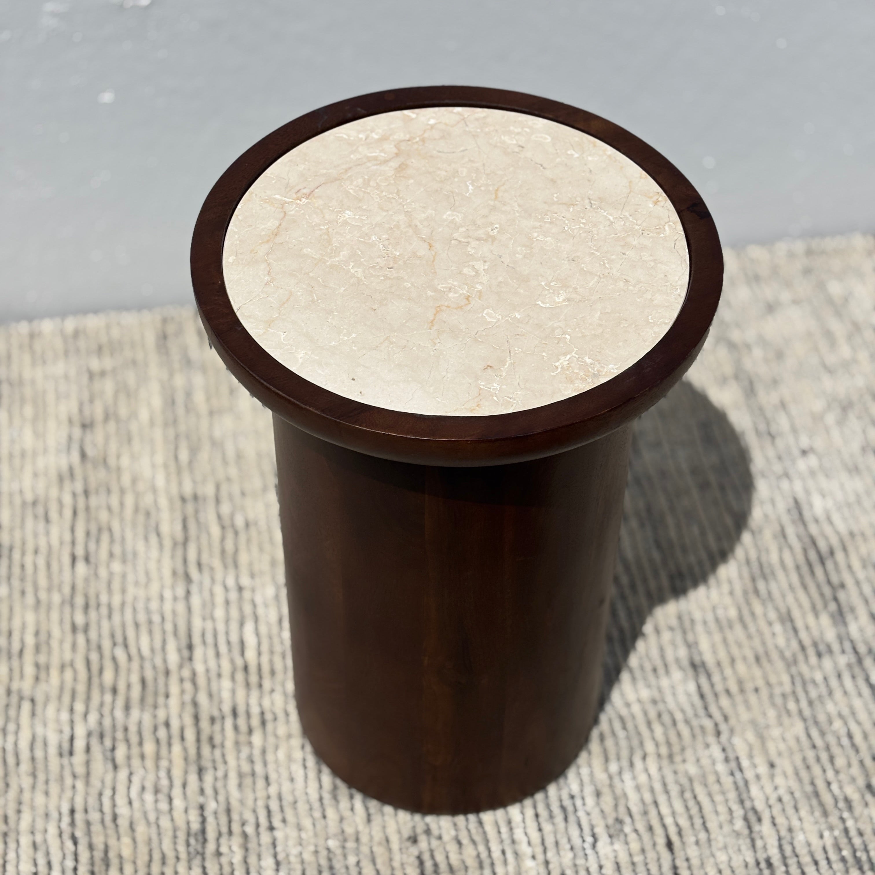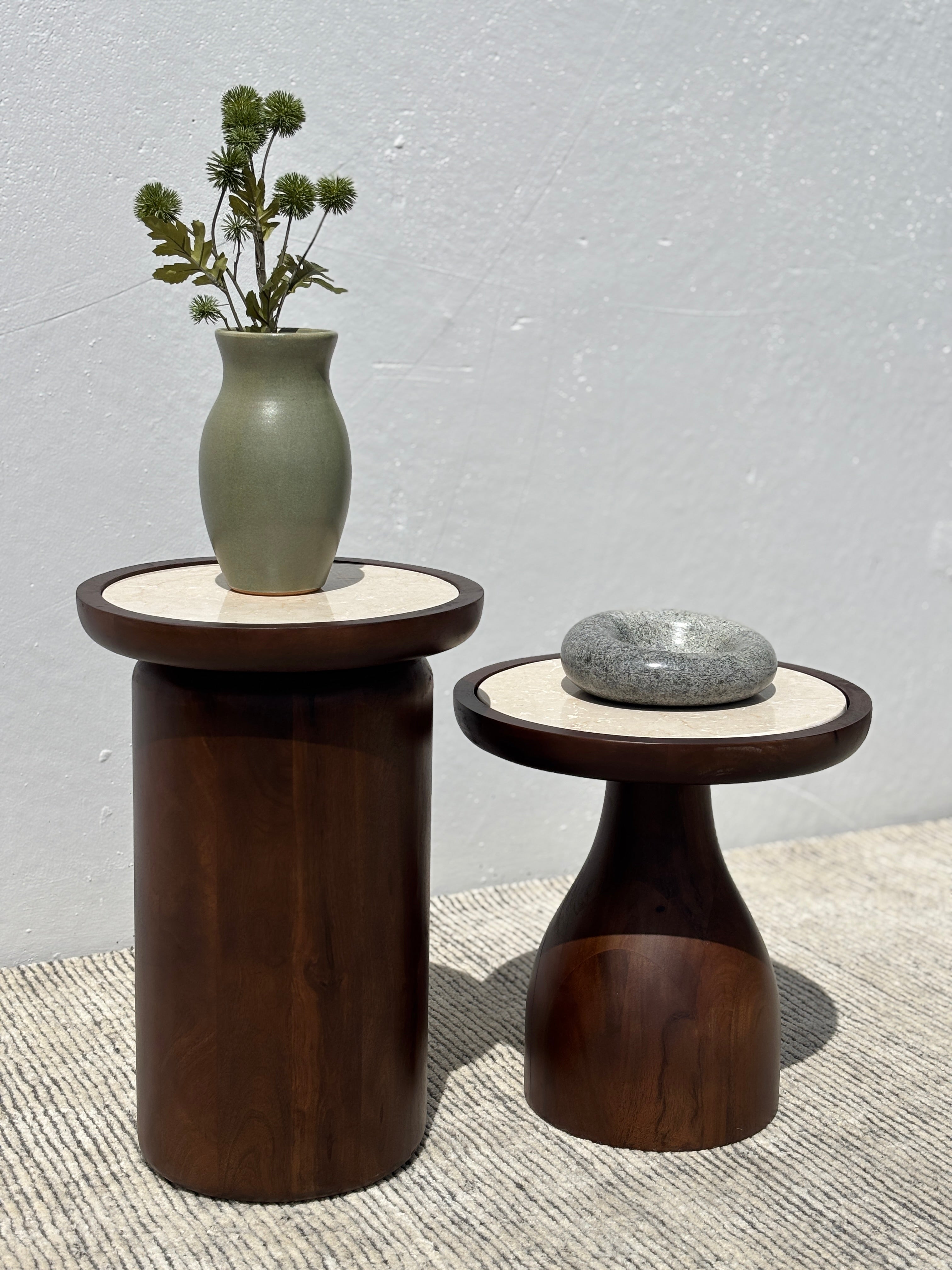 Introduce a touch of modern style into your interior with our Cina Side Table. This round table features a creamy marble top set into an acacia wood base. A contemporary design infused with retro influences makes it a perfect statement accent piece. Place next to an armchair or sofa for a practical yet sophisticated addition to your space – or next to the bed as a bedside table!