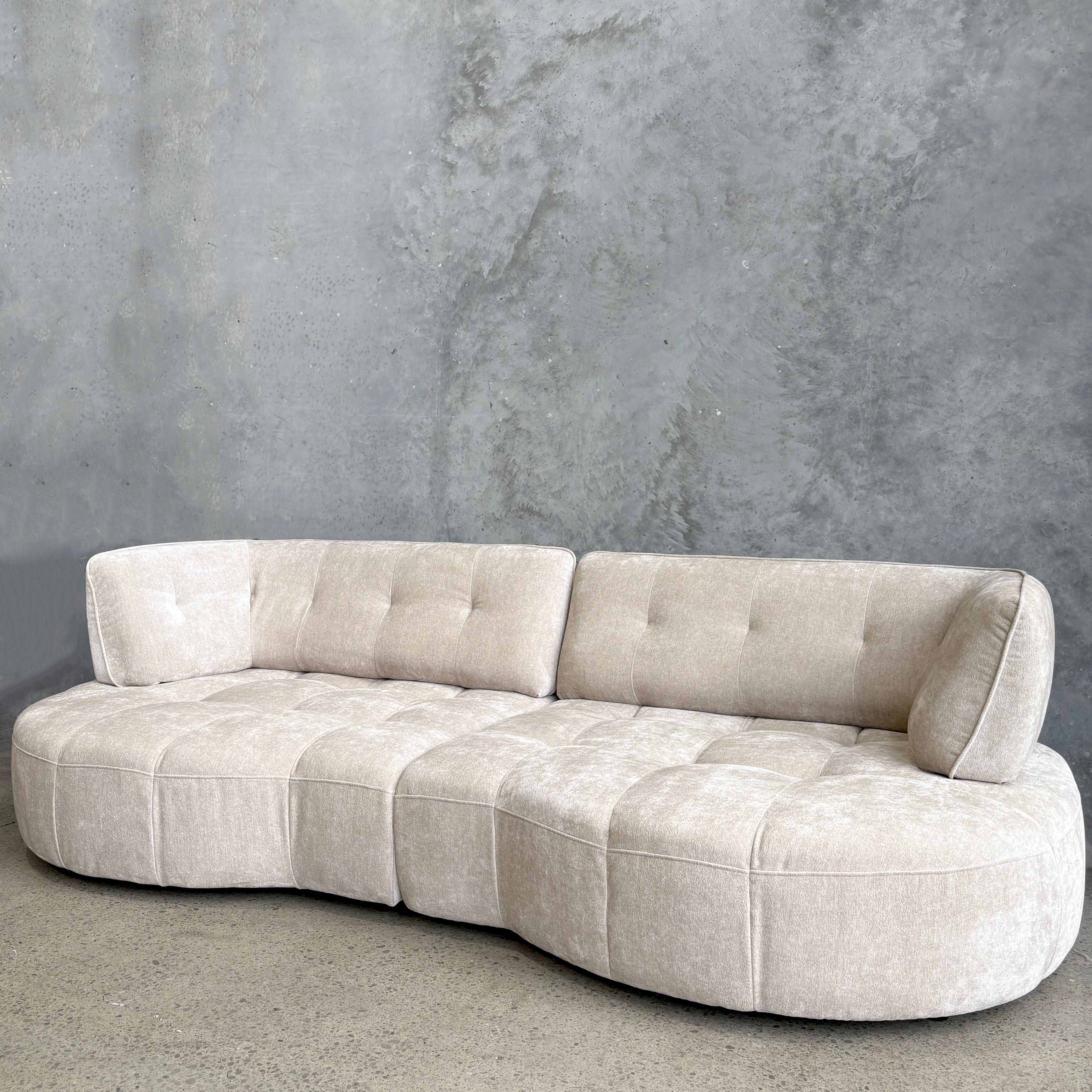 Chic, adaptable and completely distinct: meet the Coco Sofa, our latest unique curved sofa offering. Constructed as two adjoining mirrored pieces at an extra-large 3.5 seater size and featuring an adjustable curved back and arm, giving you two options for seat depth. This levered mechanism allows the back piece to be easily moved forward & backward – allowing you more space to curl up when you need it, just like a chaise!