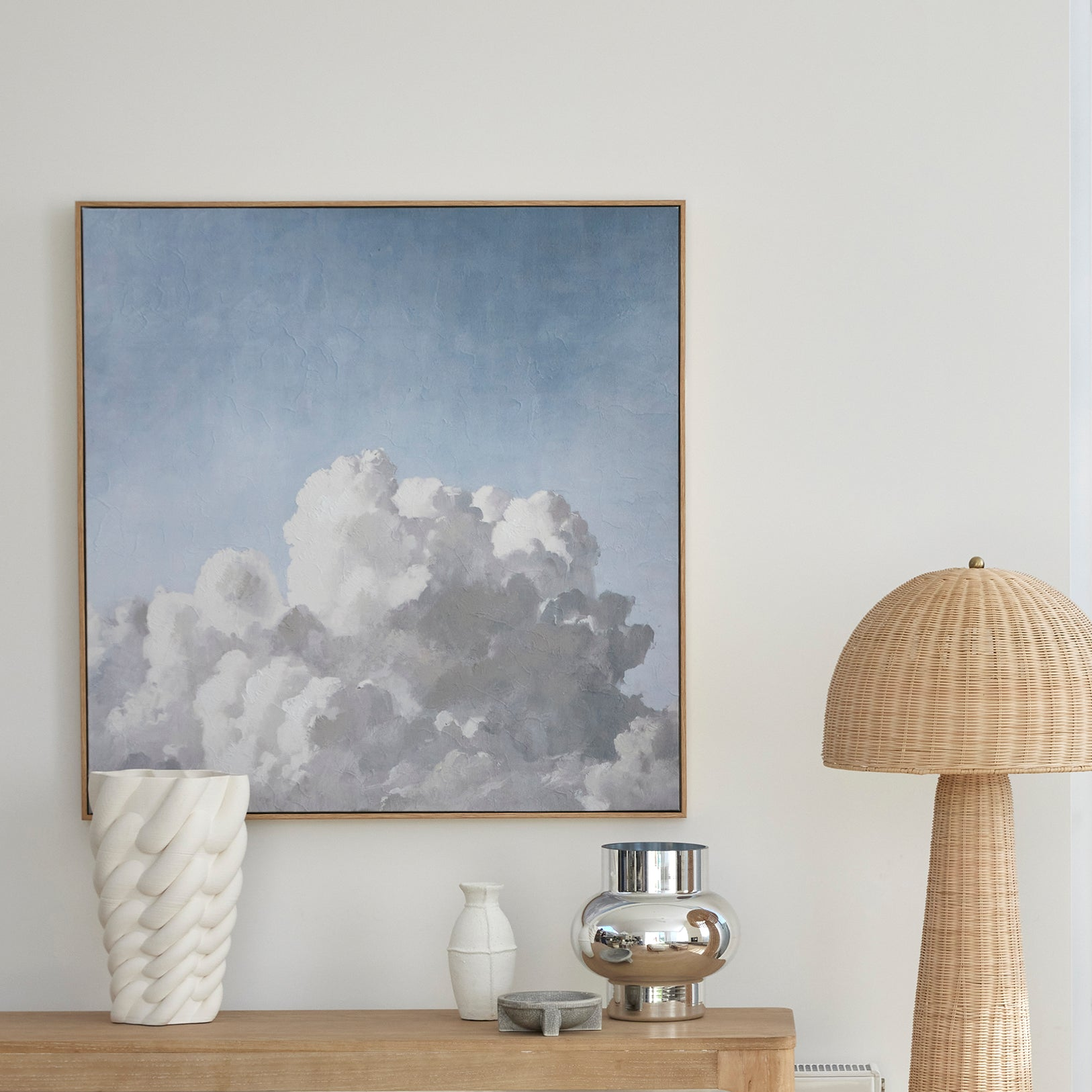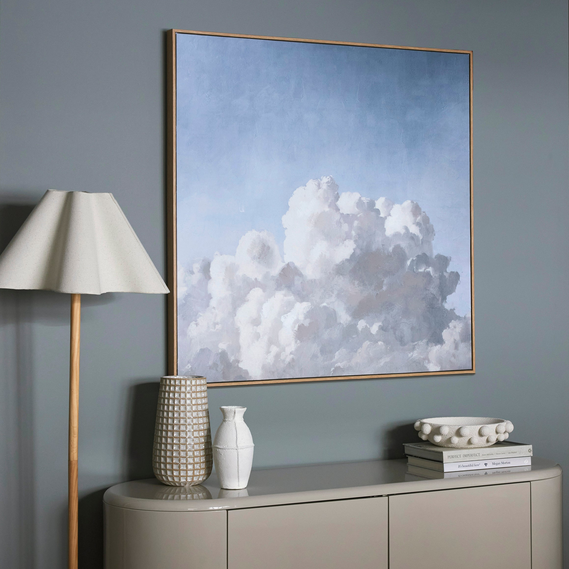 The Cumulus Framed Canvas Art features hand-painted soft cloud motifs on a serene sky blue background. Measuring 100x100cm, this framed piece adds a touch of ethereal elegance to any room. Ideal for walls or entryways, it brightens your space with a subtle yet striking effect.