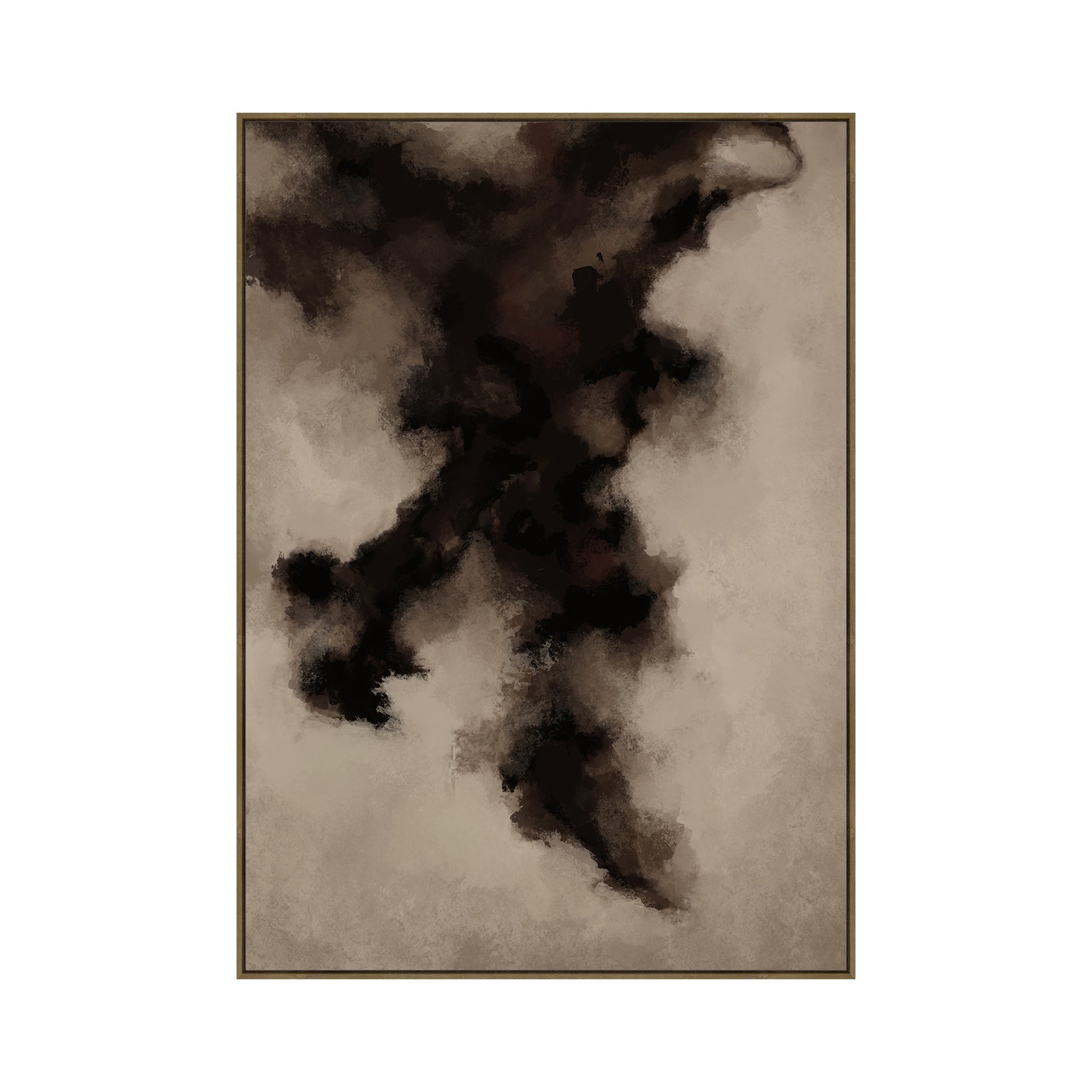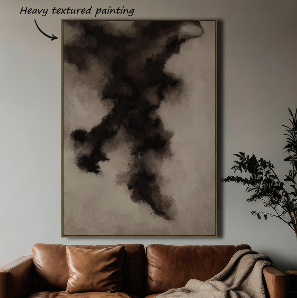 Captures contemporary elegance with its heavily textured surface and sophisticated colour palette. Rich brown tones blend seamlessly with smokey black accents, creating an abstract composition that draws the eye. The oak-toned frame complements the artwork's organic aesthetic.