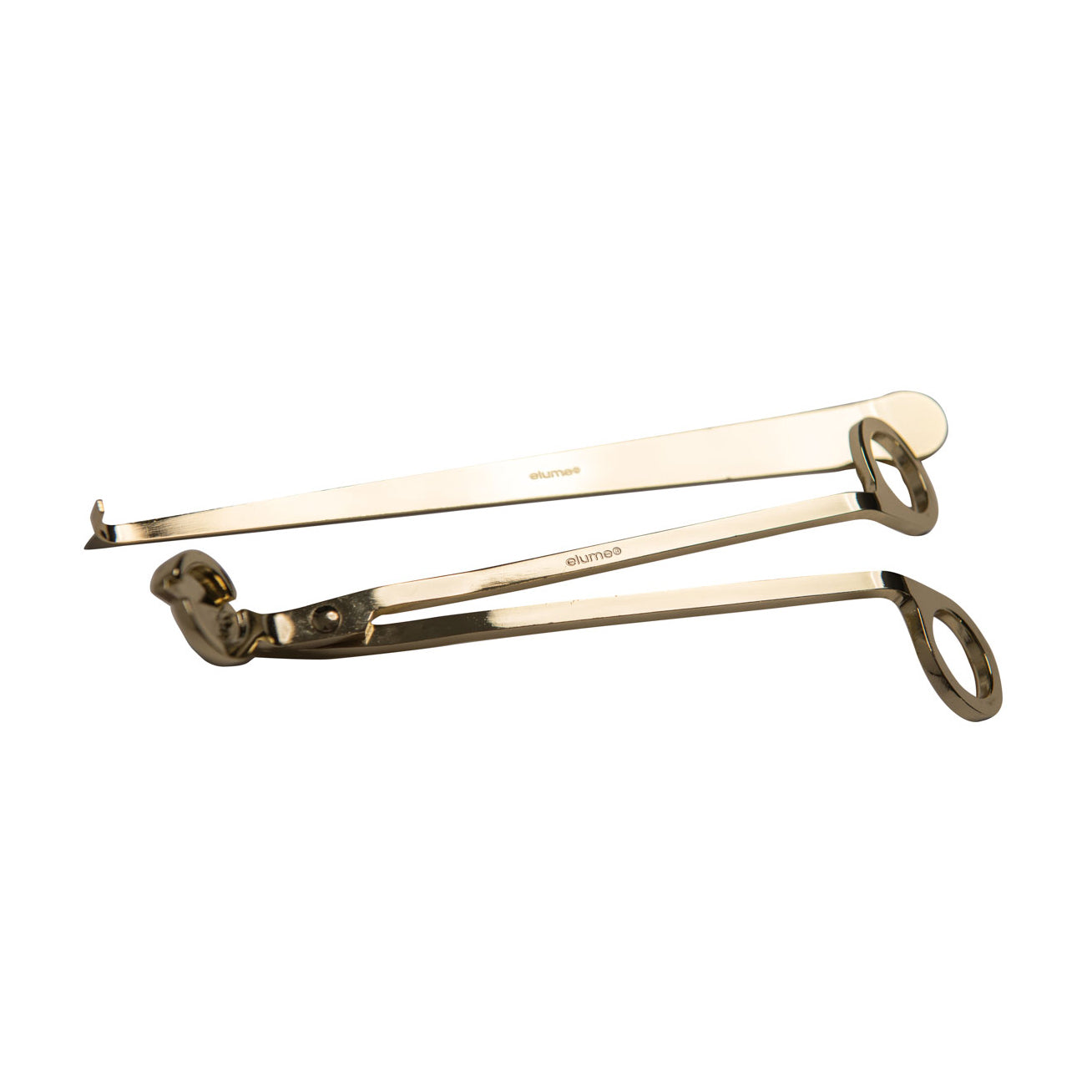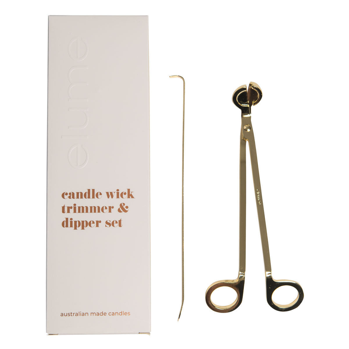 The new Elume Candle Wick Trimmer & Dipper Set is an ideal accessory to any home. The trimmer perfectly trims the wick to the ideal length of 6mm, to promote a perfect burn. The best way to extinguish your candle is by gently pushing the burning wick into the hot wax pool with the dipper. This stylish set is made from stainless steal with gold plating. Displayed in an elegant gift box.