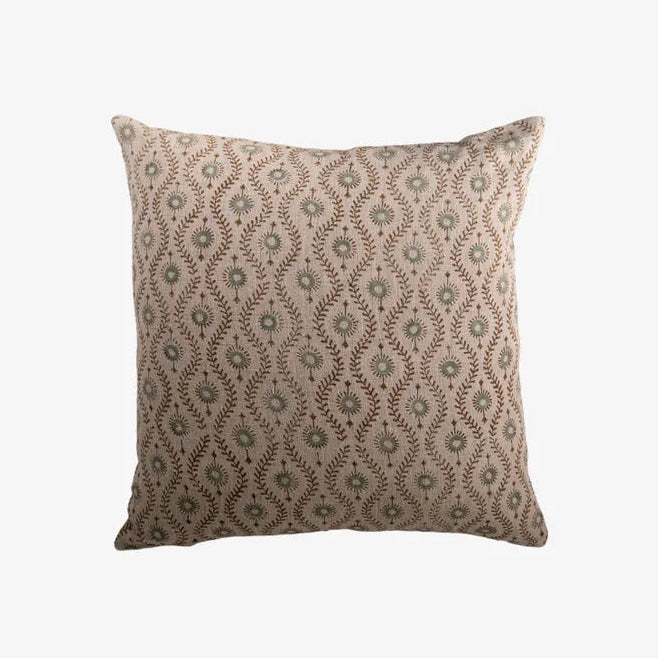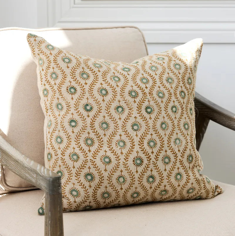 Crafted from natural linen and printed using a traditional Indian hand-blocking technique, this cushion is a quiet celebration of slow craft. Each floral motif is stamped by hand, giving subtle variation in tone and detail – no two are ever quite the same. Its soft, lived-in palette and delicate print bring a sense of calm and character to any space. Perfect for layering on sofas, beds or armchairs – especially for customers drawn to artisanal texture and timeless, feminine design.
