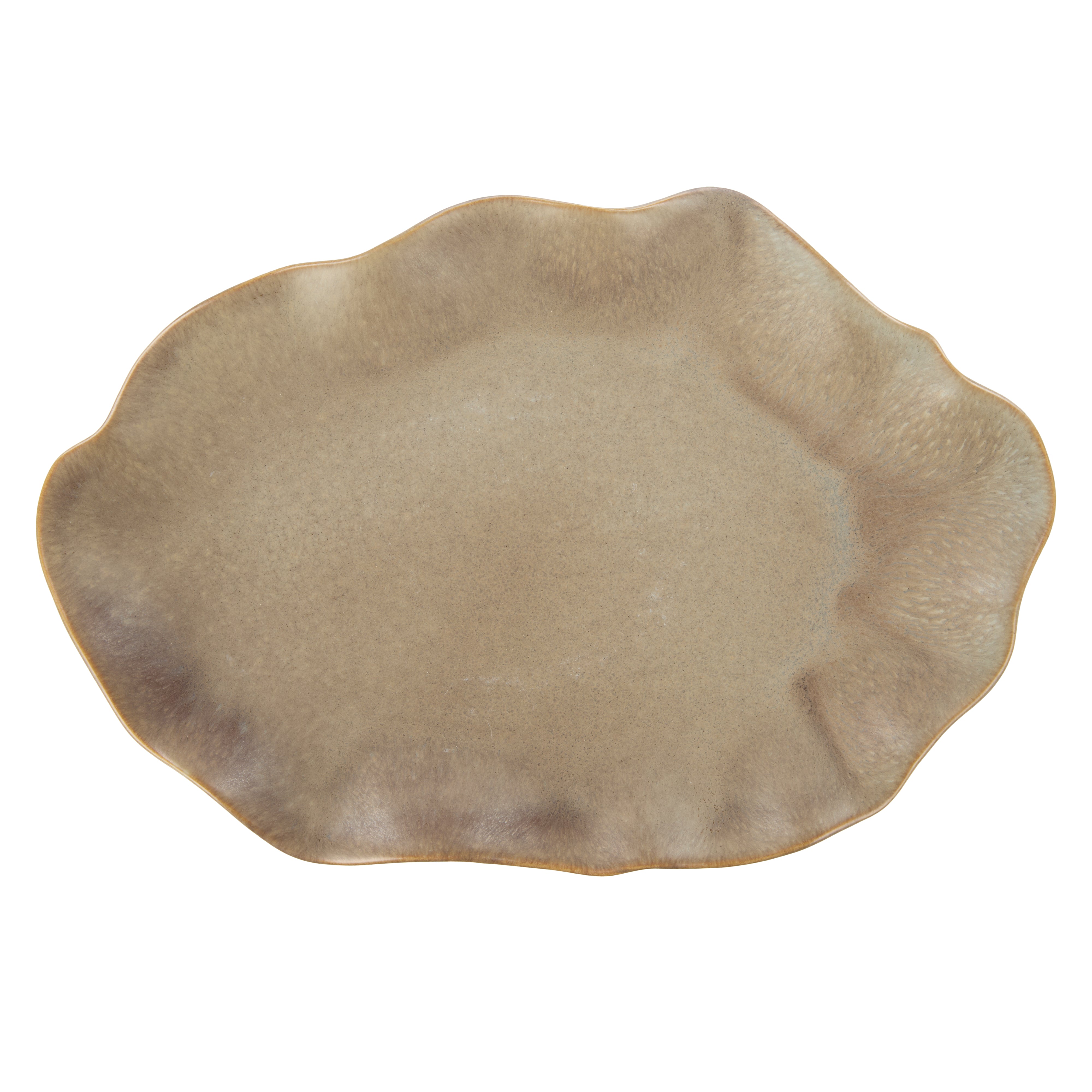 The Fluid Dish features an elegant oval silhouette with fluid, wavy lines, crafted from durable stoneware in a sophisticated grey finish. It adds a refined touch to any tabletop, shelf, or window display.