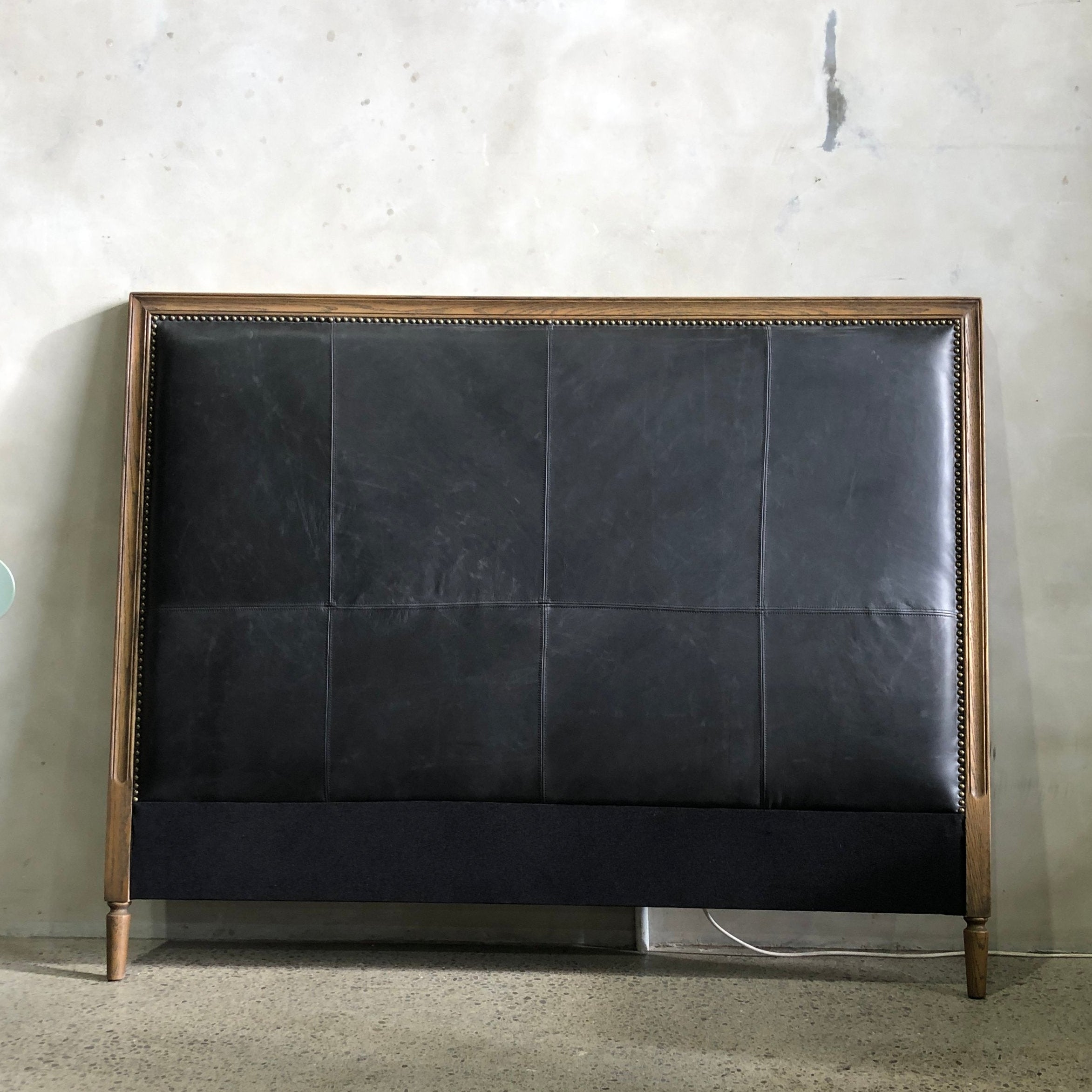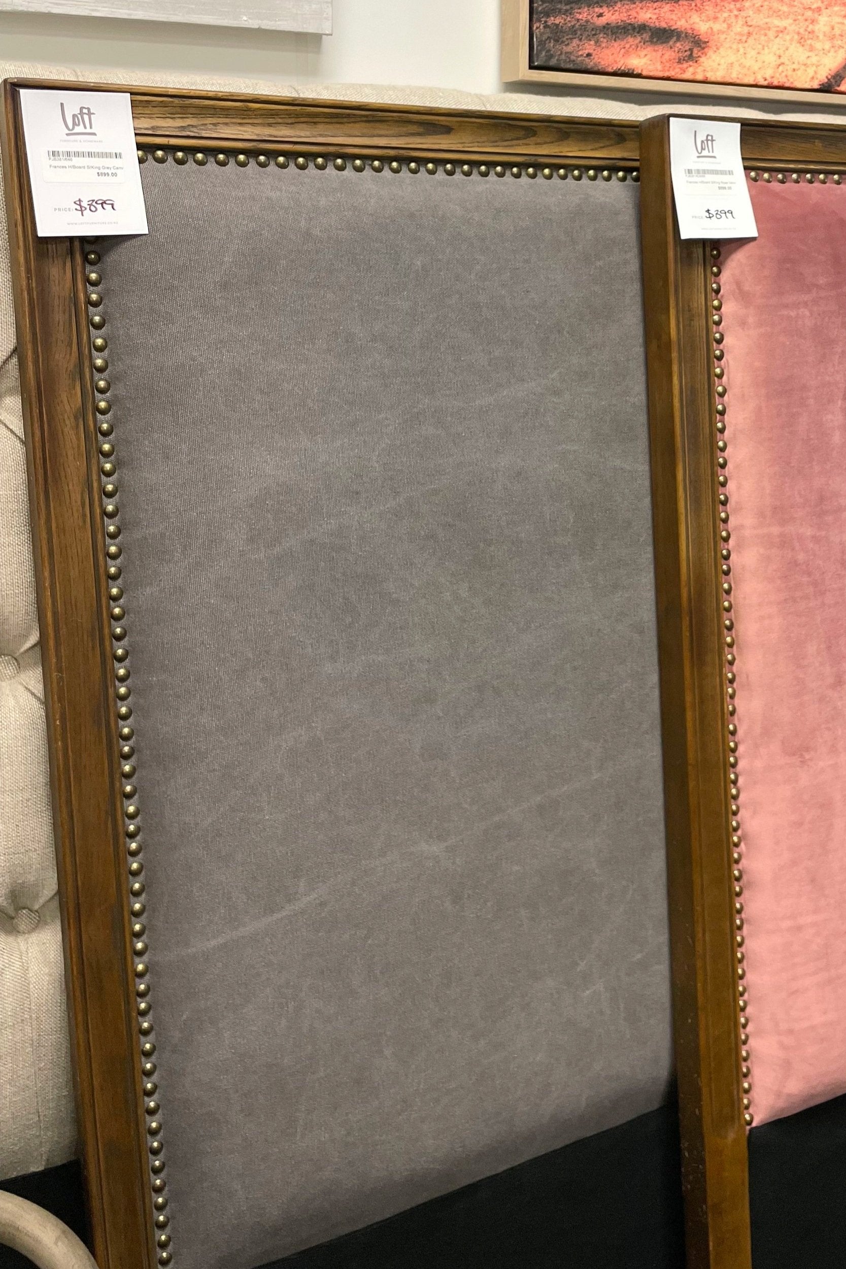 Our ever-popular Frances Framed Headboard has a classic look and timeless quality, featuring a padded upholstered centre framed in solid oak and brass stud detailing. A Loft top seller for many years!