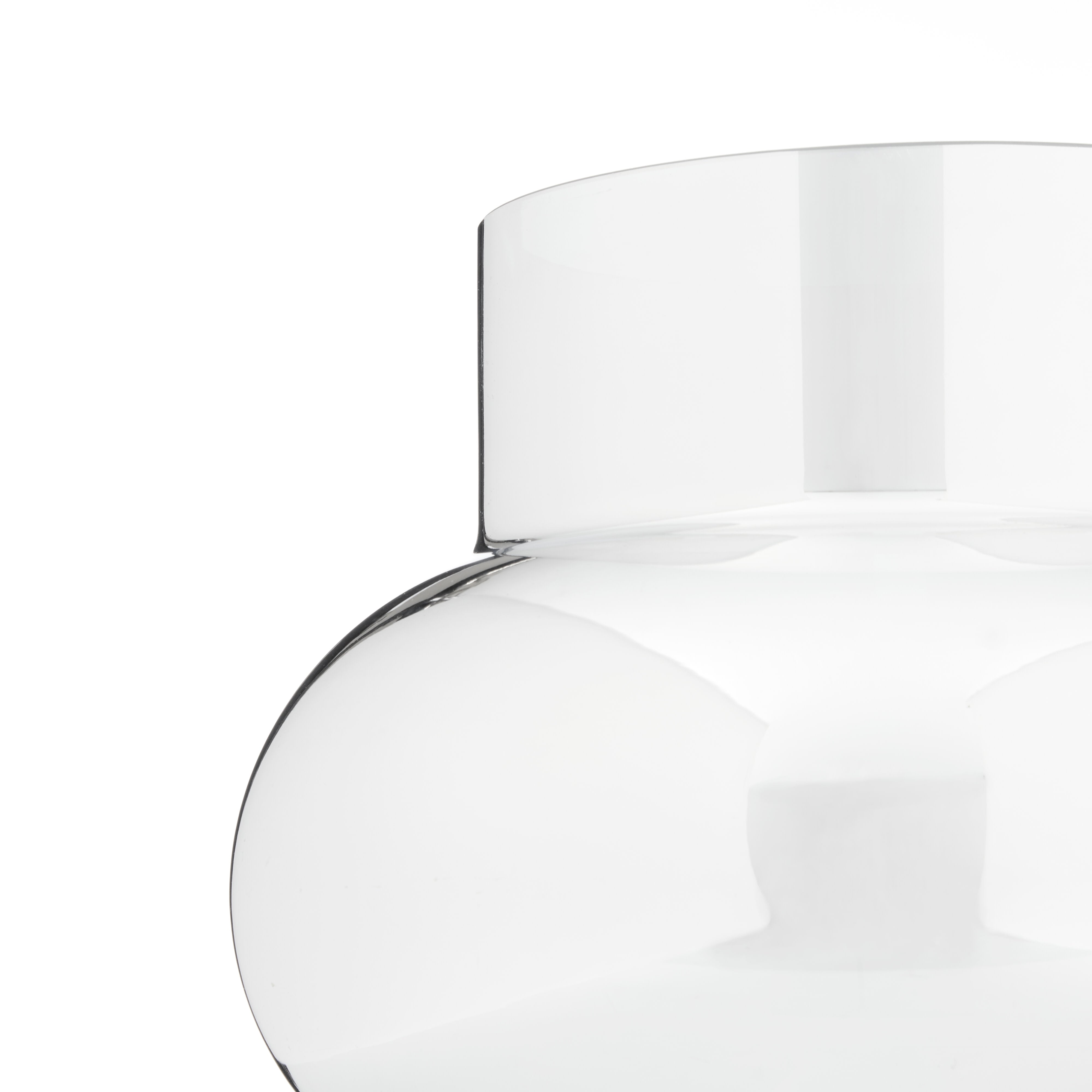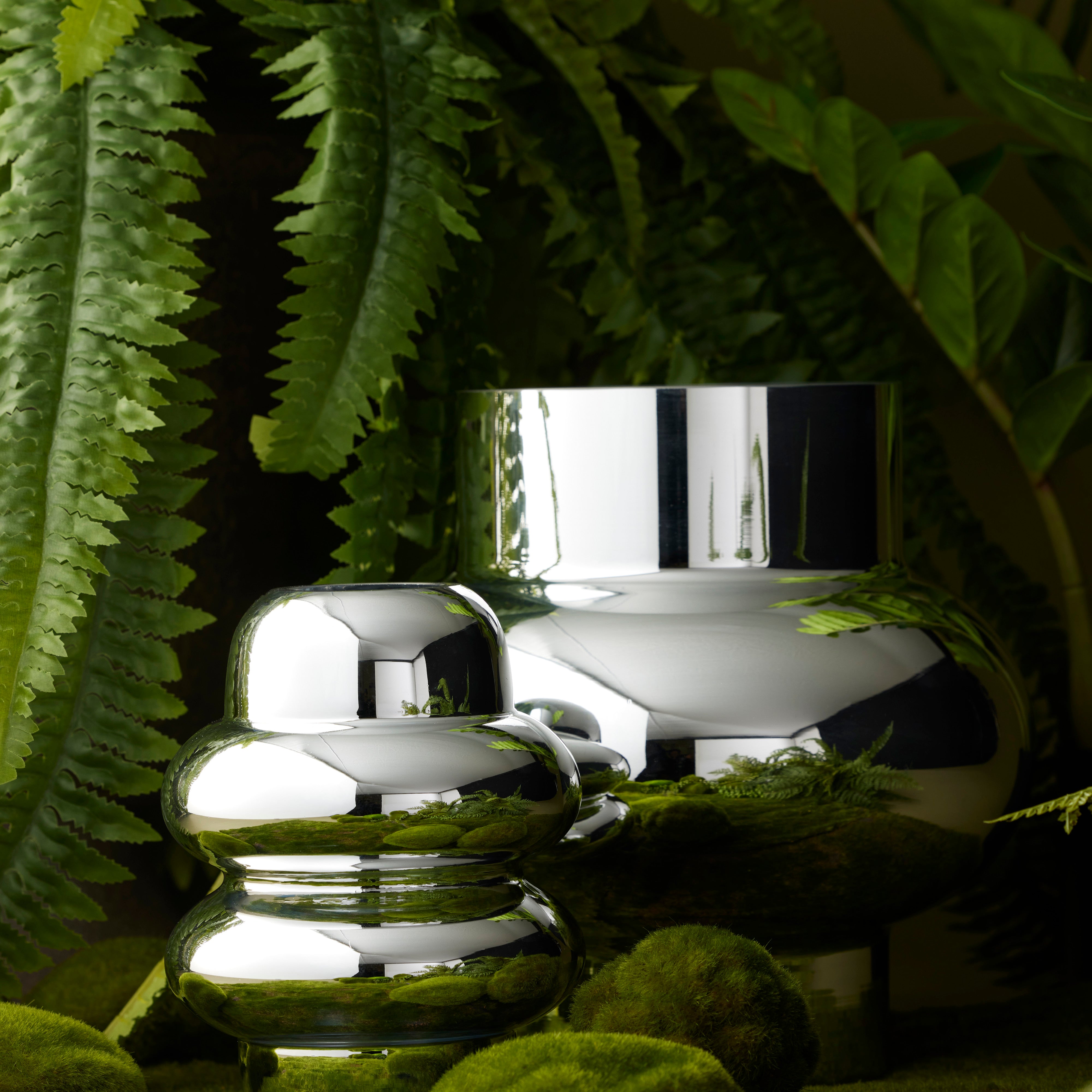 This Gallium Glass Metallic Vase Large is crafted from glass with a silver metallic finish. The contemporary bulbous sculptural silhouette makes it a true statement piece on a tabletop, shelf or window display.