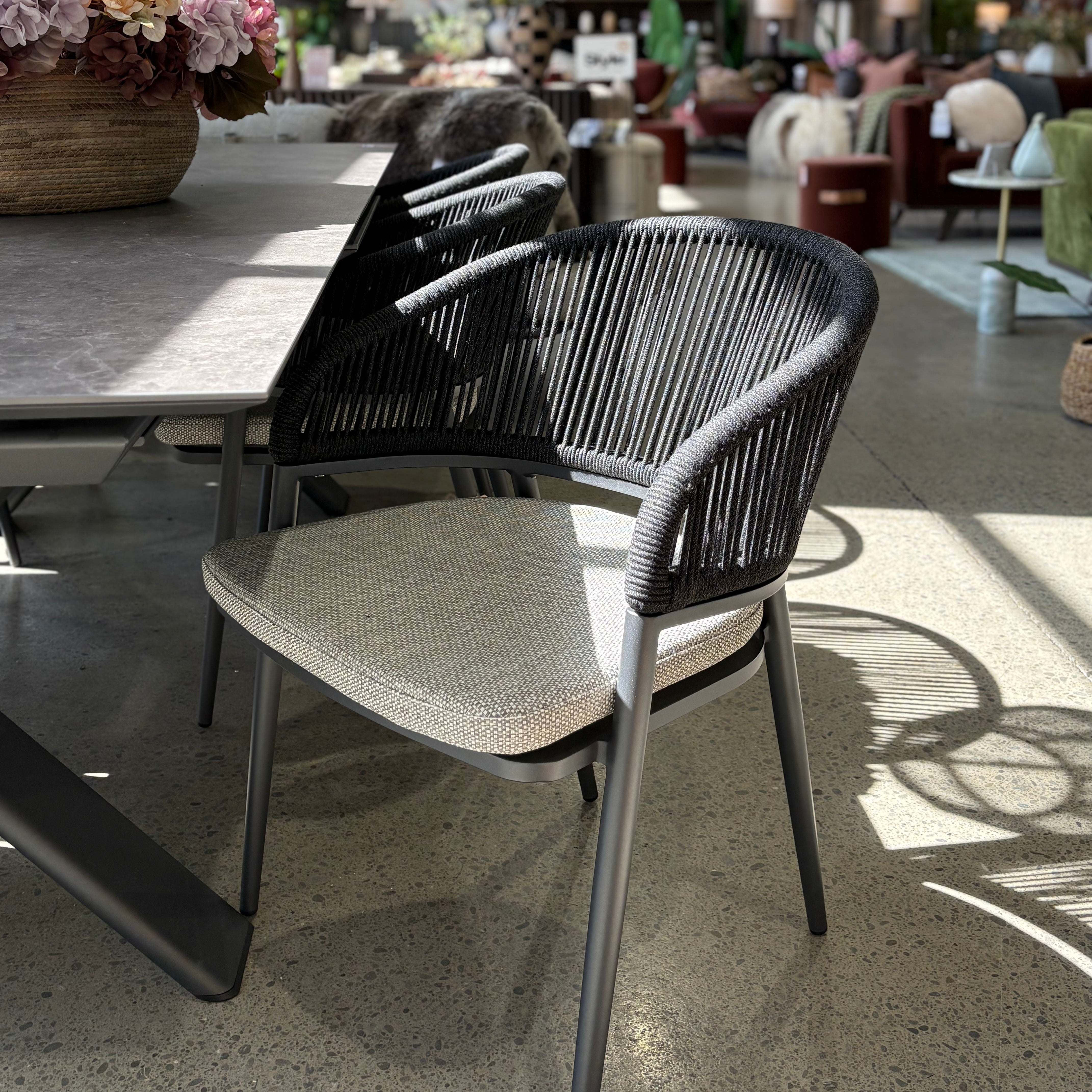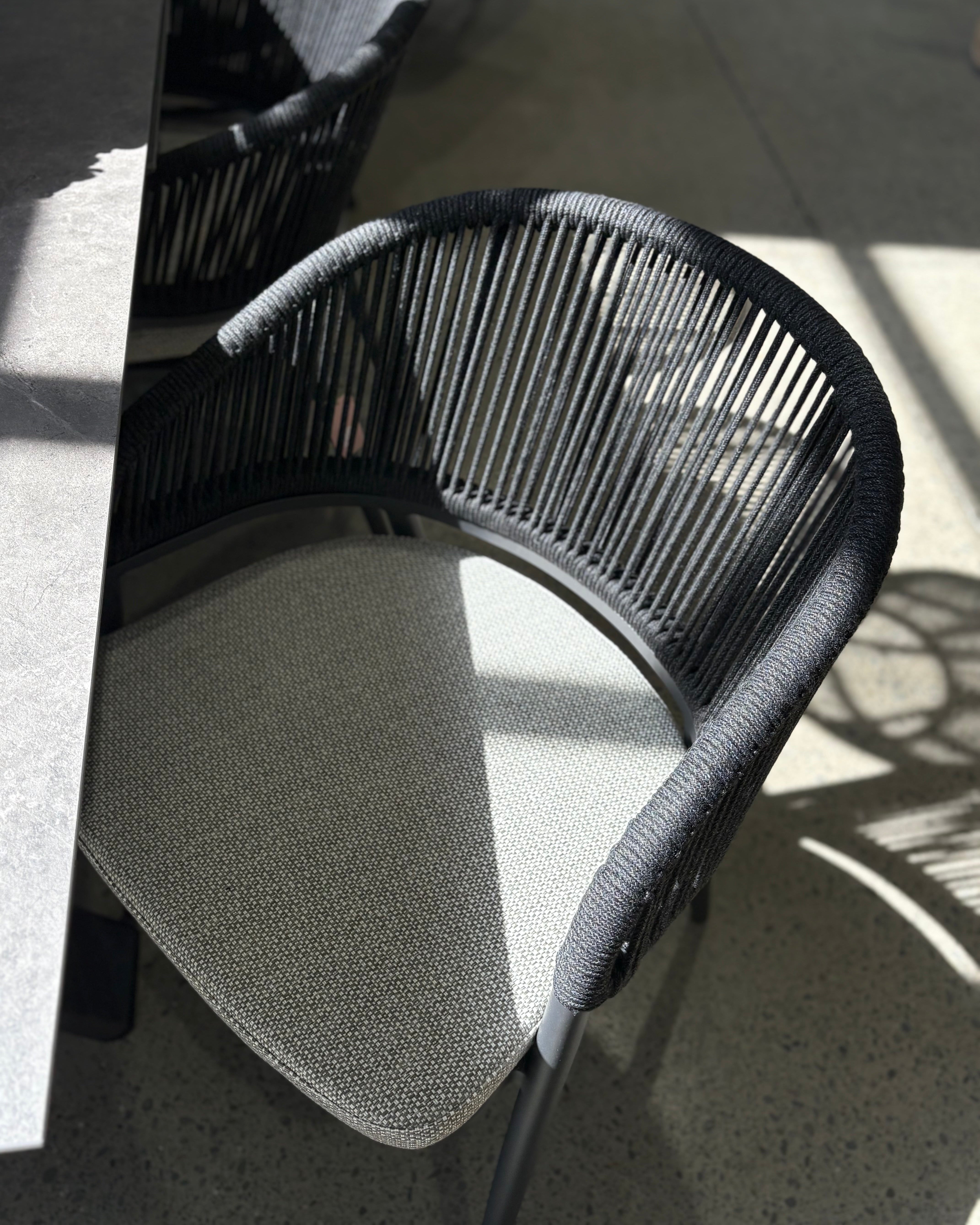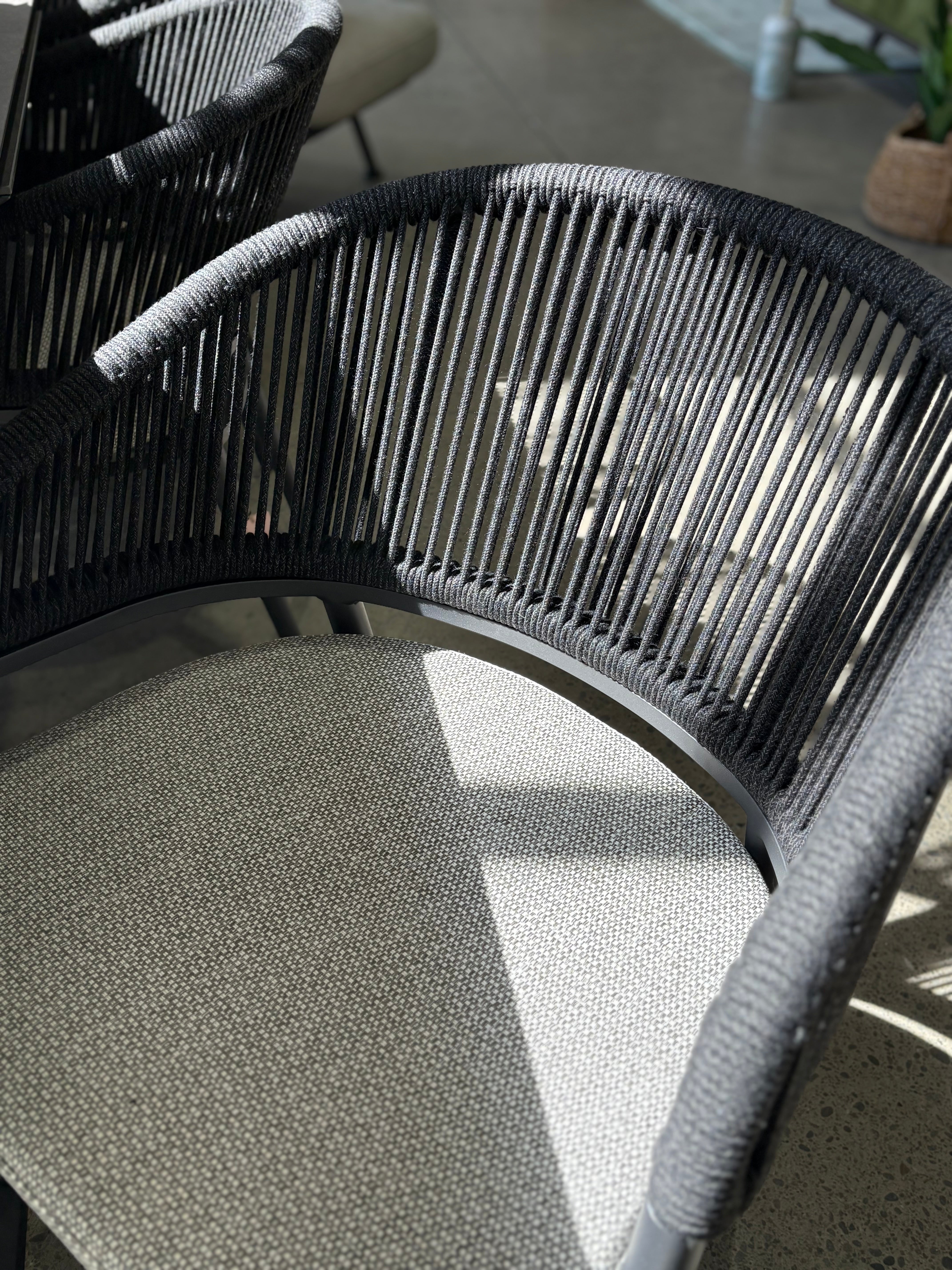 In Charcoal frame finish with black rope backrest and Flax fabric seat – to match with the Albatros Dining Table, Sunset Lounger Sofa, Orlando Sofa and Orlando Modular.