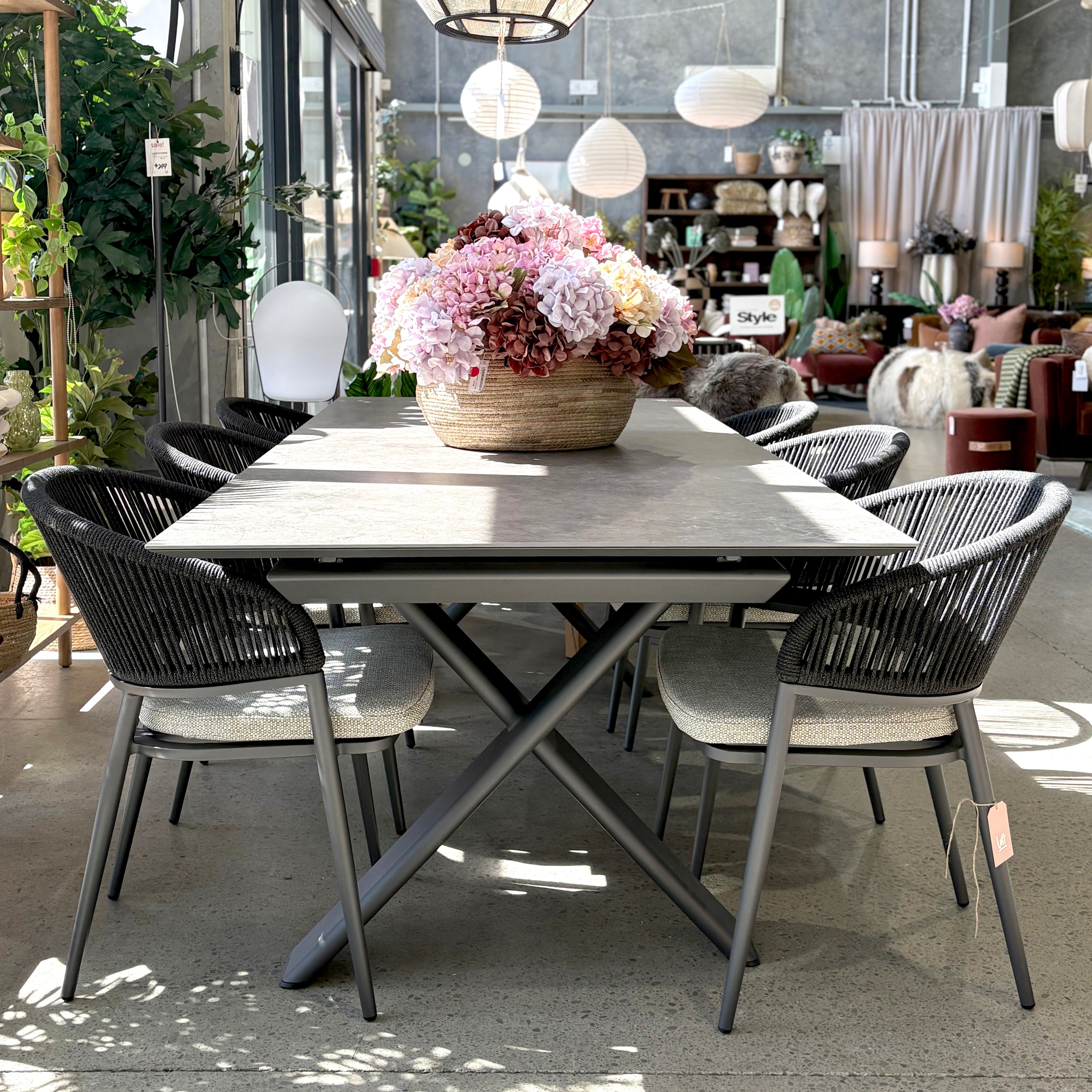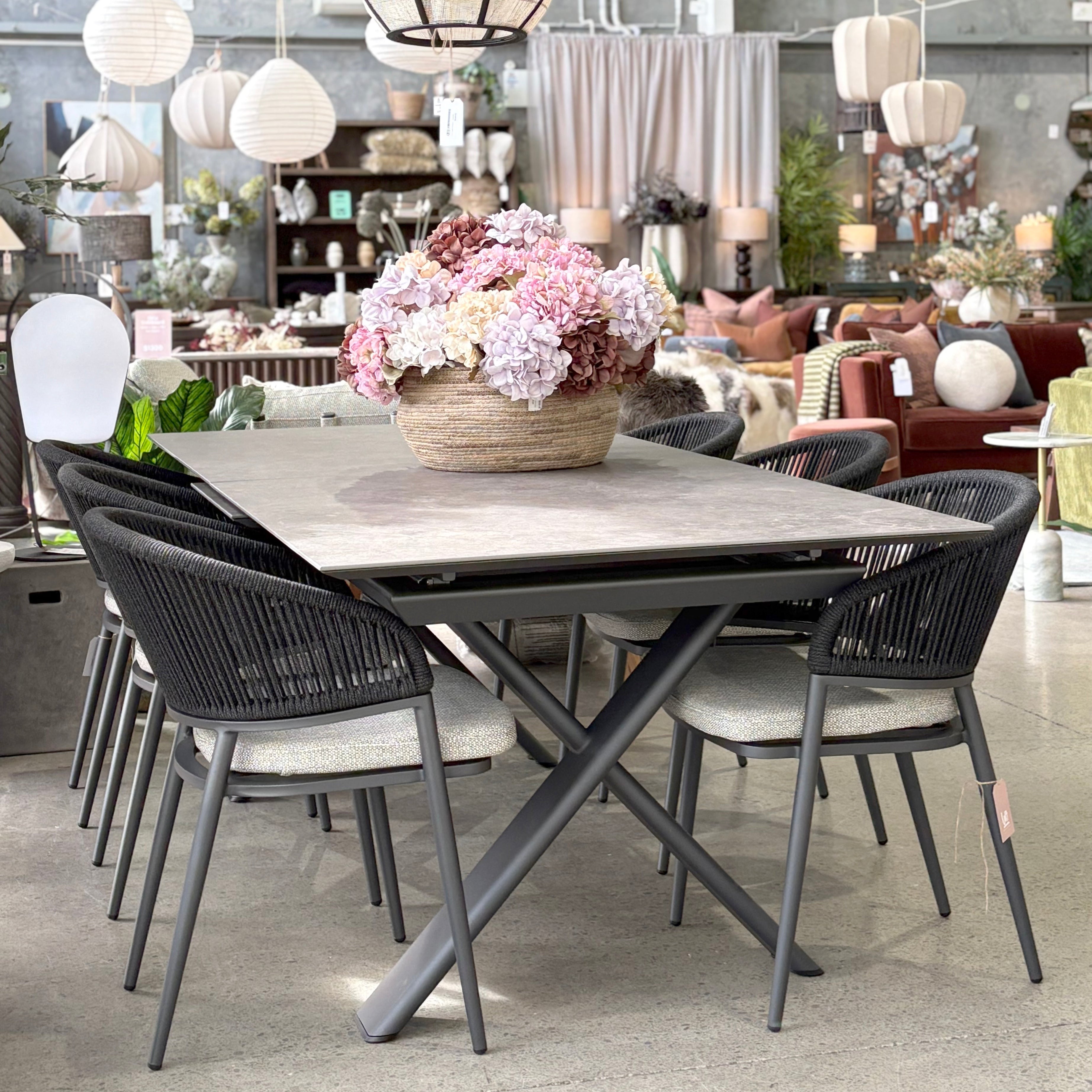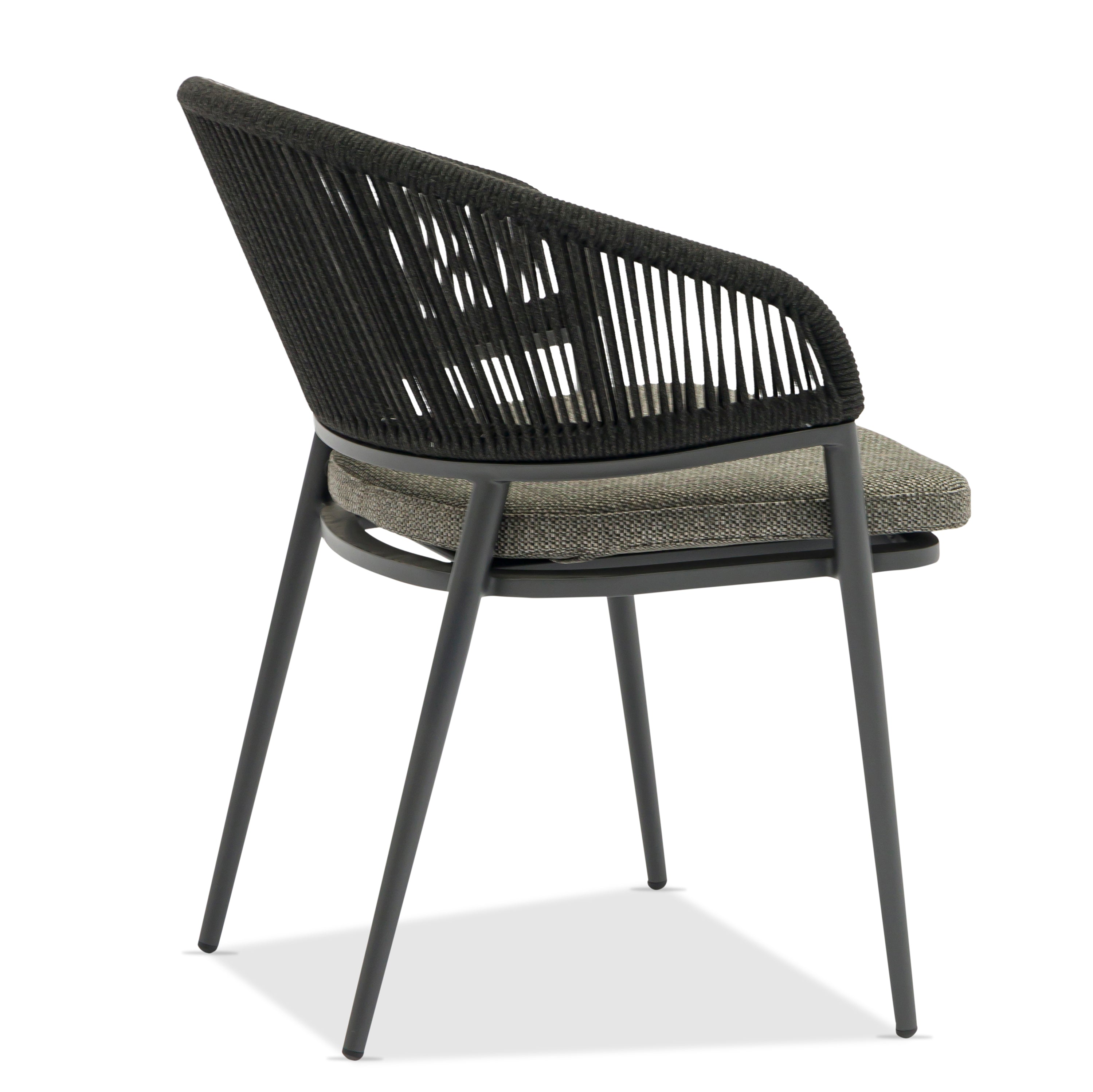 In Charcoal frame finish with black rope backrest and Flax fabric seat – to match with the Albatros Dining Table, Sunset Lounger Sofa, Orlando Sofa and Orlando Modular.