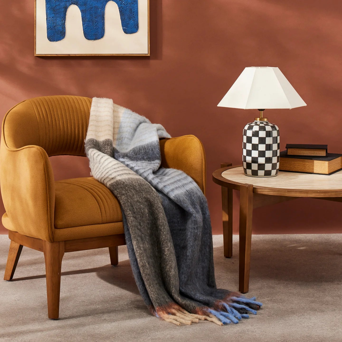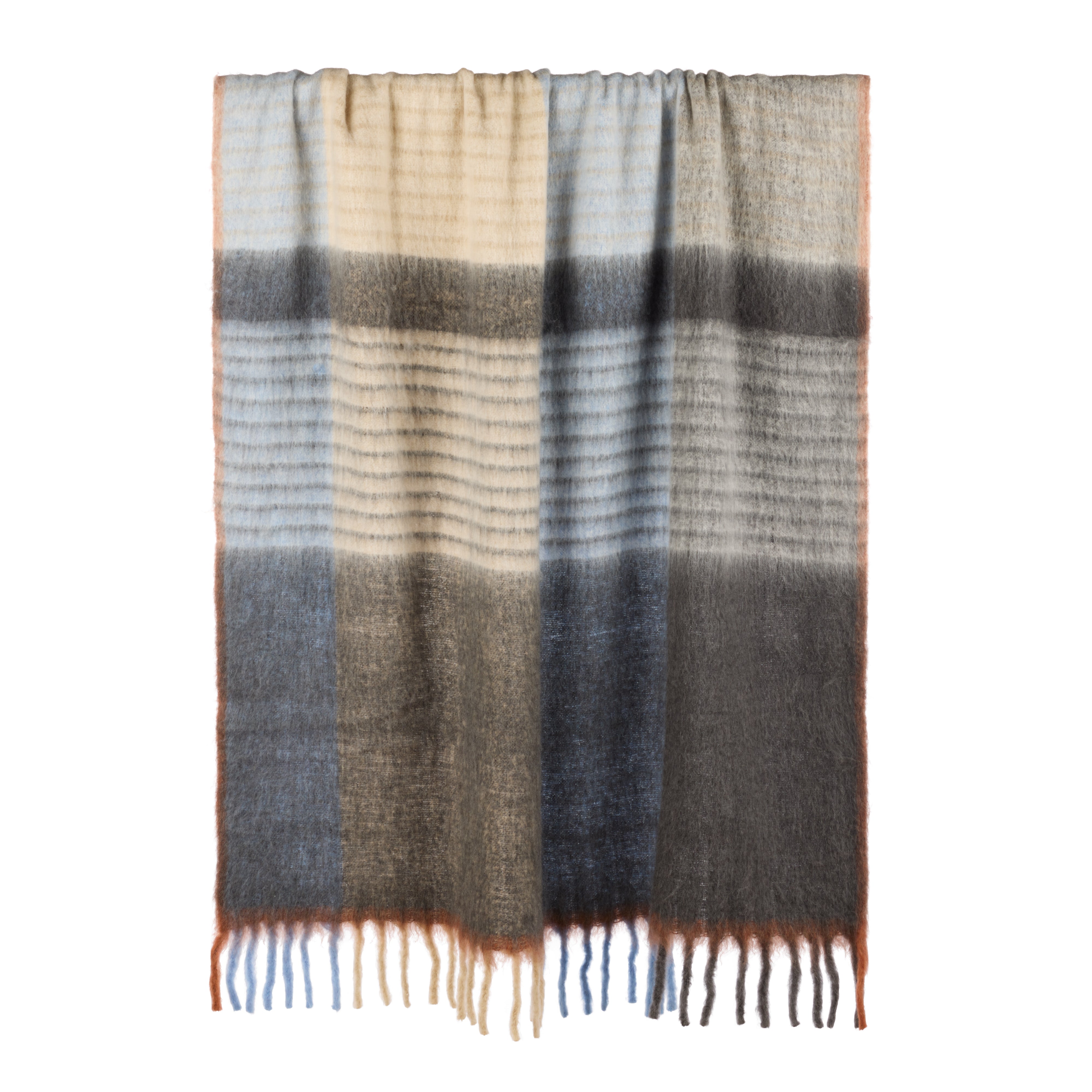 The Jaden Wool Blend Throw is crafted from a soft touch wool, acrylic and polyester blend in a blue and taupe shade patterned with brown stripes.