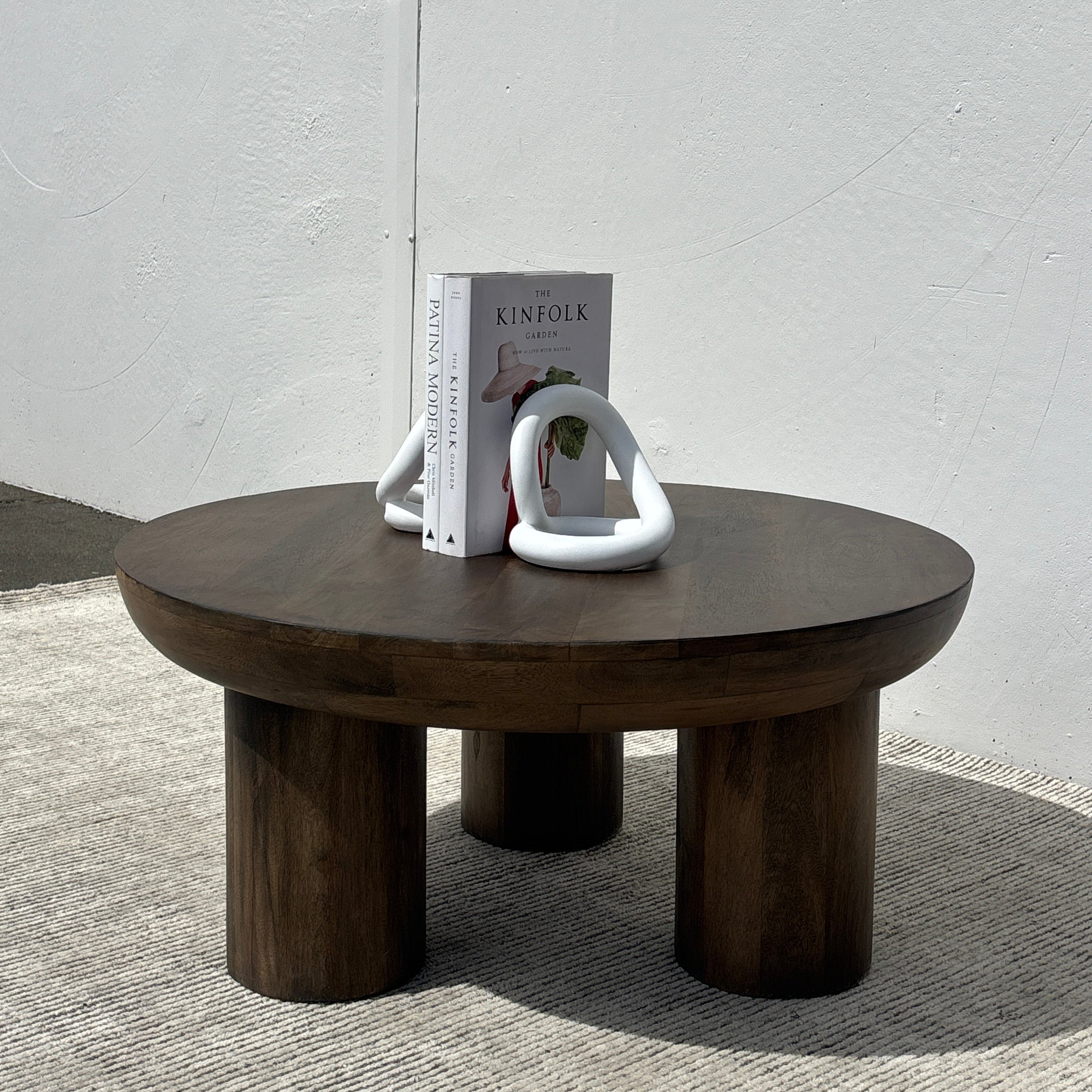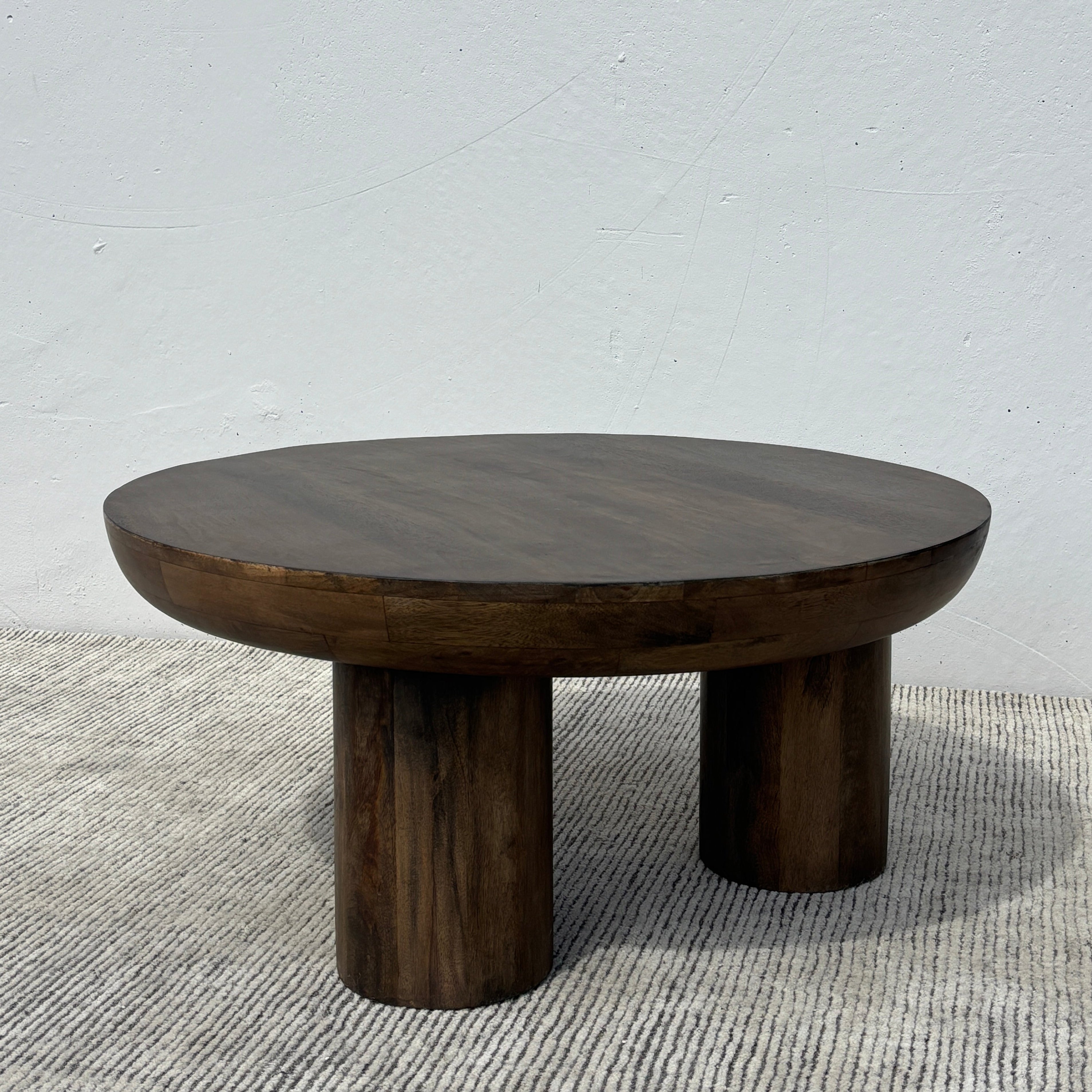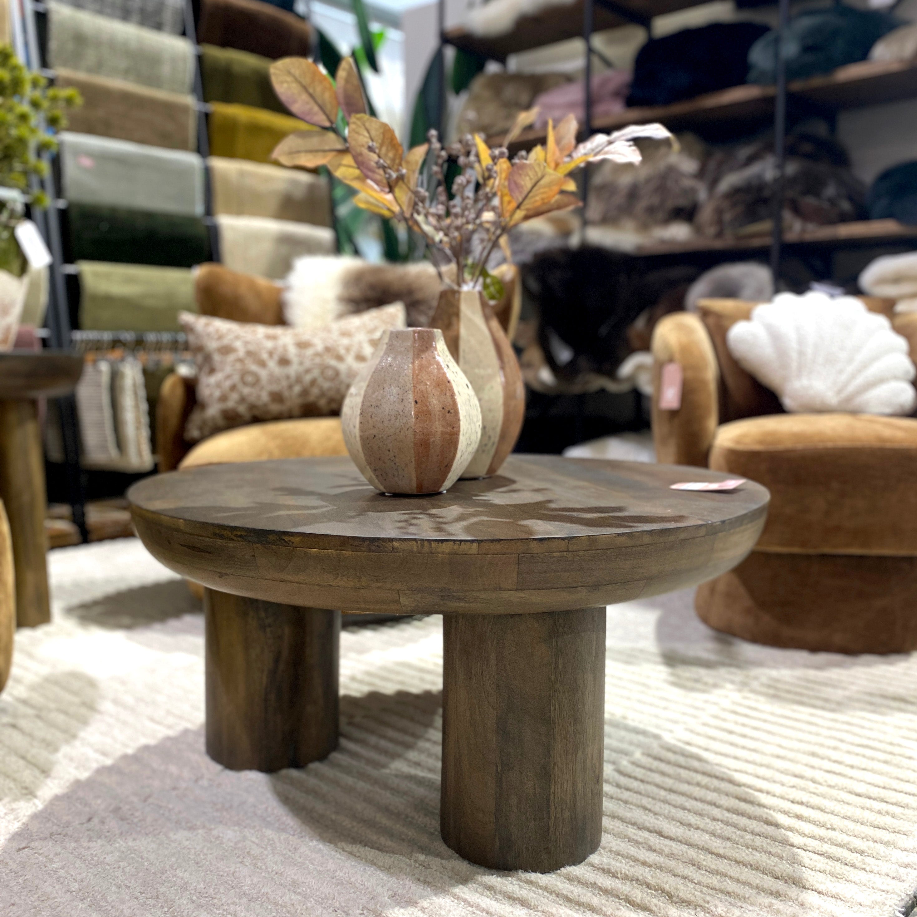 Meet the Juni Coffee Table. This round coffee table features a 3 leg wide column design and tapered-edge round tabletop, crafted in acacia wood and finished in a rich walnut brown for natural warmth. Exuding a contemporary simplicity, the Juni will be a stunning solid centerpiece in any living space – especially when paired with the matching counterpart for the coffee table cluster look.