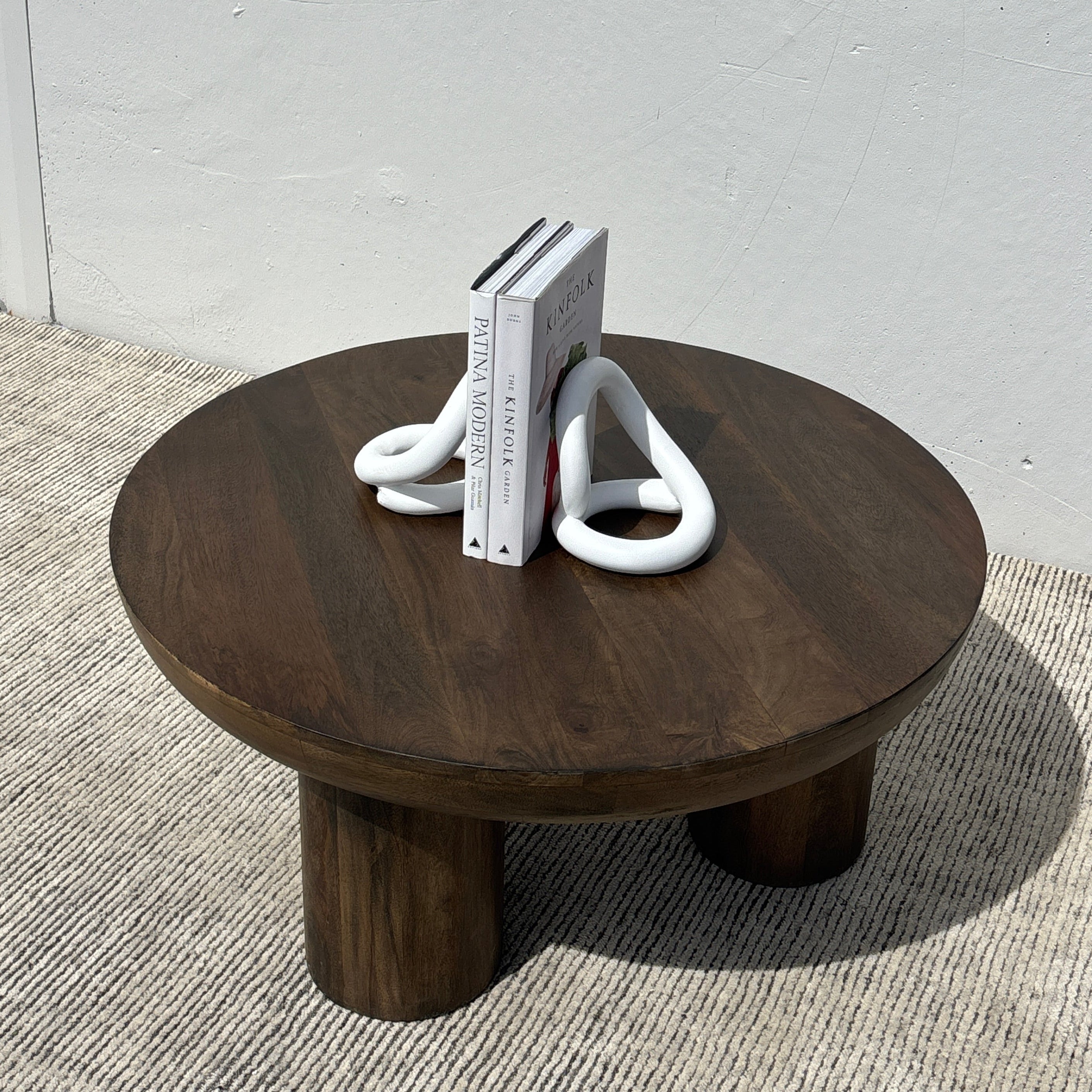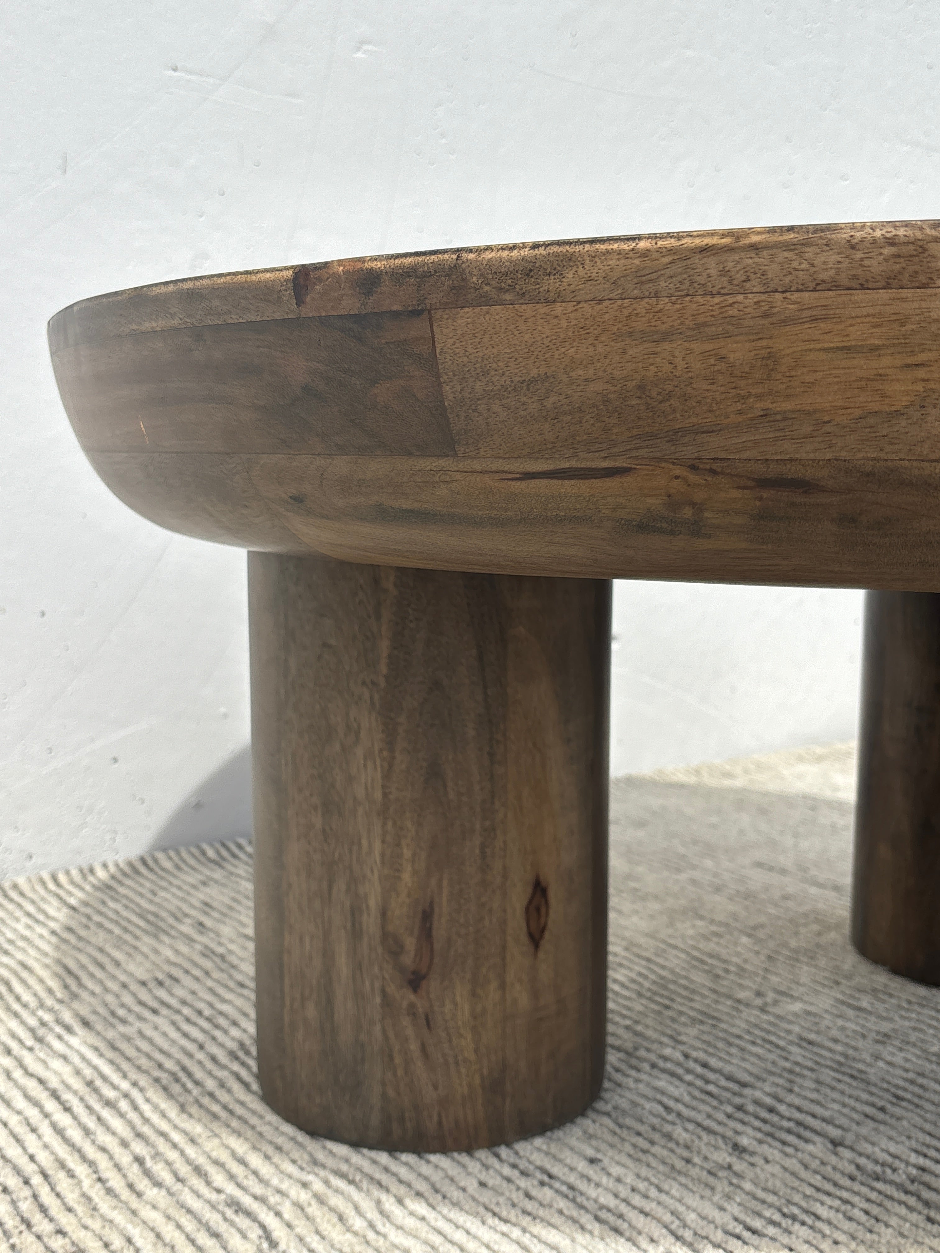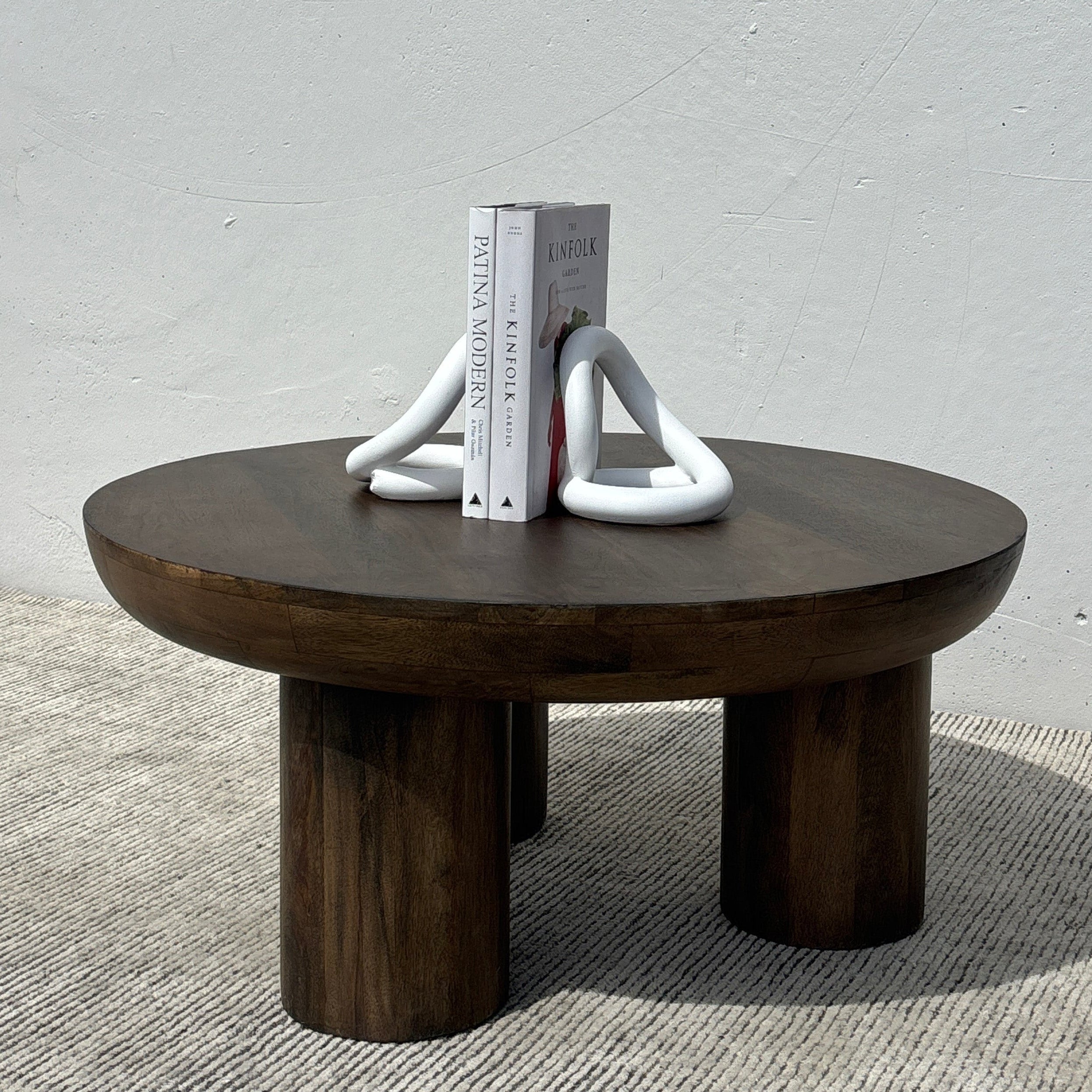 Meet the Juni Coffee Table. This round coffee table features a 3 leg wide column design and tapered-edge round tabletop, crafted in acacia wood and finished in a rich walnut brown for natural warmth. Exuding a contemporary simplicity, the Juni will be a stunning solid centerpiece in any living space – especially when paired with the matching counterpart for the coffee table cluster look.
