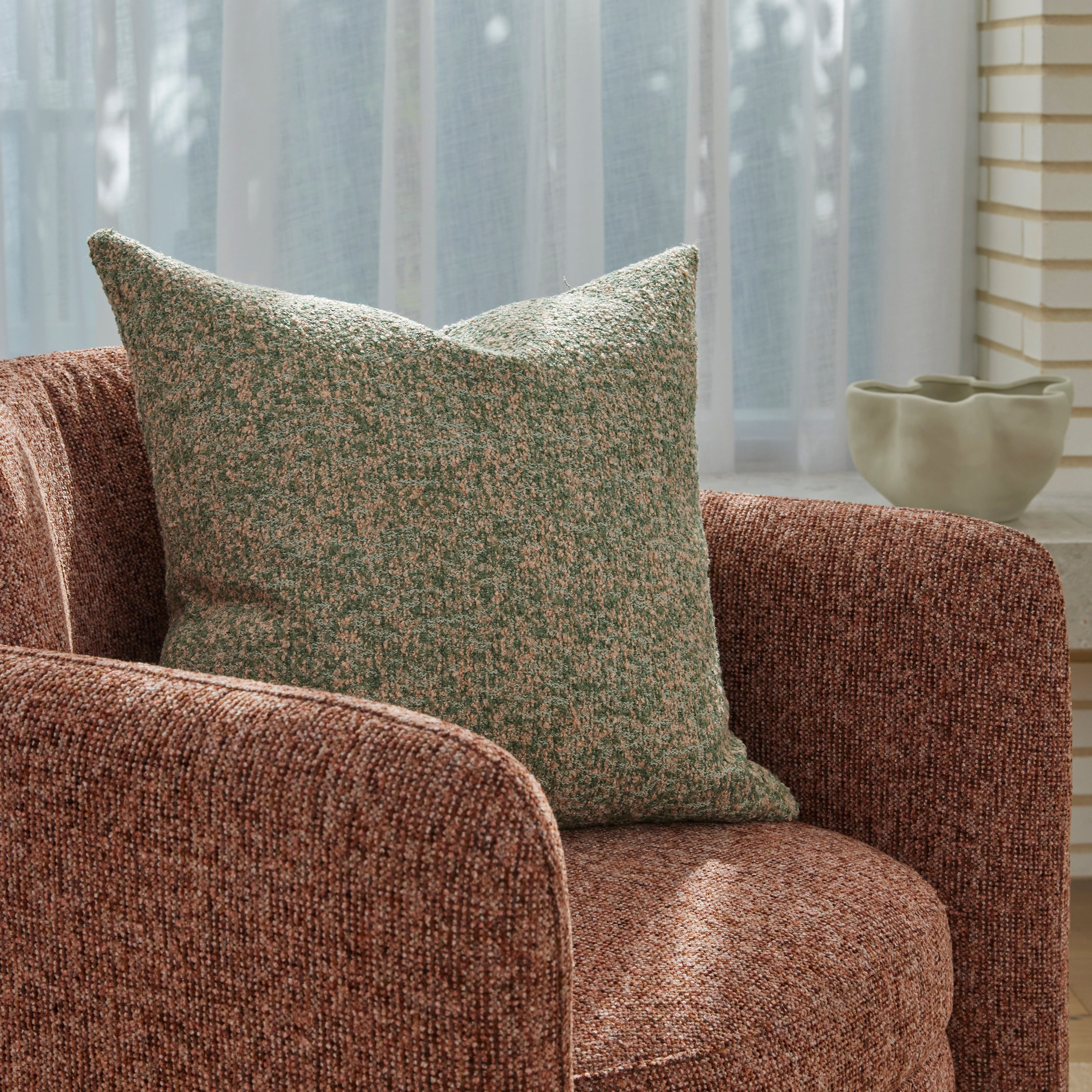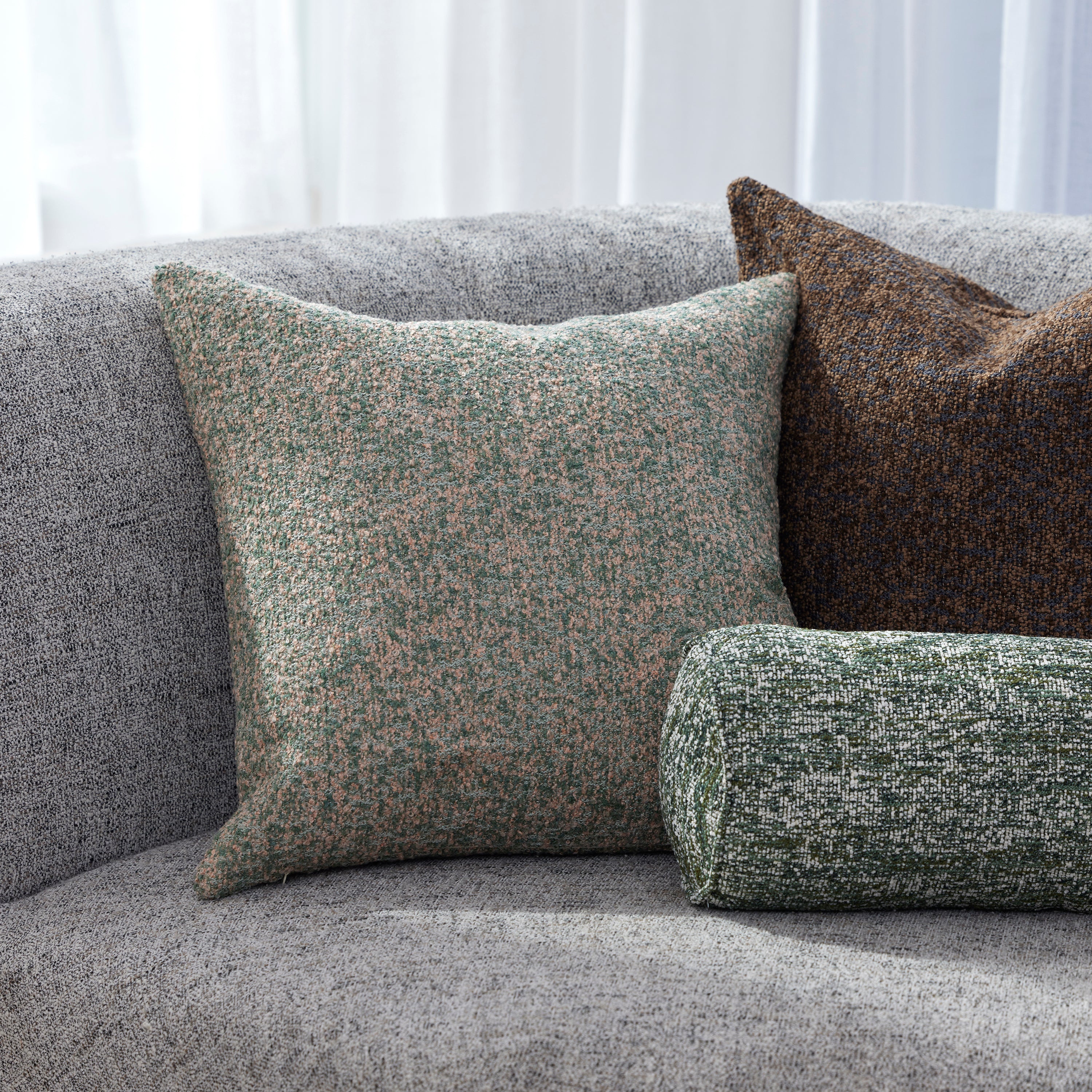 The Koba Cushion in green combines soft boucle fabric with subtle pink tones for a cosy, stylish look. Its removable zip cover makes cleaning simple, perfect for enhancing comfort on any bed, chair, or sofa.