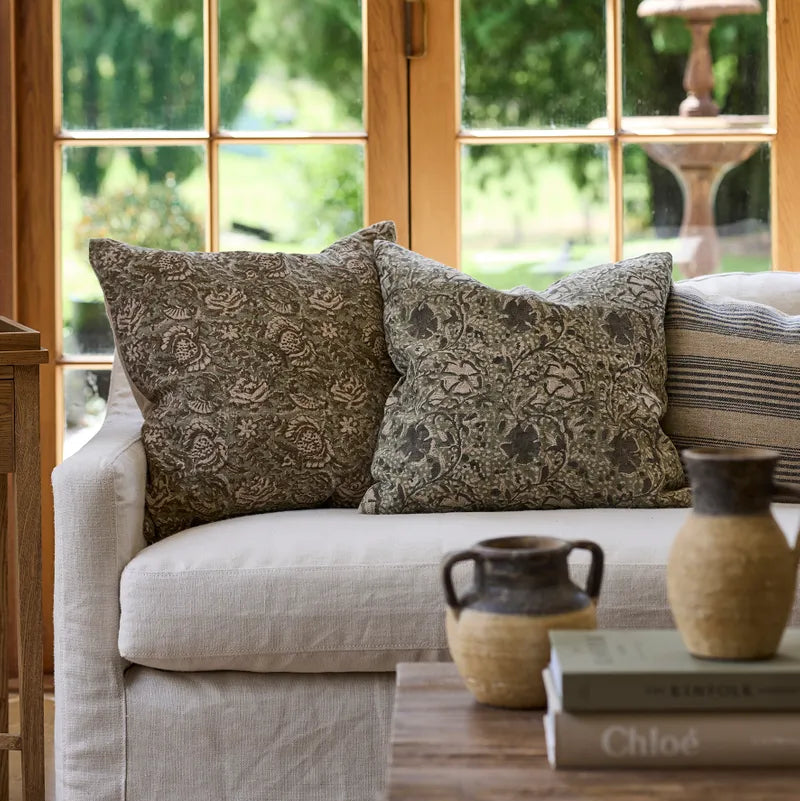 Heritage inspired floral print cushion in soft linen. Perfect for bringing a floral touch into the home in soft muted tones.