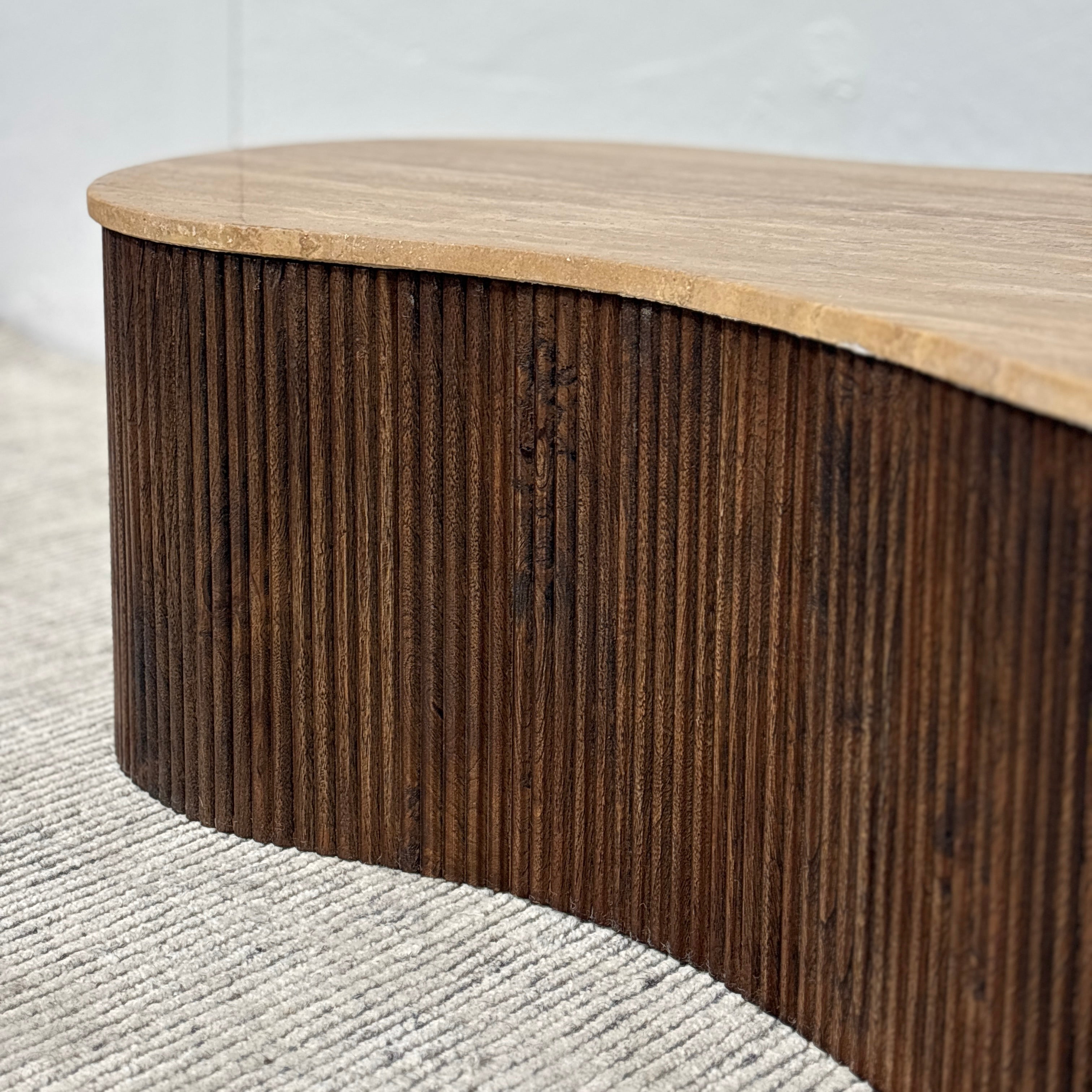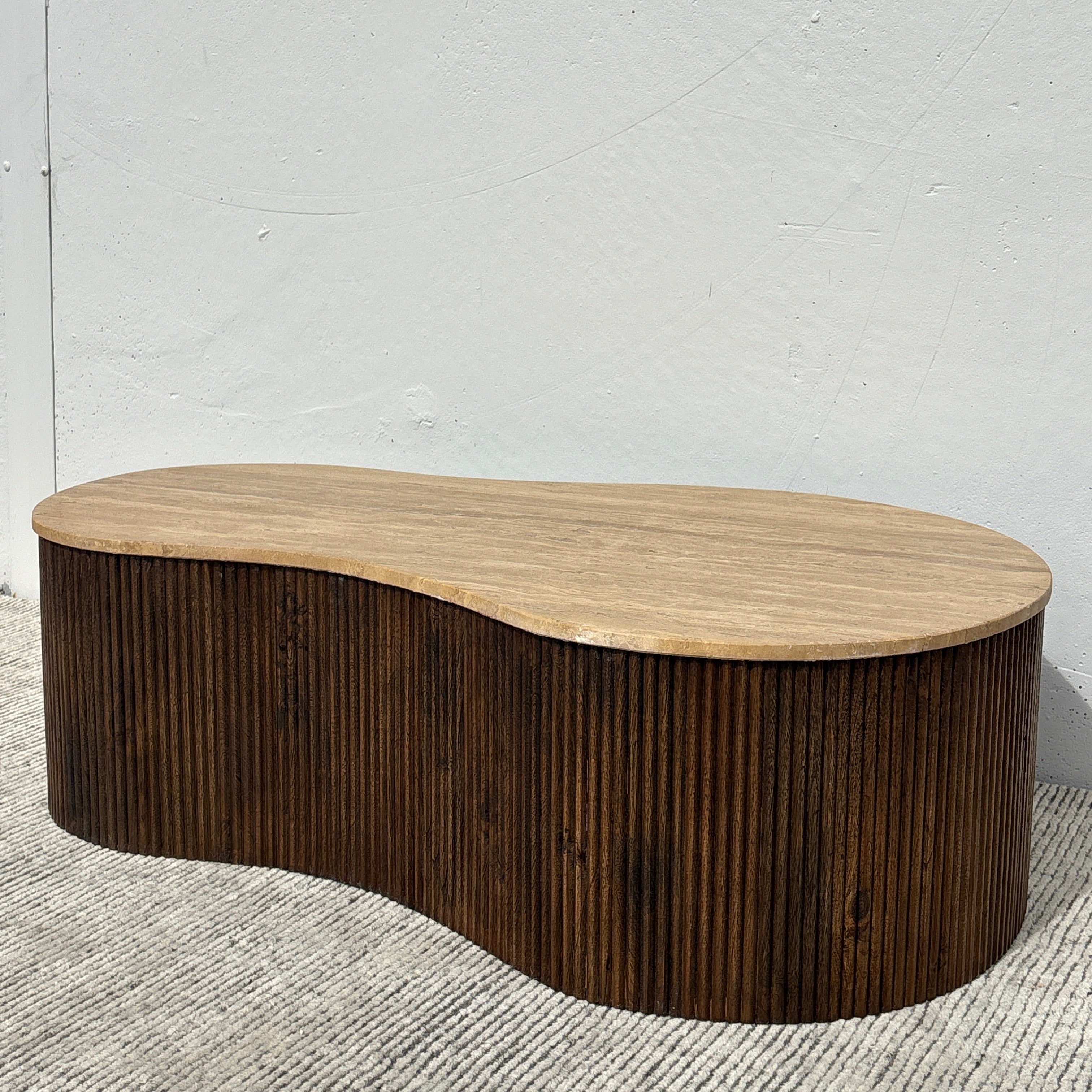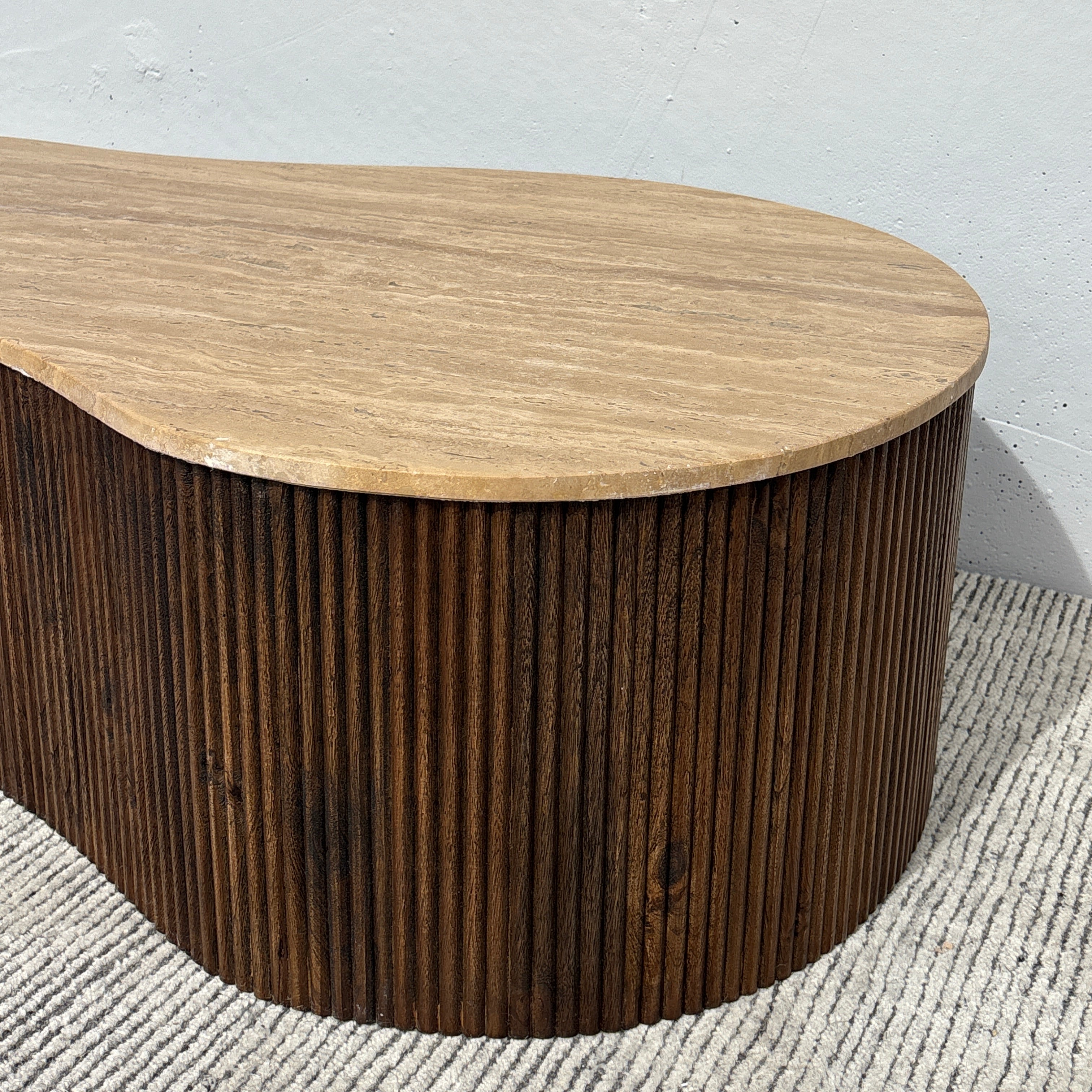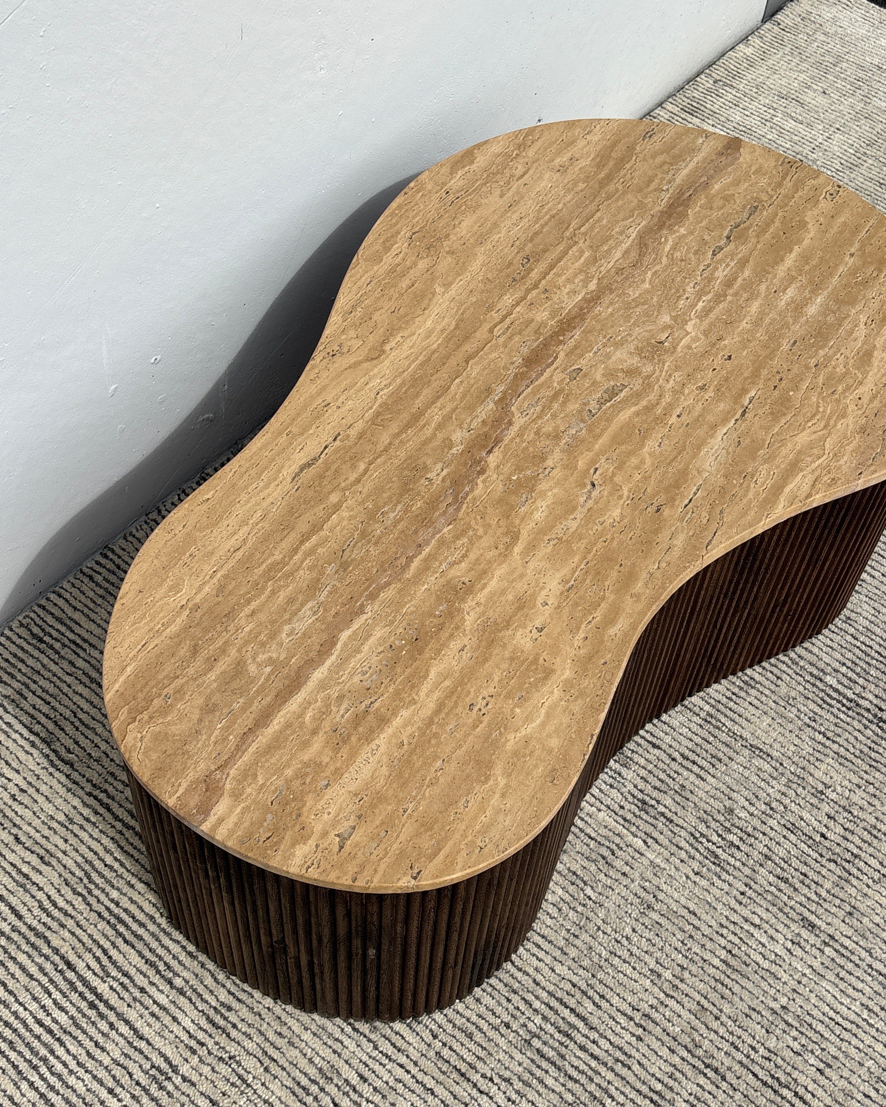 Meet the Luna Travertine Coffee Table. This unique coffee table features a fluid, organic silhouette, with stunning travertine stone top set upon a ribbed acacia wood base. Pairing mid-century warmth with a modern feel, this stunning coffee table will be the centerpiece of any living space.