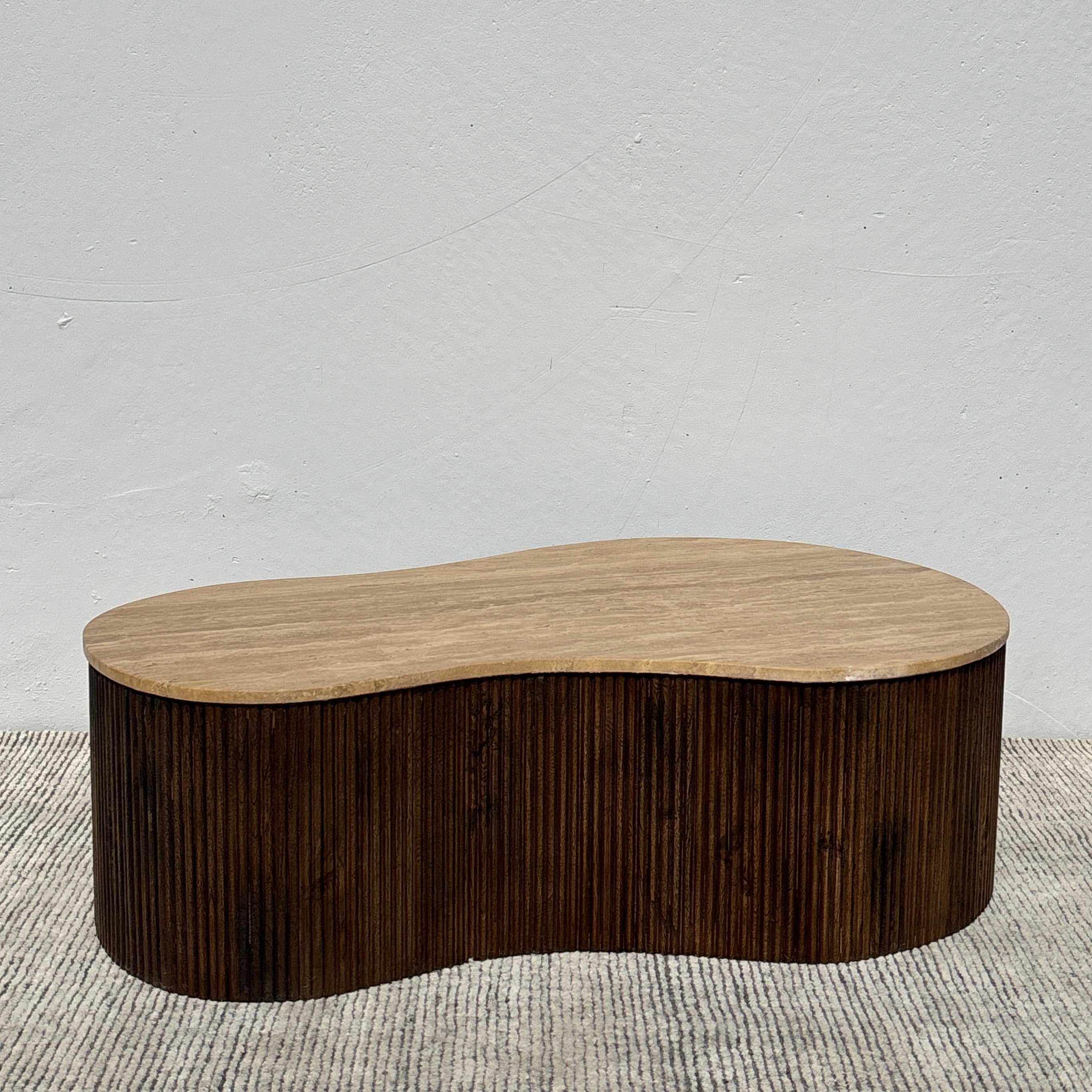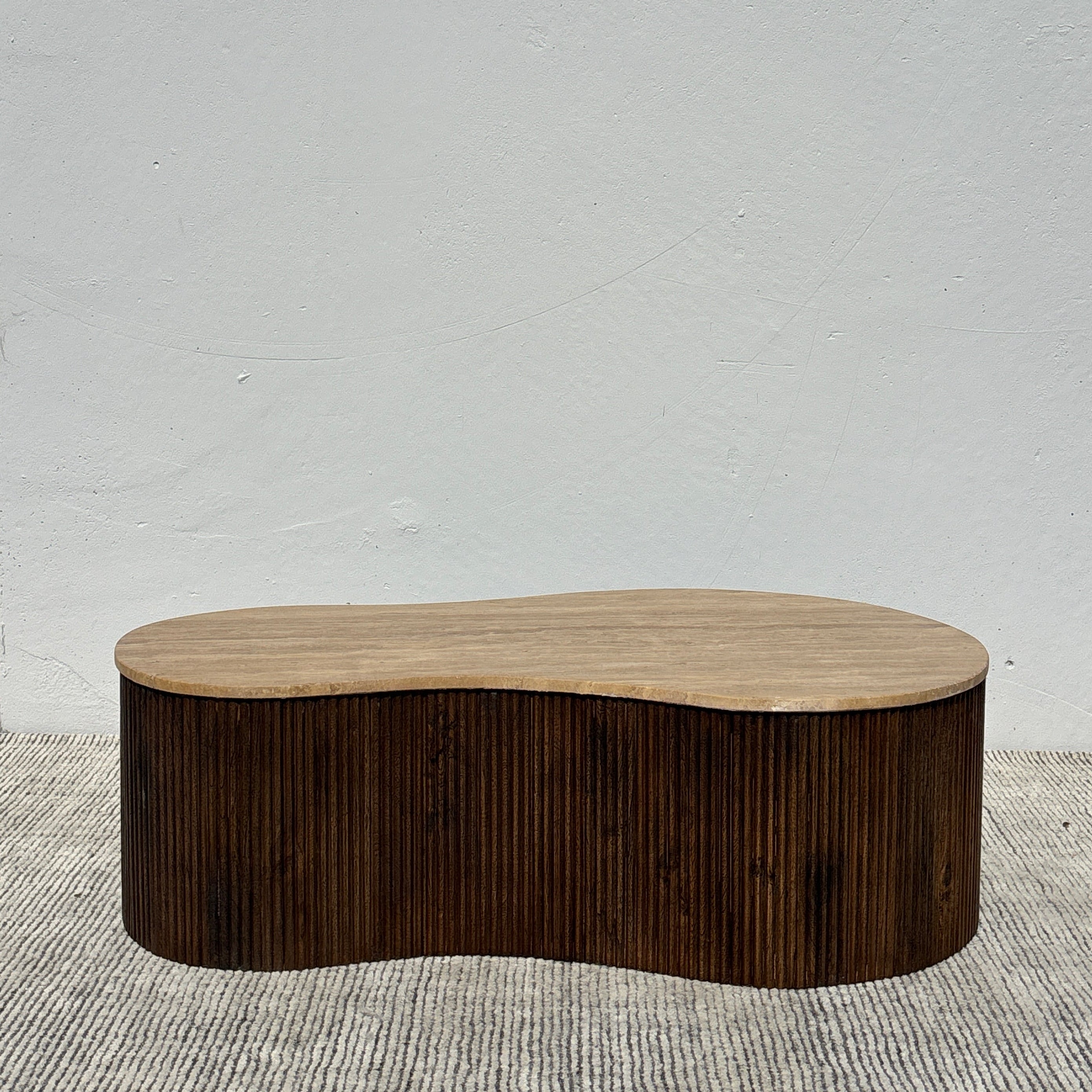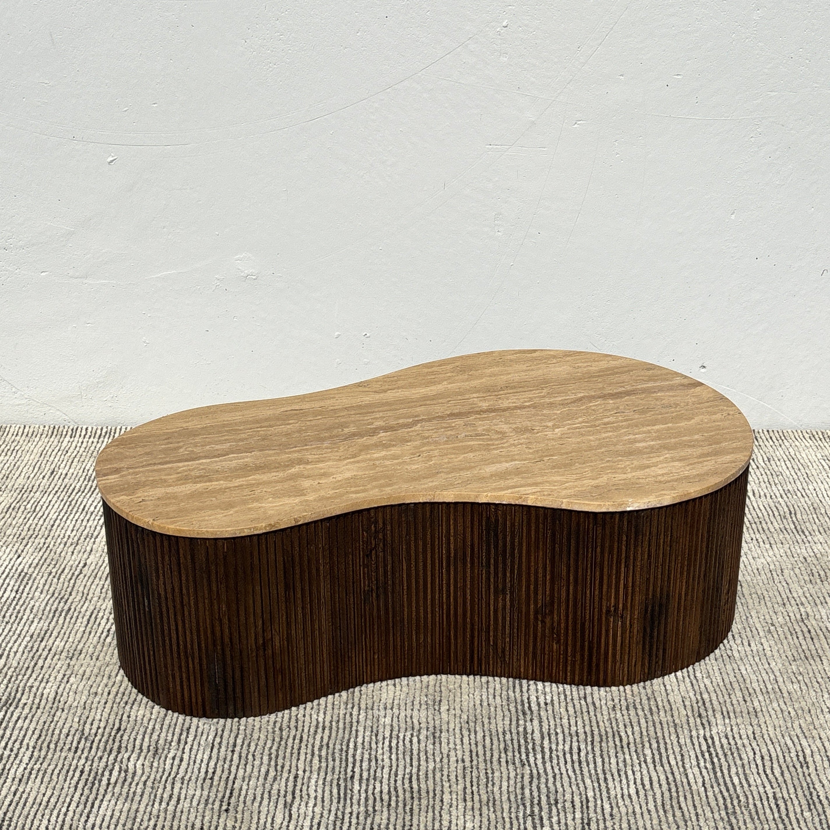Meet the Luna Travertine Coffee Table. This unique coffee table features a fluid, organic silhouette, with stunning travertine stone top set upon a ribbed acacia wood base. Pairing mid-century warmth with a modern feel, this stunning coffee table will be the centerpiece of any living space.