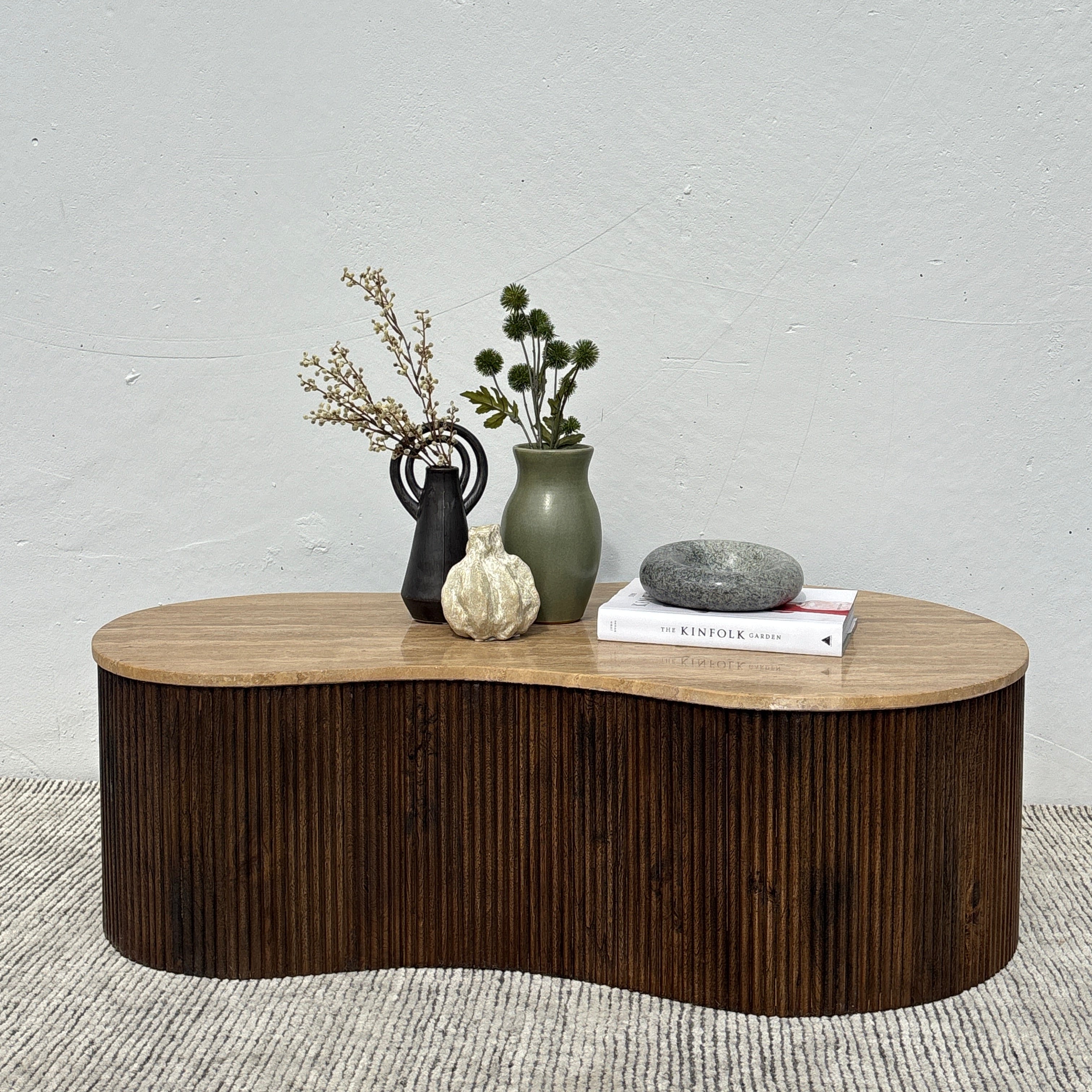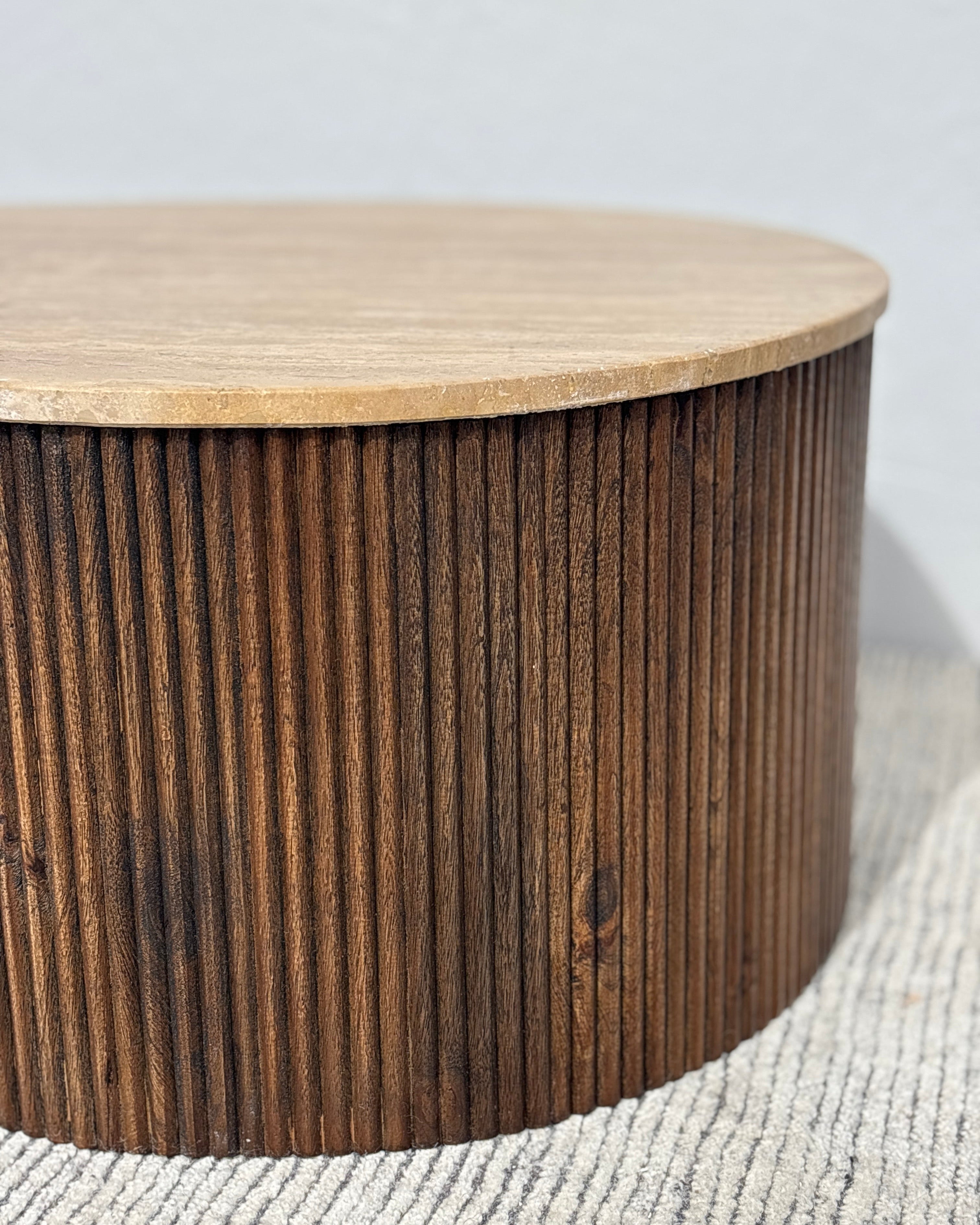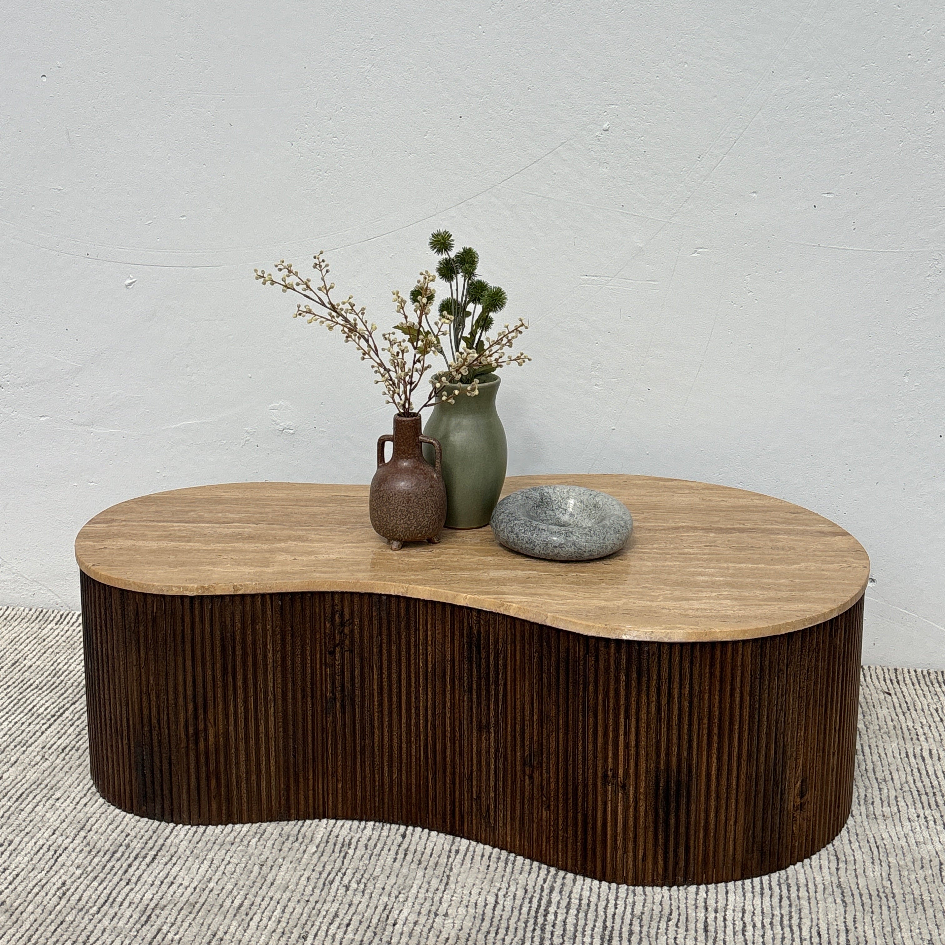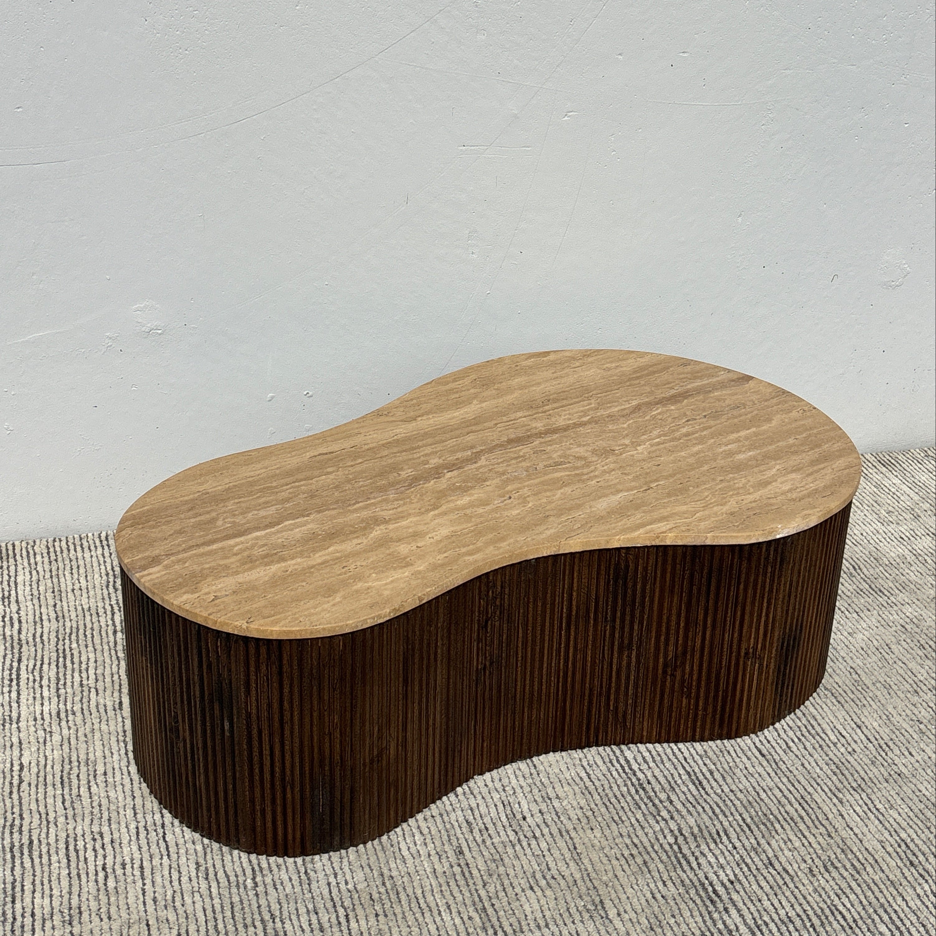 Meet the Luna Travertine Coffee Table. This unique coffee table features a fluid, organic silhouette, with stunning travertine stone top set upon a ribbed acacia wood base. Pairing mid-century warmth with a modern feel, this stunning coffee table will be the centerpiece of any living space.