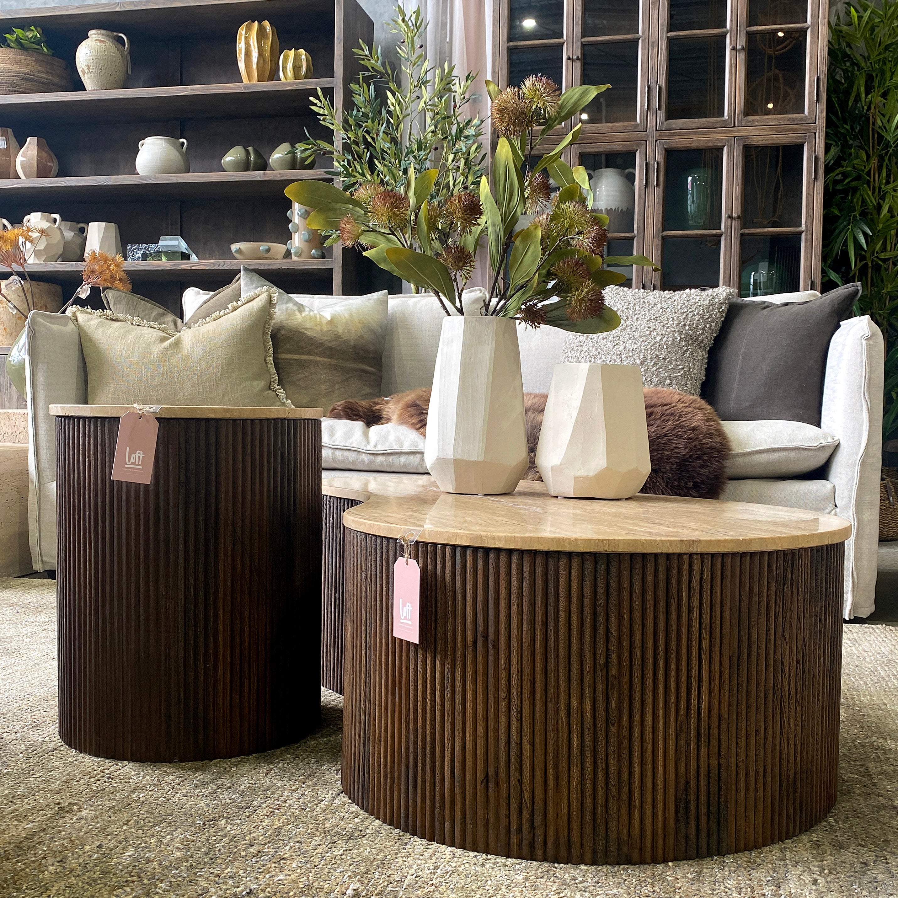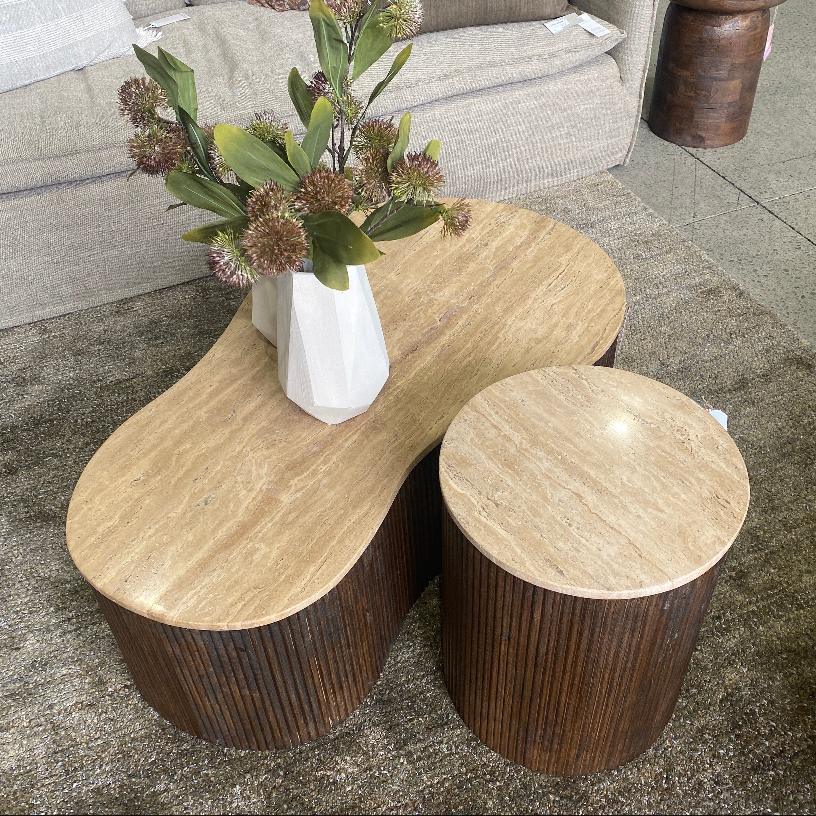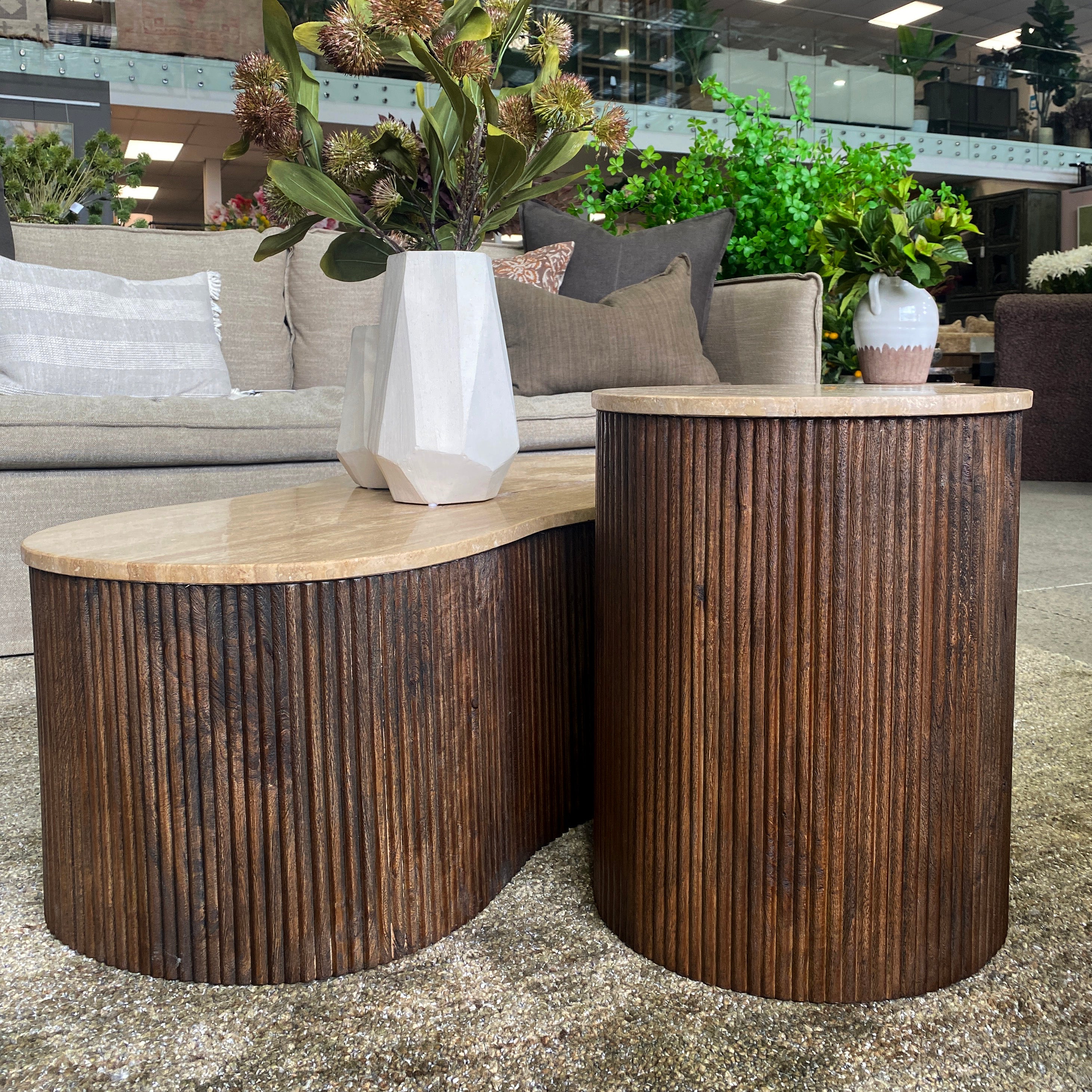 Meet Luna – this unique style features a fluid, organic coffee table silhouette and round side table counterpart, with stunning travertine stone top set upon a ribbed acacia wood base. Pairing mid-century warmth with a modern feel, these stunning tables will be the centerpiece of any living space.