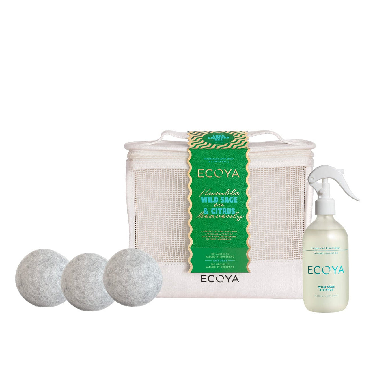 Transform your laundry routine from humble to heavenly with the ECOYA Wild Sage & Citrus Laundry Set. This premium set includes a Linen Spray to refresh and add a final layer of luxury to your linens, along with three 100% New Zealand wool Dryer Balls that reduce drying time while subtly infusing your laundry with the uplifting Wild Sage & Citrus fragrance.