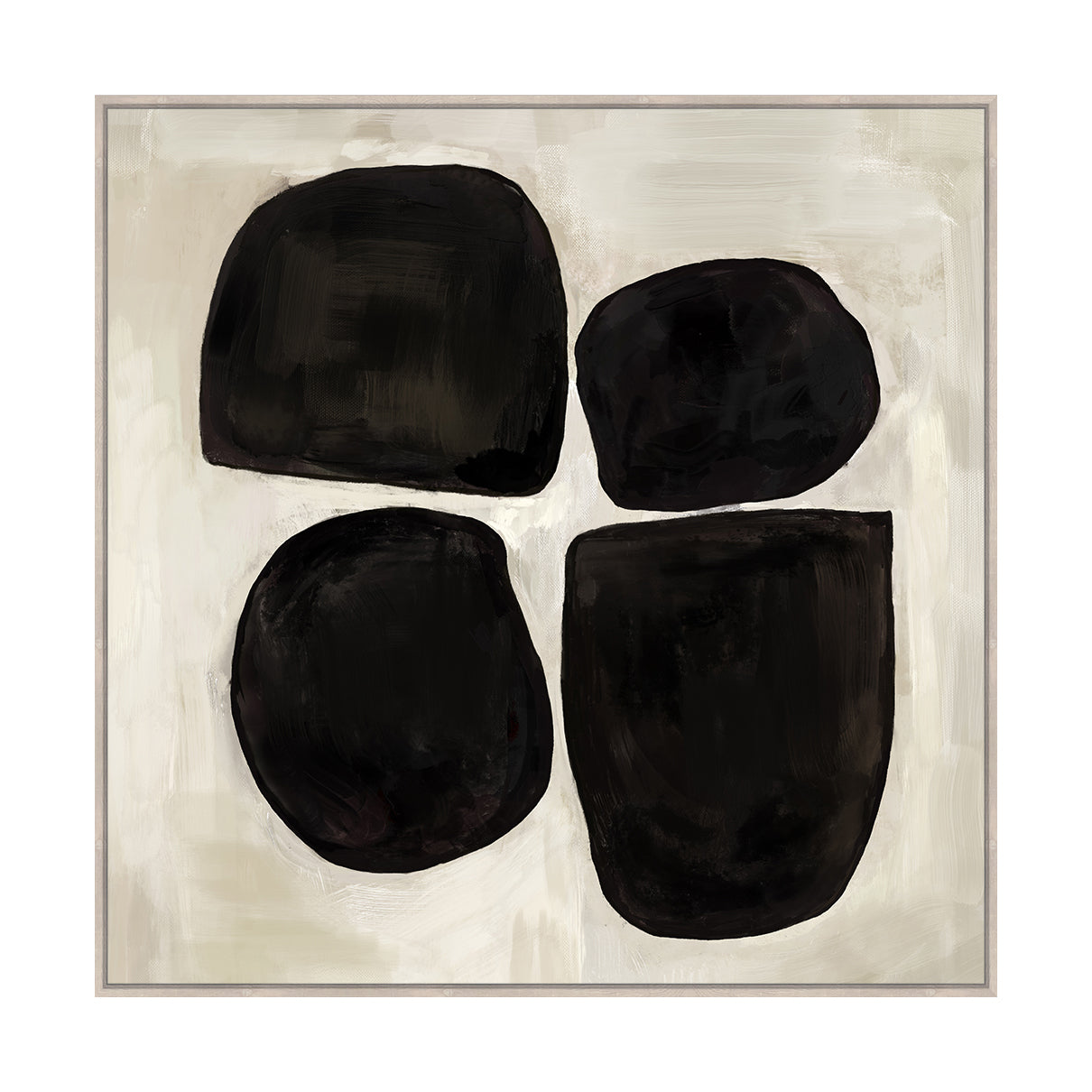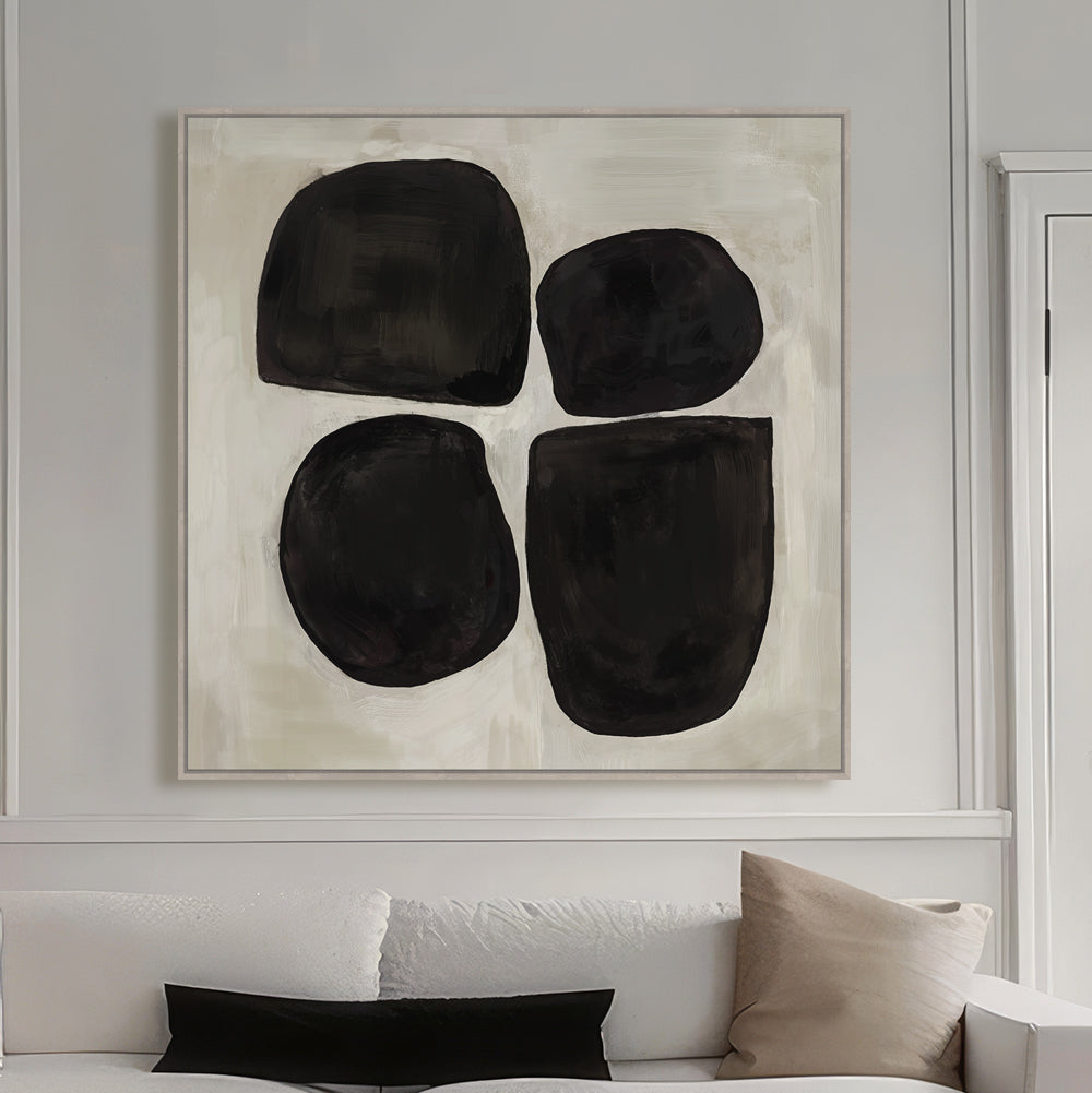 Bold abstract forms in striking black create visual intrigue on this contemporary canvas. Set against a soft chalky backdrop and housed in a natural light frame, this piece brings modern sophistication to any space. The abstract composition works beautifully as a standalone statement or as part of a gallery wall arrangement.