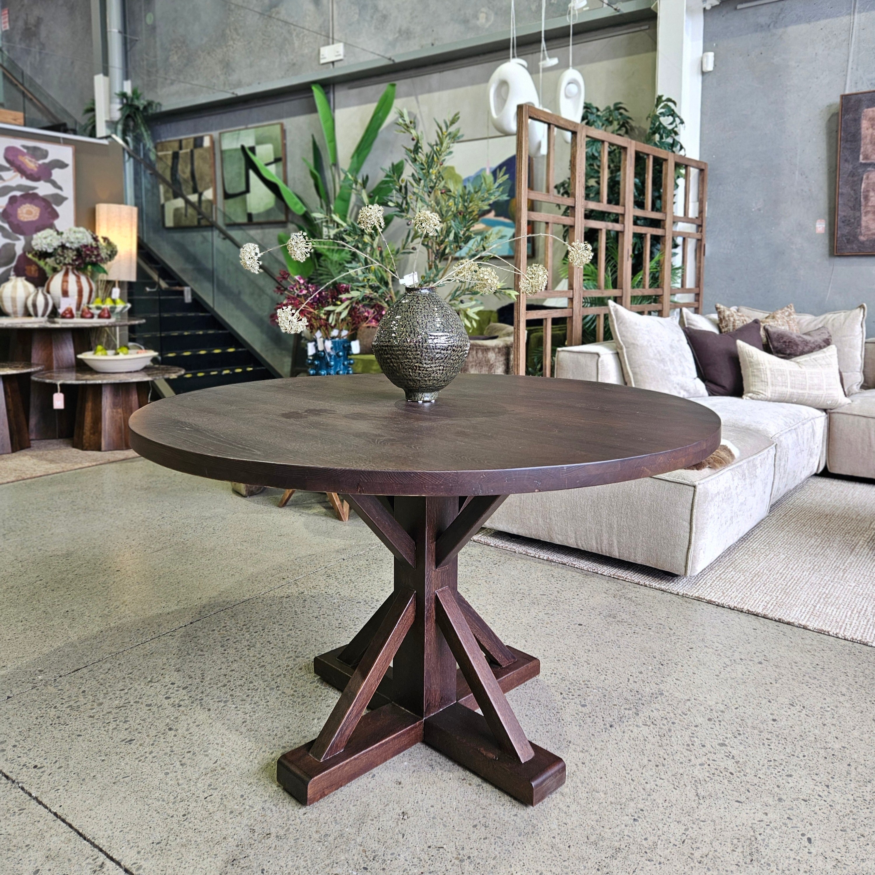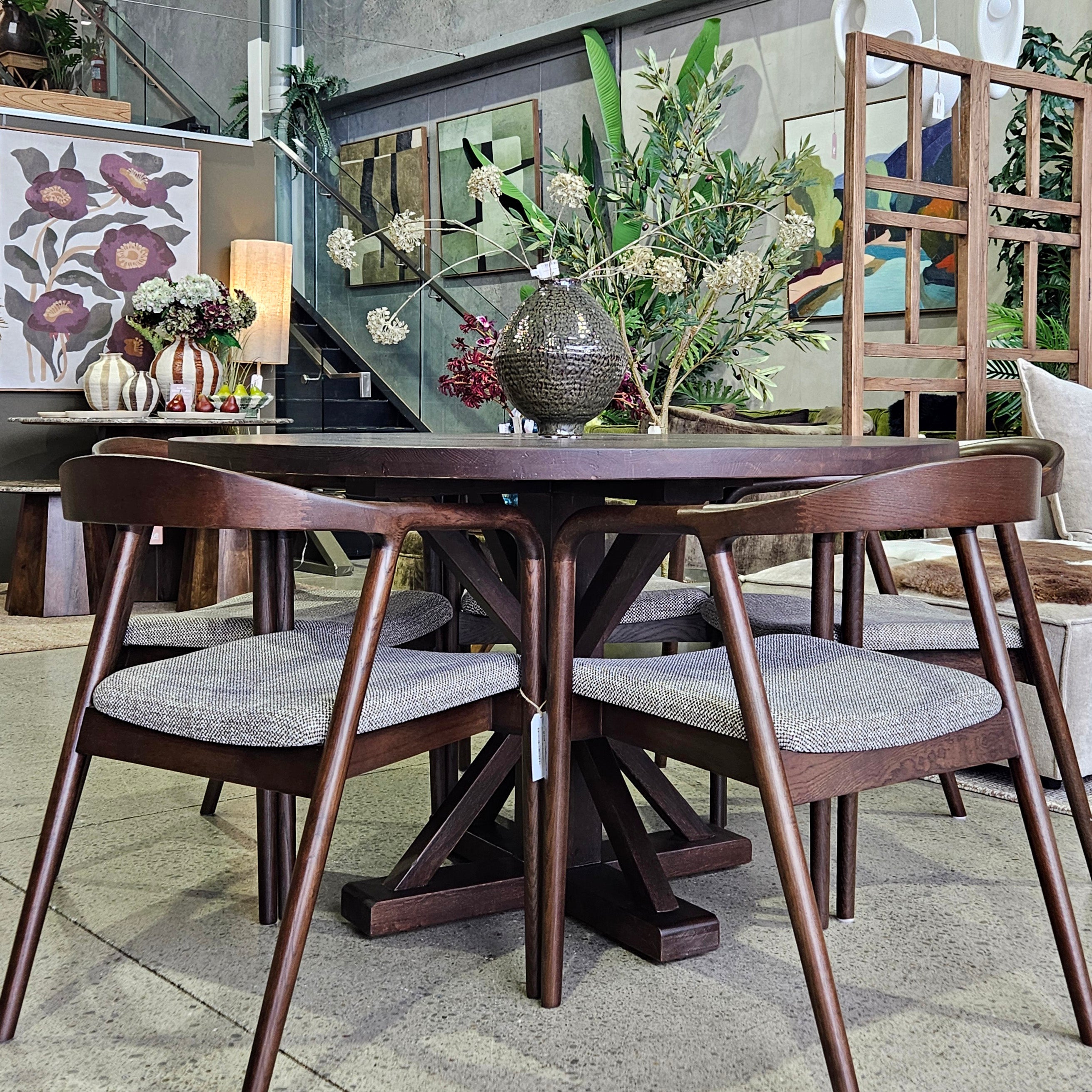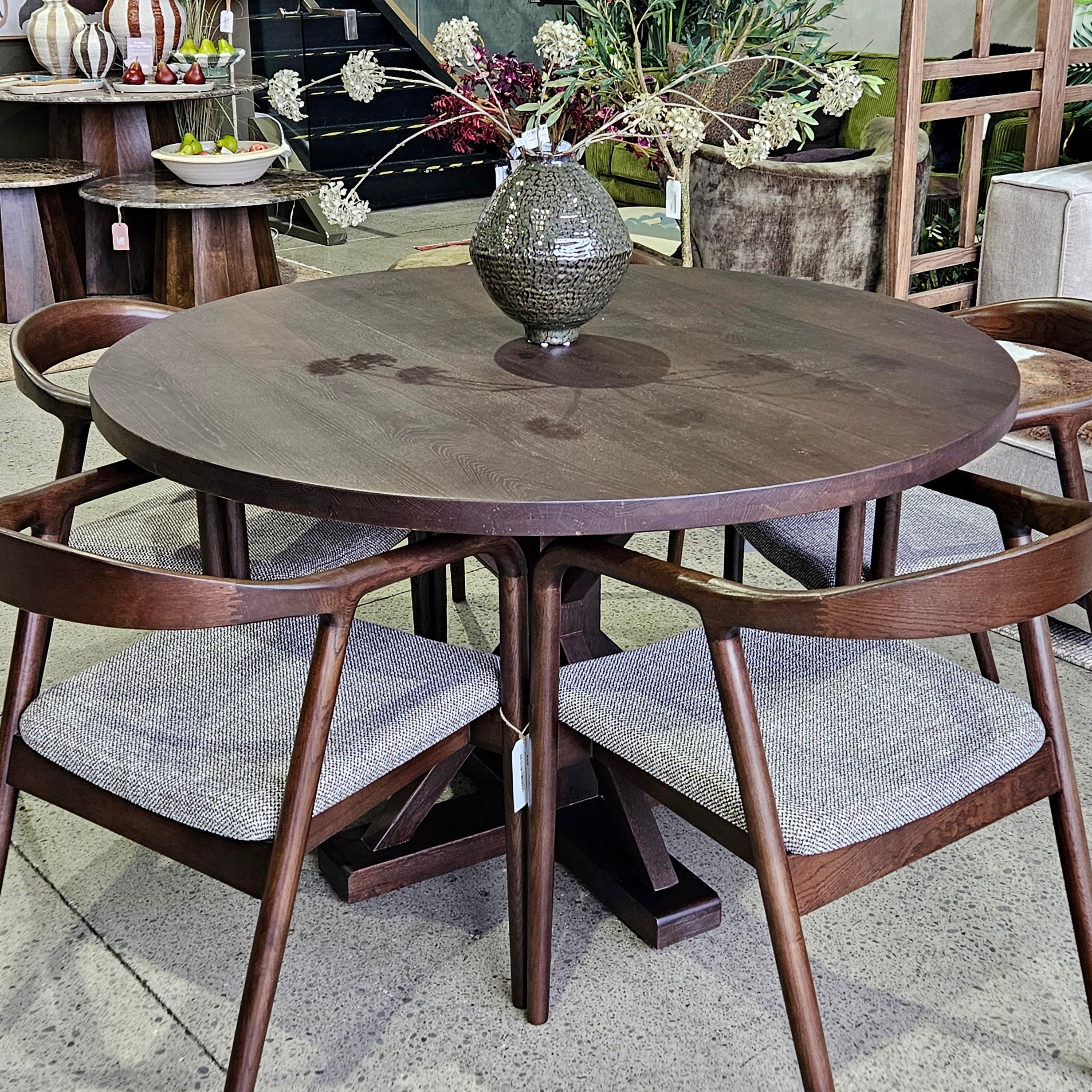 Introducing the Mondrian Round Dining Table - bringing timeless elegance to your dining space with striking dark mammoth finish - a brand new colour to Loft - on premium solid oak wood. The rich, deep tones of this colour finish enhance the natural grain of the solid oak, creating a sophisticated focal point that complements both contemporary and classic interiors. Perfect for family gatherings and entertaining, this beautiful table features a durable lacquer surface that requires no oiling or maintenance – combining timeless style with everyday functionality.