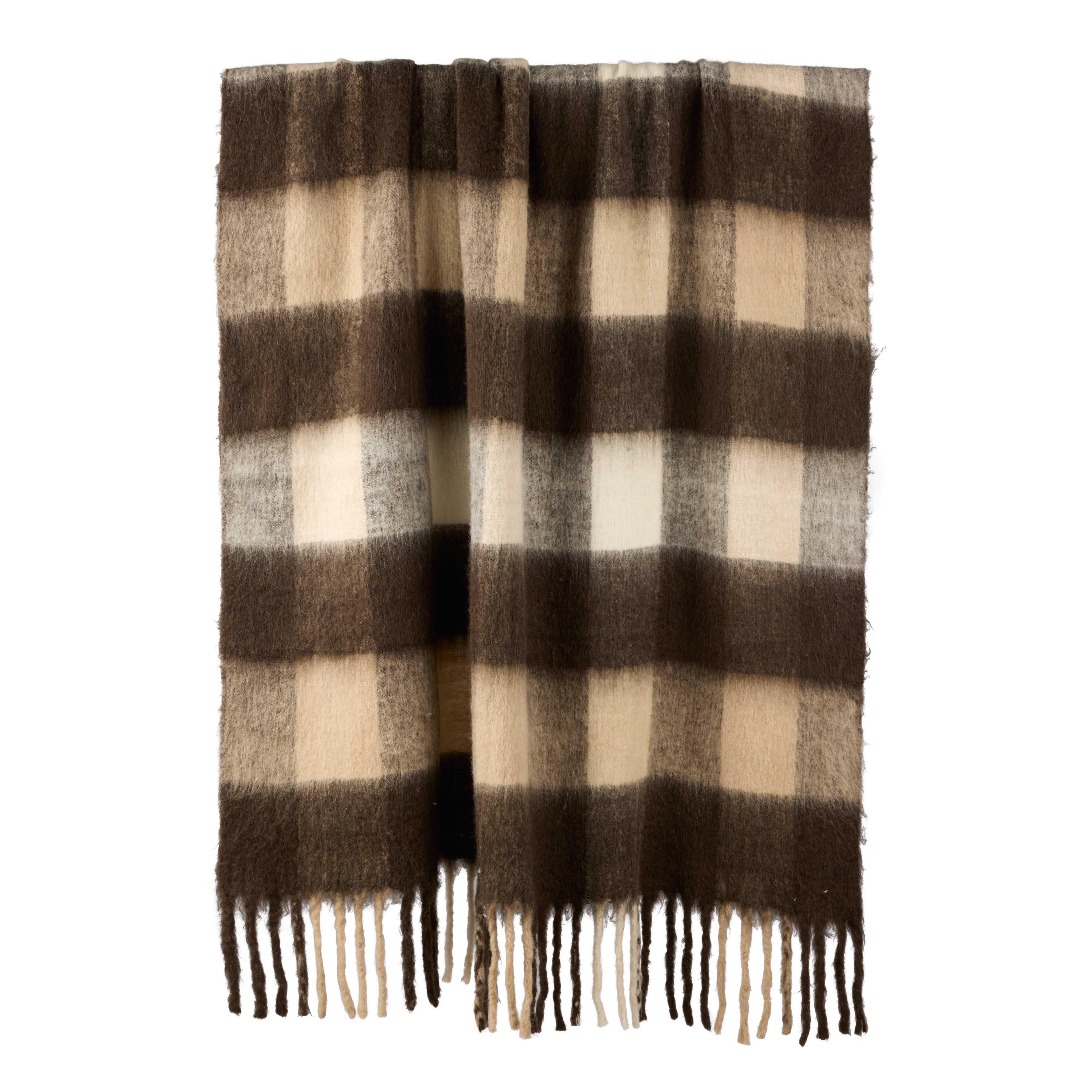 The Morgan Wool Blend Throw is crafted from a soft touch wool, acrylic and polyester blend in a brown, taupe and white checkered pattern.
