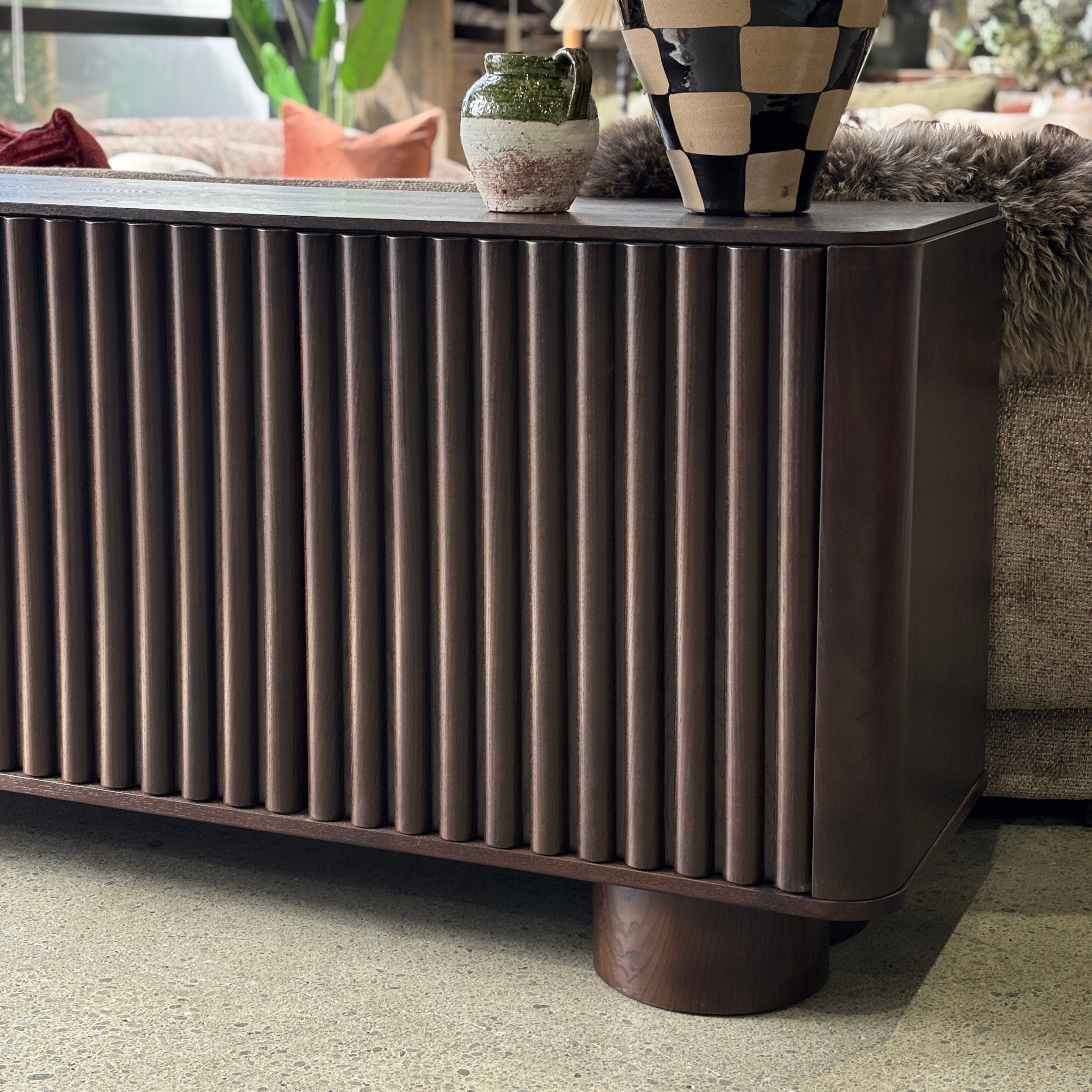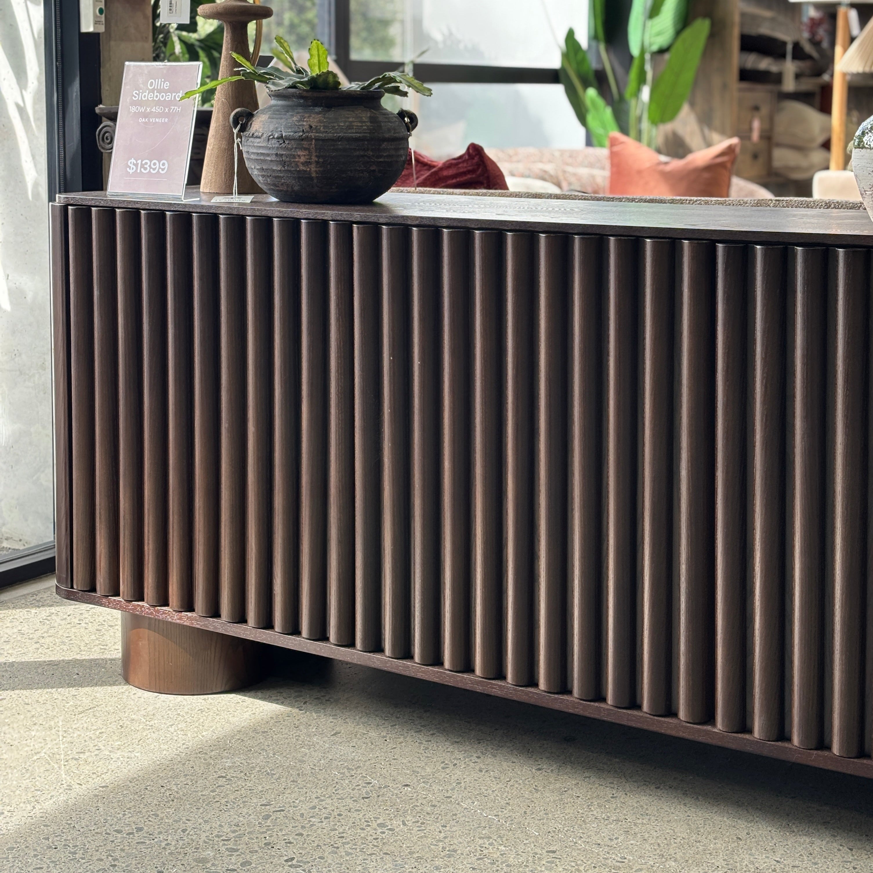 The chic Ollie Sideboard is a midcentury-inspired modernist design – featuring gorgeous ribbed detailing, in a beautiful walnut-toned oak veneer finish with solid ash wood column leg. With three doors that access internal shelving – making it a great piece for maximising your storage needs, even in a smaller space!