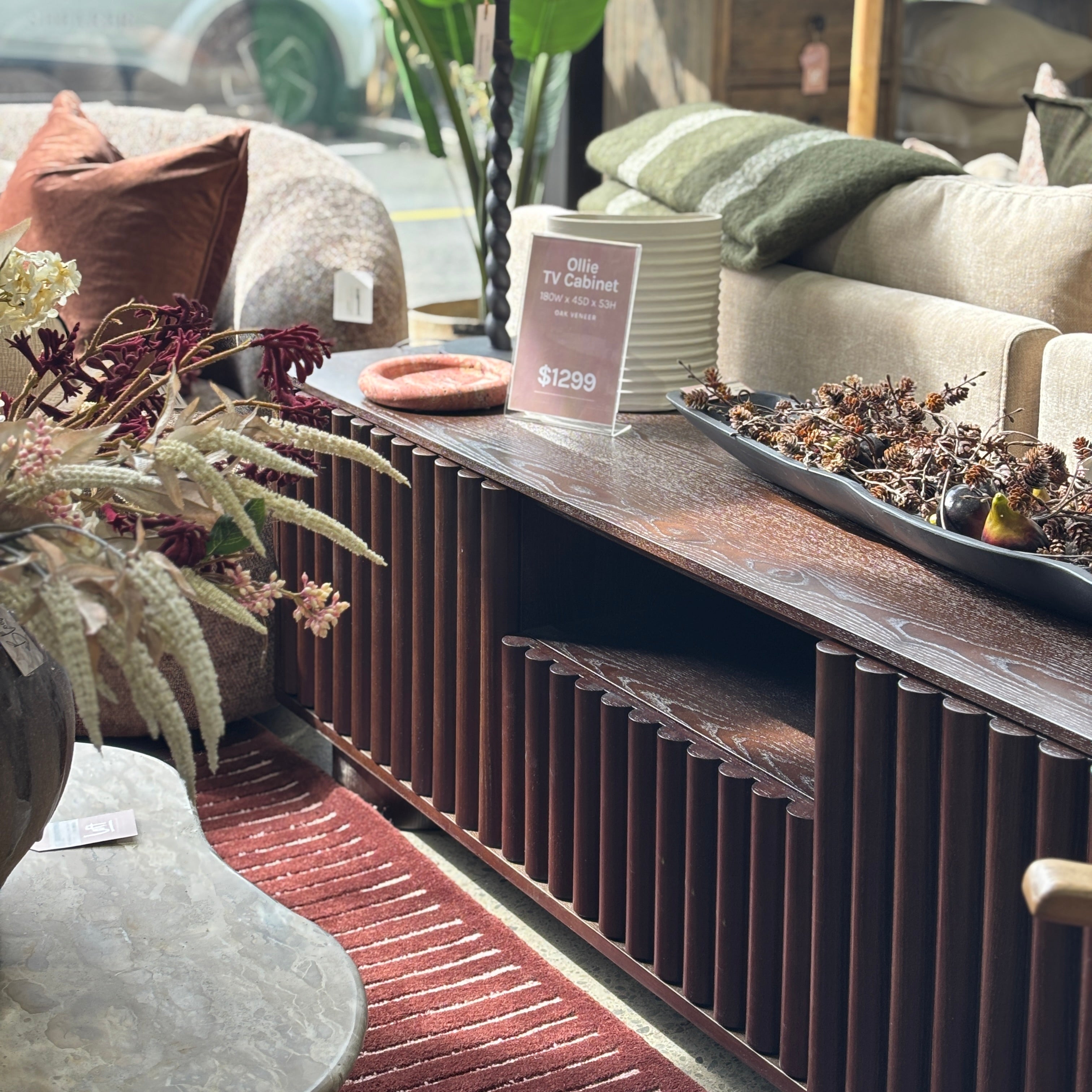 The chic Ollie TV Cabinet is a midcentury-inspired modernist design – featuring gorgeous ribbed detailing, in a beautiful walnut-toned oak veneer finish with solid ash wood column leg. With open centre shelf, middle drawer and two doors with inner shelving – making it a great piece for maximising your entertainment storage, even in a smaller space!