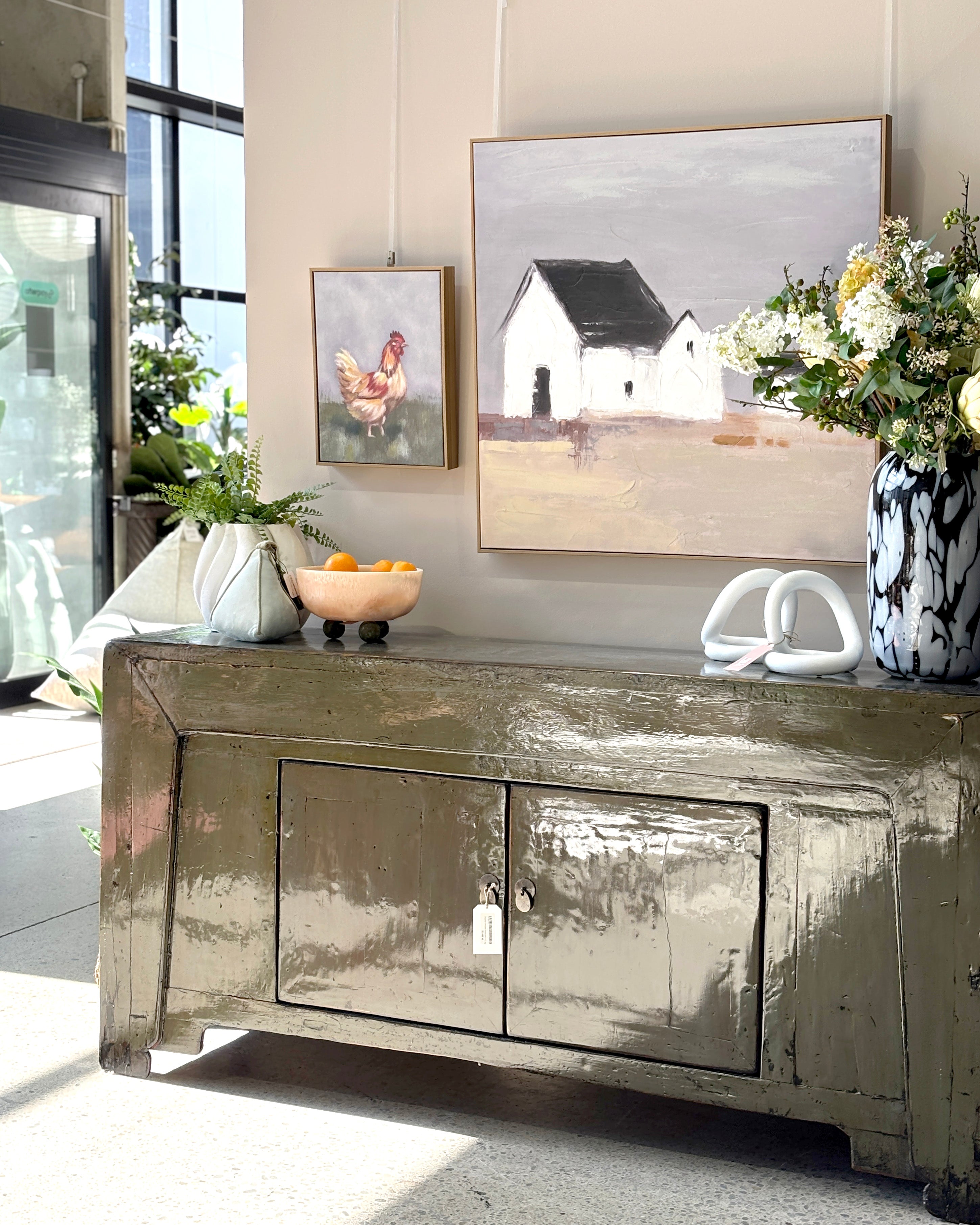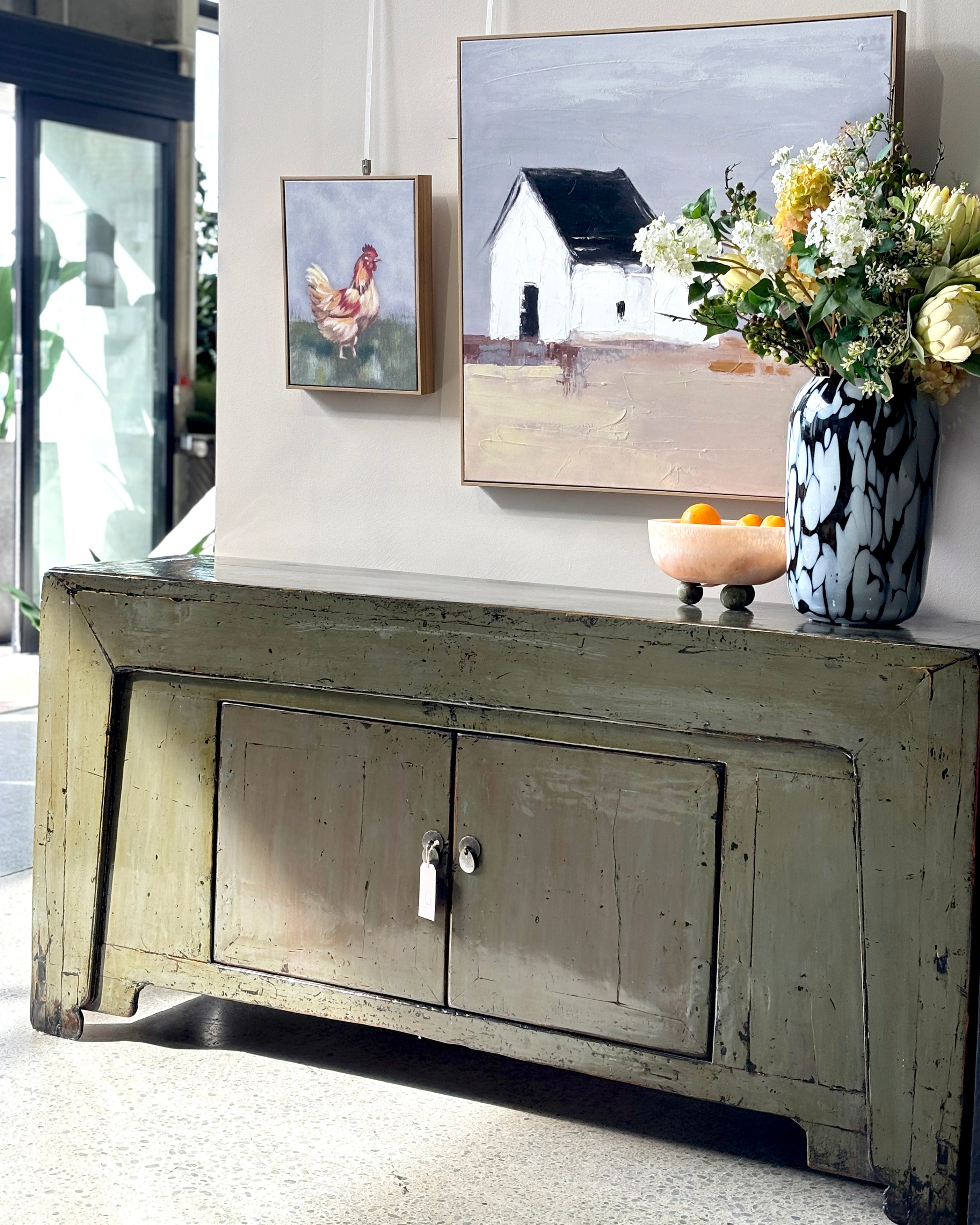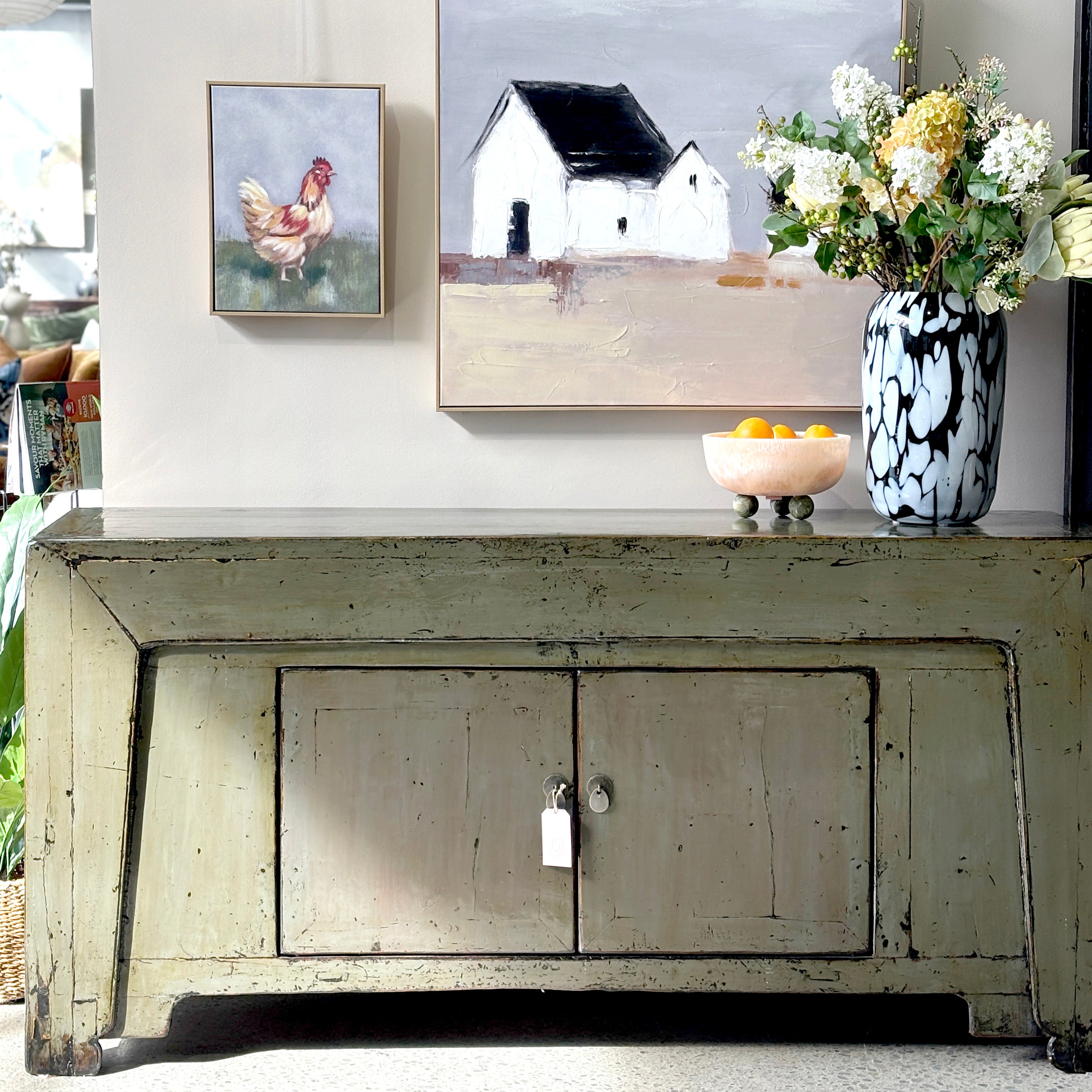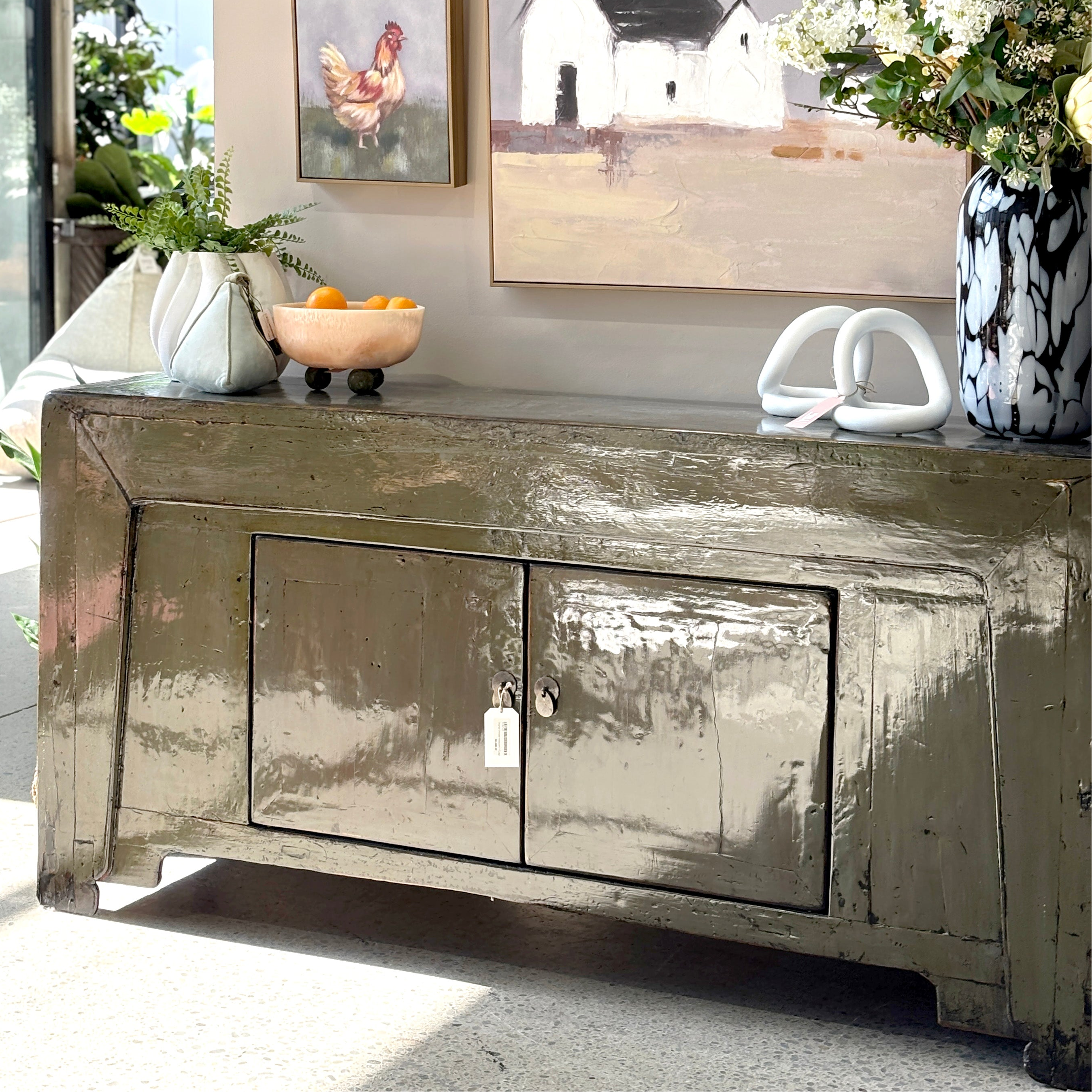 This one of a kind Original Chinese Sideboard in a sage green painted finish originates from the region of Shanxi circa 1920. Featuring authentic wear and tear from their previous life, these pieces are lovingly restored, finished with a lacquer finish, to highlight their unique beauty and rich history and bring timeless character to your home.