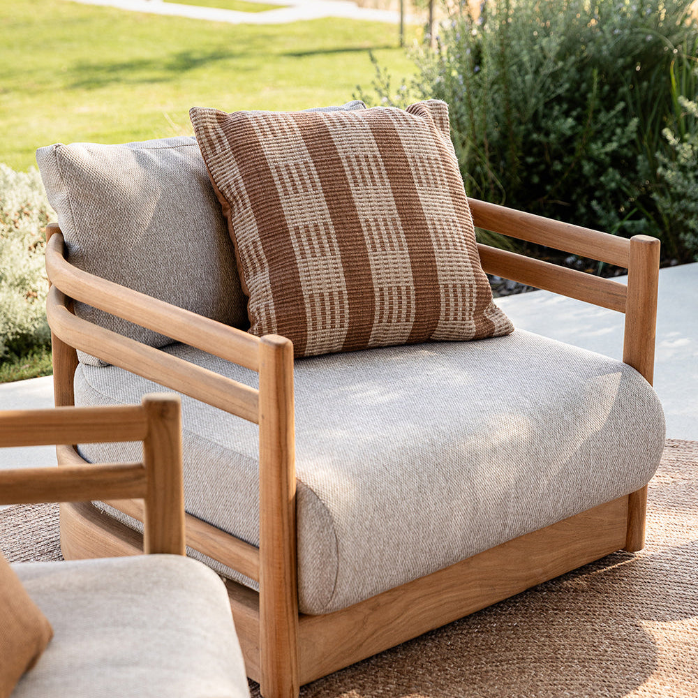 Featuring a two-tone ribbed design, bringing your interior style outdoors is explored with the artisan style of the Orion Cushion. Crafted from warm tobacco and cumin tones, the woven pattern creates a crafted ambience, bringing a calm, nurturing quality to exterior spaces. Pair with tobacco tones to create a warm, desert-inspired look.