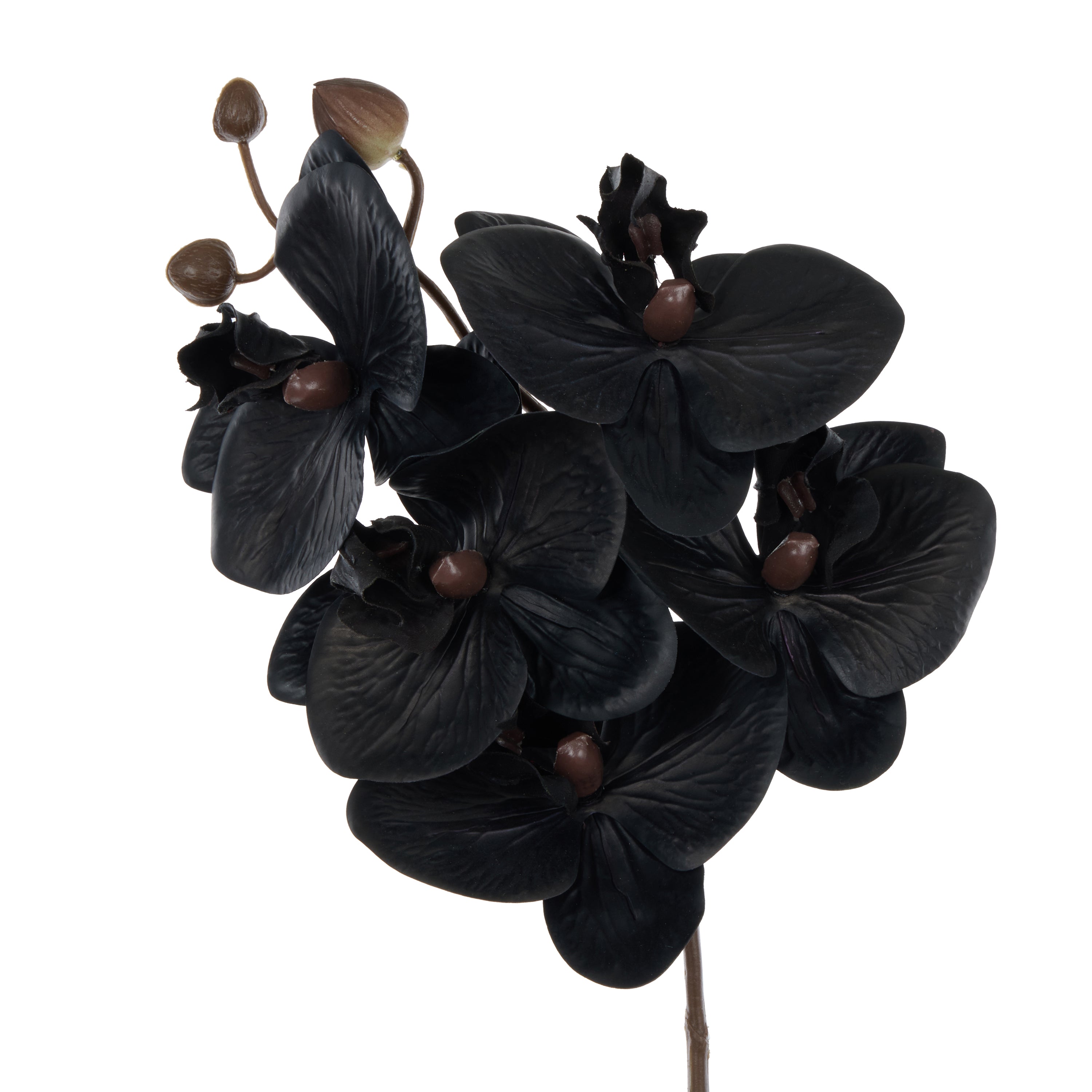 The Phalaenopsis Stem in black features striking black petals and a sturdy green stem, measuring 56cm. Ideal for adding a bold touch of colour, it can enhance floral arrangements or stand alone as a stylish home accent.