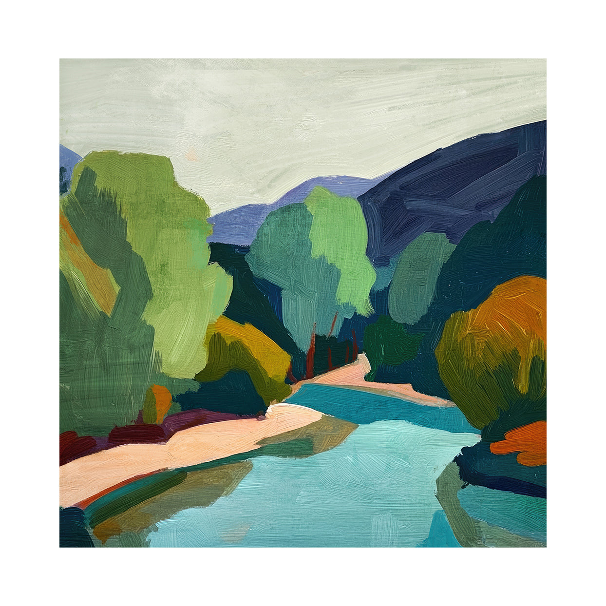 Immerse yourself in this striking abstract canvas that captures the essence of a riverside landscape. Vibrant greens and blues dance across the composition, beautifully offset by warm beige and orange tones that evoke the glow of natural light. The impressionistic style creates movement and emotion, transforming your space with artistic depth. This framed canvas measures 100x100cm, making a bold statement on any wall. Perfect for those seeking contemporary art that inspires conversation and contemplation.