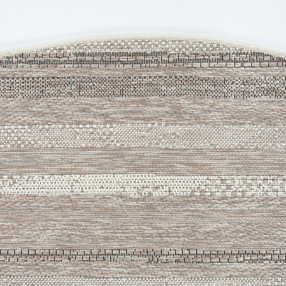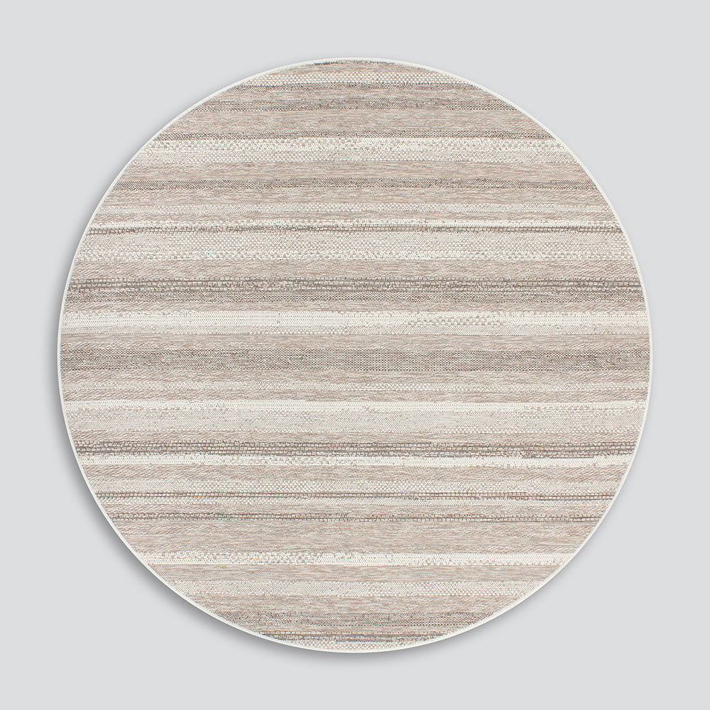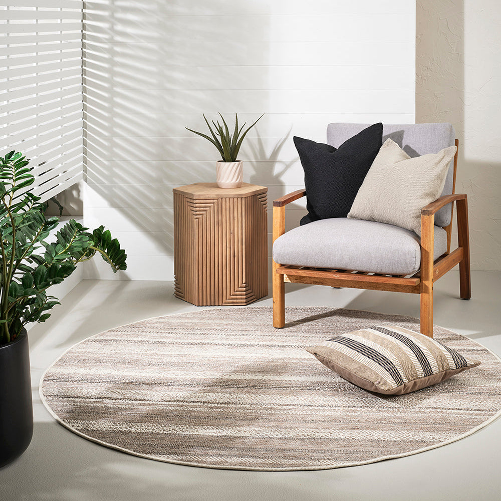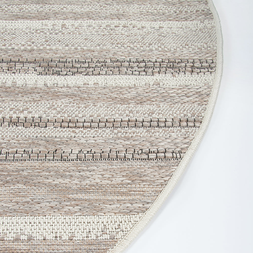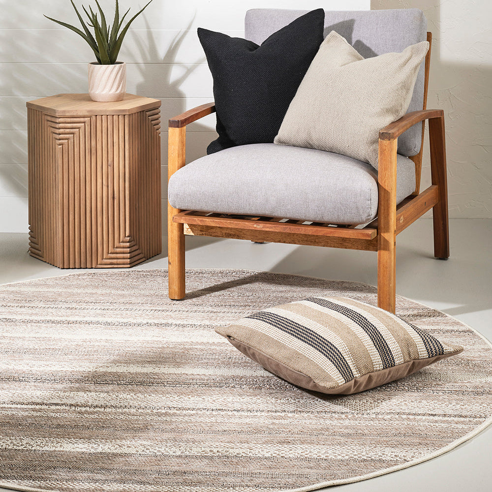 The subtle texture, abstract design, and monochromatic colouring of St Ives, make this round, flatweave floor rug a timeless addition to any outdoor living space.