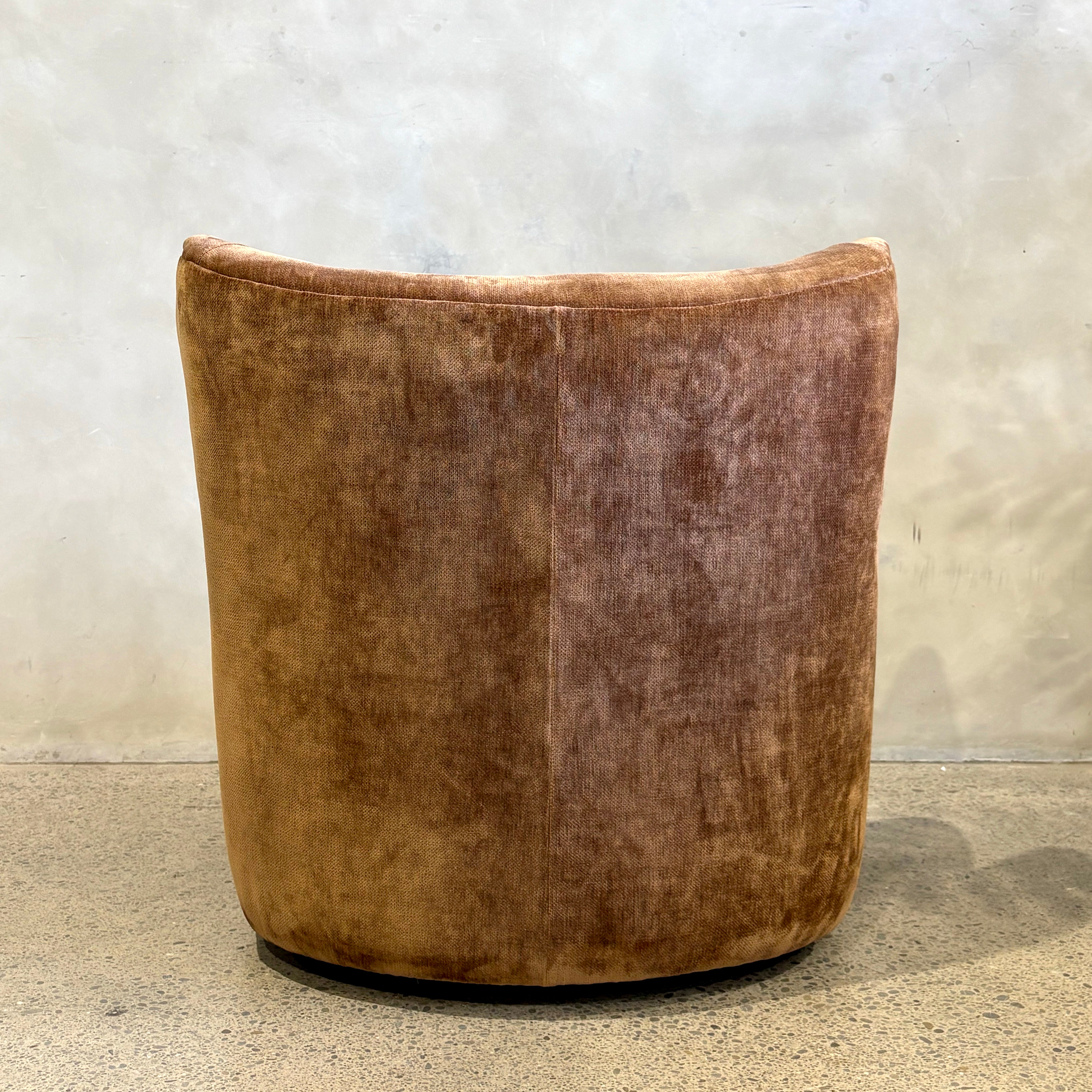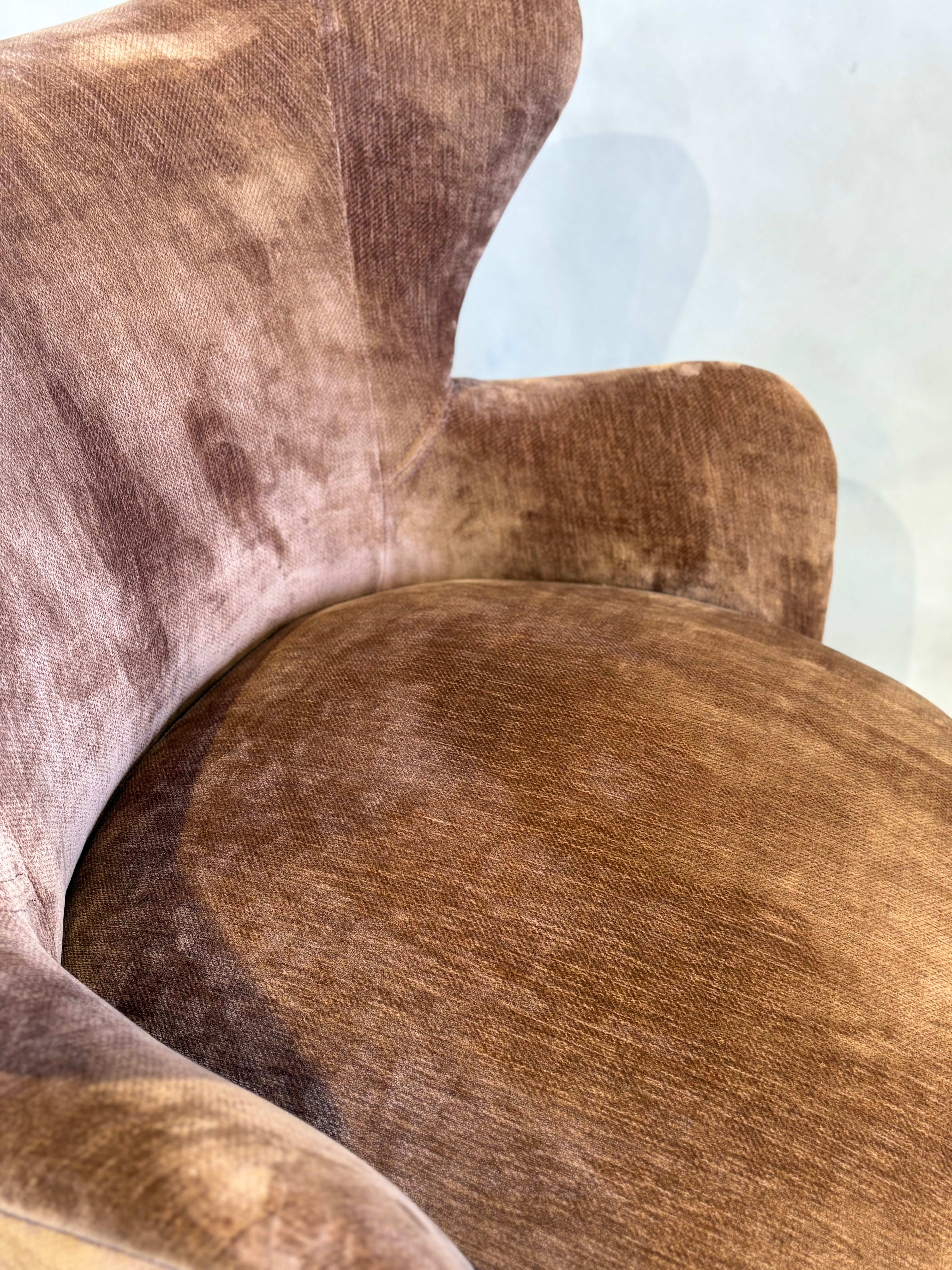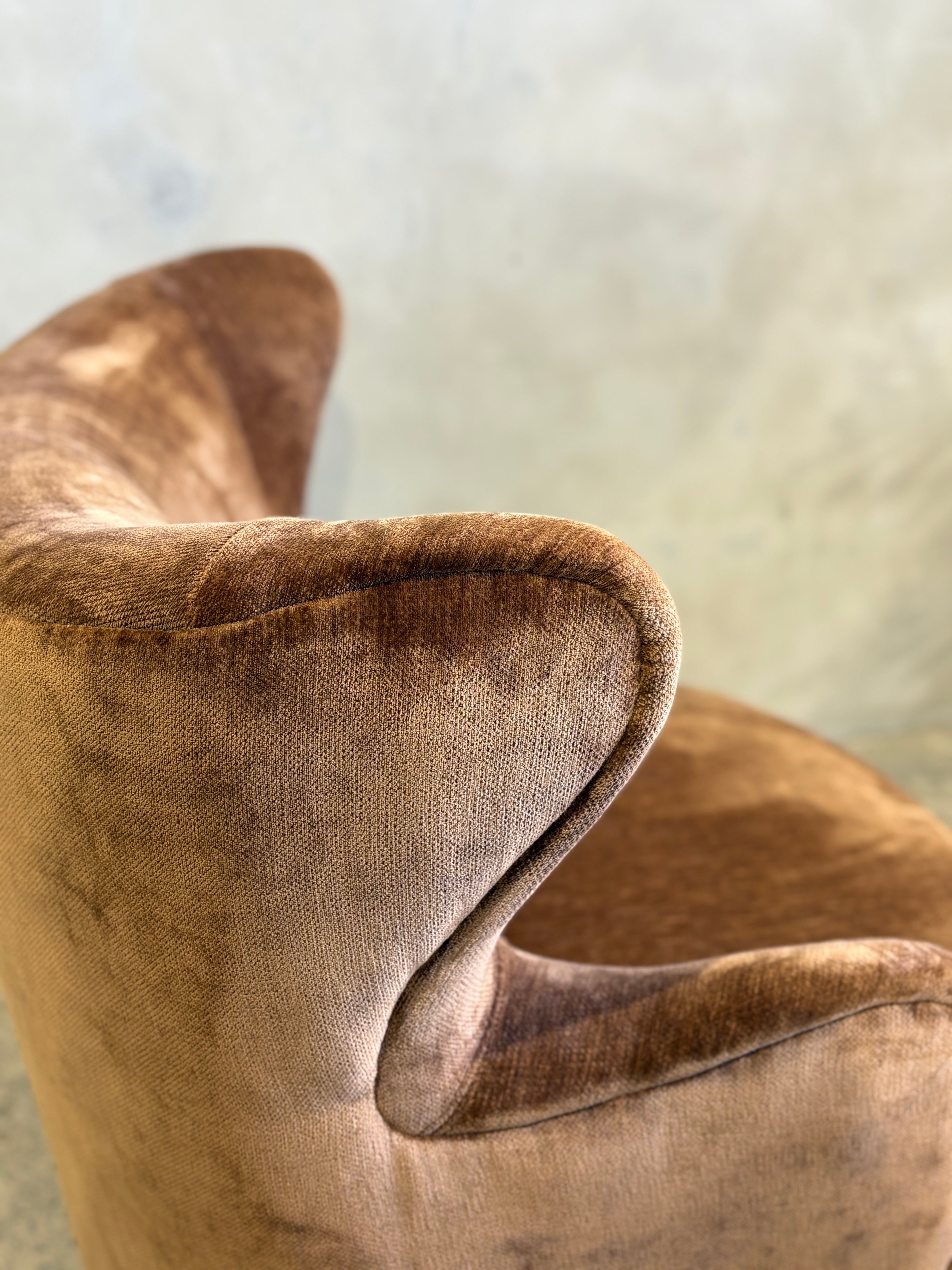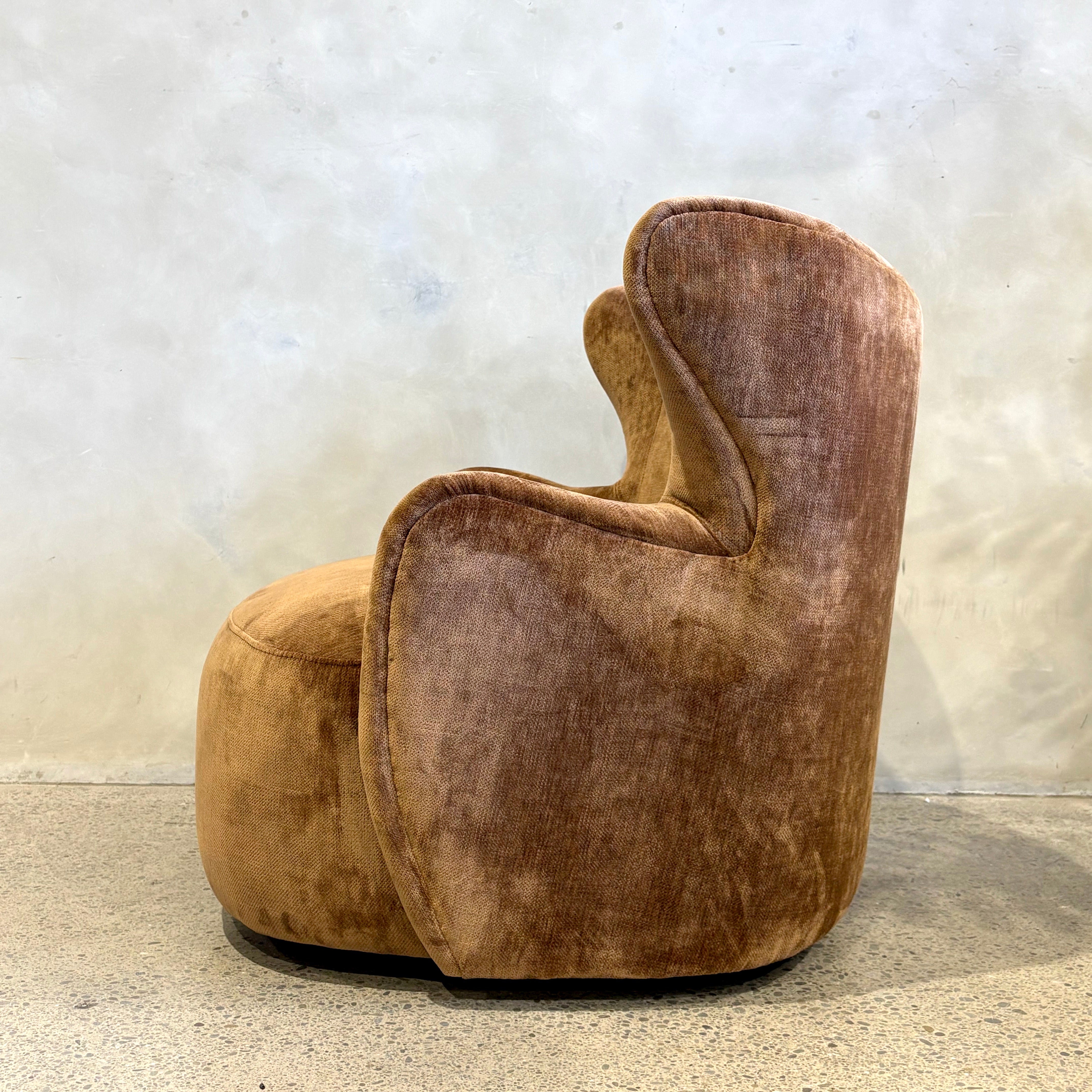 Petite perfection – introducing the Wing Swivel Chair. Taking inspiration from mid-century modern design, the Wing features a modernist take on the traditional wingback shape with a curved round silhouette, finished in a luxurious textured velvet in rich caramel bronze.